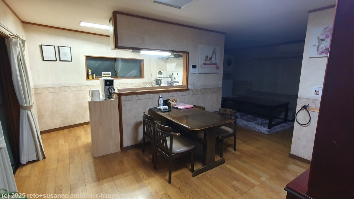 gegen 15:30 uhr erreichen wir unser tagesziel nakatsugawa. da unsere unterkunft keine parkplätze anbietet, parkieren wir unseren wagen beim einkaufszentrum valor ganz in der nähe. von da marschieren wir erst zur unterkunft. wir haben etwas mühe, diese zu finden, denn wir haben bloss einen namen in japanischer schrift. in der email mit der reservationsbestätigung gibt es zwar einen link zur wegbeschreibung, aber der eingang ist so unscheinbar, dass wir erst daran vorbeigehen. schliesslich haben wir das haus gefunden. an der tür steht, dies sei ein unbedientes gasthaus, die zugangcodes für den haupteingang und die zimmertüre würden einem per email zugestellt. tatsächlich finde ich im posteingang eine nachricht von dieser unterkunft mit den zahlenkombinationen. das zimmer ist schlicht aber schön und zweckdienlich.