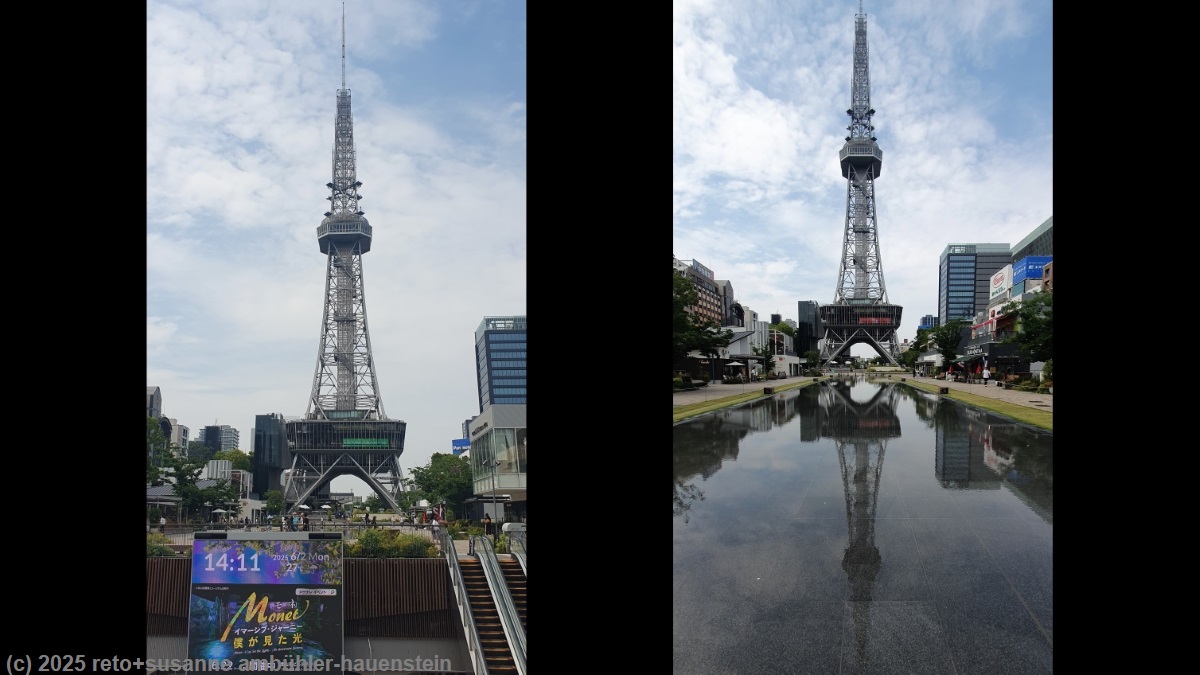 obwohl es früh am morgen plötzlich ziemlich unruhig wurde im haus, sind wir beim frühstück vermutlich die einzigen in der unterkunft. wir verlassen nakatsugawa kurz nach 09:15 uhr. in der stadt hat es ziemlich viel verkehr, aber die fahrt über die autobahn ist sehr entspannt. in nagoya kommen wir trotz der vielen autos gut zum autoverleih mitten im stadtzentrum. die rückgabe des nissans ist rasch erledigt. wir deponieren unser gepäck im hotel und beziehen danach im bahnhof die fahrkarten für die morgige weiterreise. vom JR tower haben wir ein erstes mal eine schöne aussicht auf die stadt. danach marschieren wir zum science museum und picknicken im schatten der bäume. durch den hisaya odori park gelangen wir zum TV turm. hier hat es 90 m über dem boden eine aussichtsplattform, von der wir wiederum eine tolle aussicht über die riesige stadt haben. nach einer kurzen erfrischung besuchen wir den honmaru palast und bewundern die zahlreichen kunstvollen malereien. nach einem spaziergang rund ums schloss fahren wir mit der metro zurück zum bahnhof. im hotel erfrischen wir uns unter der dusche und ich ruhe mich etwas aus. um 18 uhr machen wir uns auf den weg zum towers plaza, wo wir das nachtessen geniessen. danach besuchen wir das starbucks cafe und haben zum dritten mal heute eine wundervolle aussicht auf nagoya, diesmal bei nacht. zurück im hotelzimmer kaufen wir die fahrkarten für die reise von hakodate nach sapporo. gegen 23 uhr sind wir im bett.