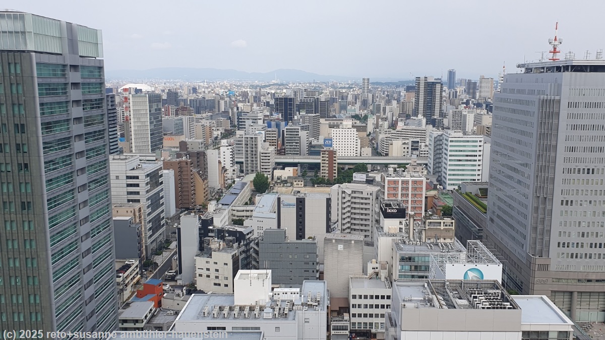 die nacht war relativ ruhig, aber ab 6 uhr wird es ziemlich laut. leute marschieren durchs haus und jemand trocknet sich unüberhörbar die haare mit einem föhn. als wir gegen 07:30 uhr aufstehen, sind wir erstaunlicherweise ganz alleine in der unterkunft. so können wir in der gemeinschaftsküche in ruhe frühstücken. danach packen wir unsere rucksäcke und marschieren zum parkplatz, auf dem unser wagen steht. die sonne scheint und es ist ziemlich warm. wir machen unser auto startklar, danach bezahlen wir die parkgebühr, welche uns mit JPY 1200 (ca. CHF 8) für zwei tage sehr günstig scheint. die anfahrt zur autobahn wird wie üblich durch dichten verkehr und unzählige ampeln verzögert. das ändert sich schlagartig, als wir auf die autobahn einfahren. es hat nur wenig verkehr, darunter bemerkenswert viele lastwagen. diese sind jedoch deutlich kleiner als was wir uns von zuhause und vorallem von deutschland gewohnt sind. die zügige fahrt wird durch einige baustellen mit einspuriger verkehrsführung nur geringfügig gebremst. das wetter bleibt freundlich, auch wenn nun mehr wolken aufziehen. als wir uns nagoya nähern, nimmt der verkehr zu. da wir eine erste ausfahrt verpassen, machen wir einen kleinen umweg. trotzdem erreichen wir das stadtzentrum gegen 10:30 uhr. am bahnhof vorbei nähern wir uns dem nissan autoverleih. doch bevor wir den wagen abgeben können, müssen wir ihn noch volltanken. danach schaffen wir auch noch den letzten kilometer unbeschadet. die abgabe des wagens verläuft unkompliziert. während das auto bei der übernahme sehr gründlich angeschaut und jeder kleinste kratzer vermerkt wird, interessiert bei der abgabe bloss, ob der tank voll ist. wir sind mit dem kleinwagen sehr zufrieden. für 806 km haben wir 36.8 l benzin verbraucht, das sind 4.6 l pro 100 km. dafür haben wir umgerechnet CHF 39 bezahlt. wir marschieren mit unserem gepäck zum nahen hotel, welches wir schon von unserem besuch vor zehn tagen kennen, und deponieren unsere rucksäcke. auch wenn eine dünne wolkenschicht den himmel bedeckt, so ist es mit 27°C sehr warm. wir gehen als erstes zum bahnhof und trinken etwas, ich esse dazu eine kleinigkeit. danach beziehen wir an einem automaten unsere fahrkarten für die morgige zugsfahrt von hier via tokyo nach hakodate. das klappt zu unserer beruhigung hervoragend. nun haben wir noch einen guten halben tag zeit, nagoya zu erkunden. als erstes fahren wir mit dem aufzug in den 15. stock des JR towers. von hier haben wir einen schönen ausblick auf die stadt.