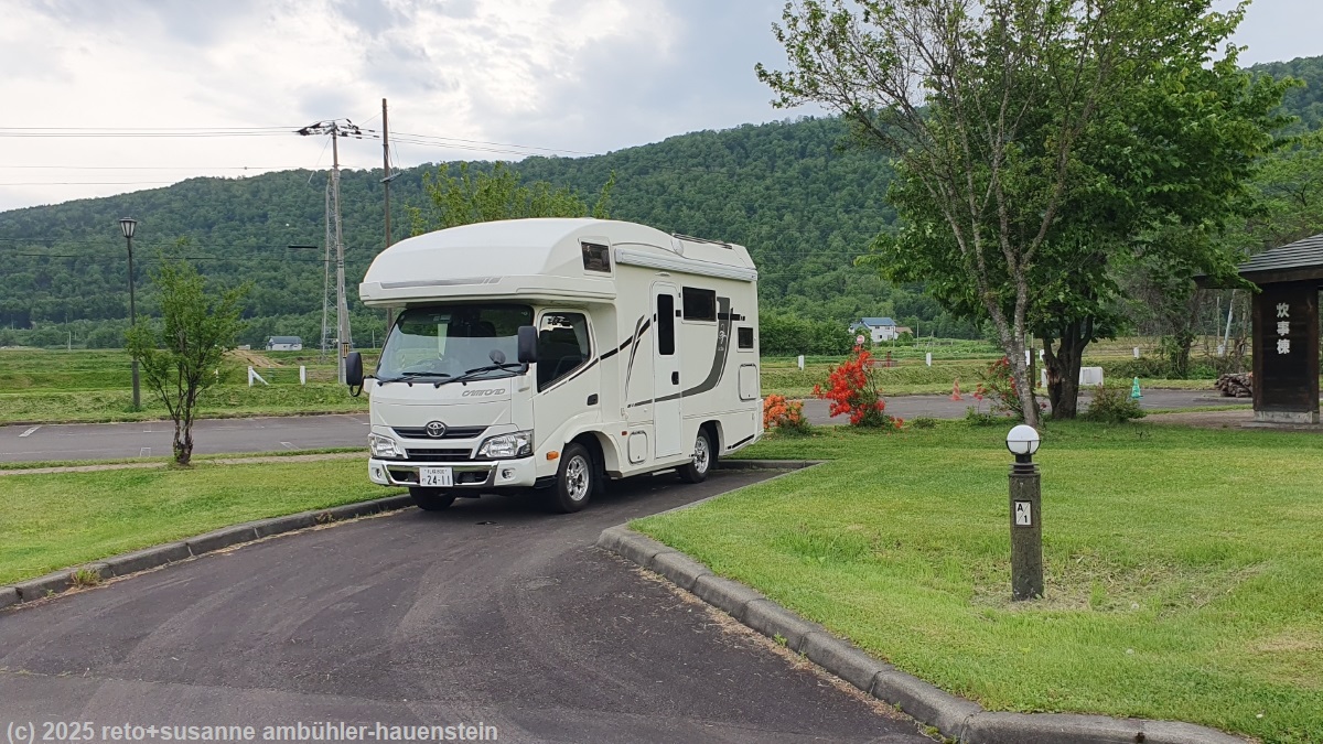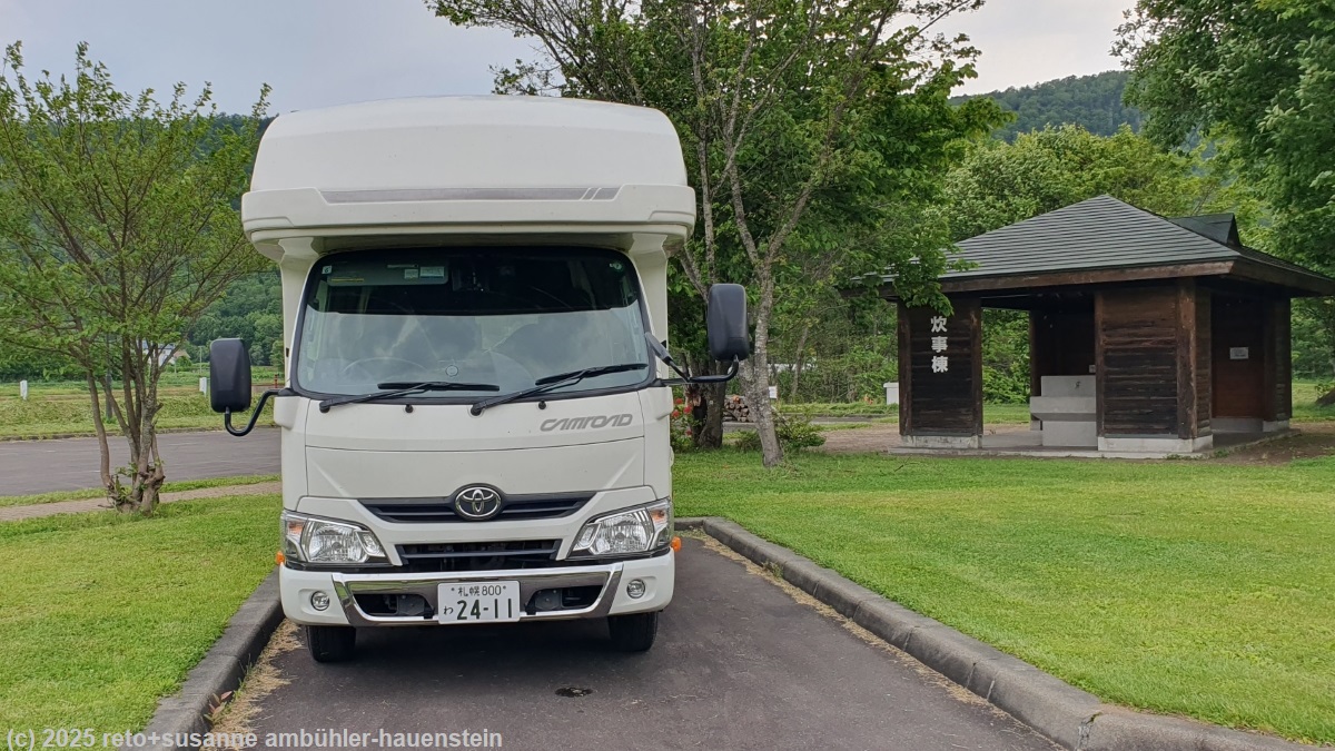 wir stehen um 07:30 uhr auf und geniessen noch einmal das reichhaltige frühstücksbuffet im bankettsaal. kurz vor 10 uhr treffen drei mitarbeitende der firma kegani camp mit unserem mietcamper ein. wir erhalten eine sehr höfliche und äusserst detaillierte einführung in die handhabung des fahrzeuges und der einrichtungen. etwas beunruhigend ist die lange liste der von der versicherung ausgenommenen schadenfälle. wir werden uns mit allen mitteln bemühen, keine schäden zu verursachen. um 11:30 uhr machen wir uns auf den weg. noch in sapporo erledigen wir den grosseinkauf an lebensmittel. einmal mehr kämpfen wir mit den navis, die einfach nicht die autobahn benutzen wollen. schliesslich folgen wir den wegweisern und gelangen so endlich auf die E5 nordwärts richtung pippu. ein heftiger und böiger seitenwind macht mir vorallem zu beginn der fahrt zu schaffen. auf einem rastplatz picknicken wir im wagen. die weiterfahrt verläuft problemlos und so schaffen wir es rechtzeitig zur aibetsu auto campsite. der campingplatz ist sehr schön, aber fast leer. susanne kocht ein leckeres nachtessen - es geht nichts über eine vertraute küche. nach dem duschen unterhalten wir uns per videoanruf mit unserem ältesten und erfahren, dass es zuhause allen gut geht. gegen mitternacht schlüpfen wir in die schlafsäcke.