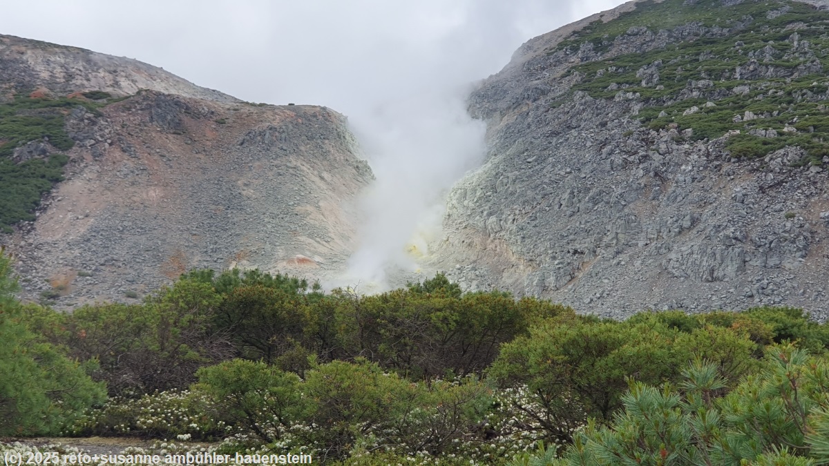 in der nähe des rest houses hat es mehrere stellen, an welchen dampf aus dem boden steigt. das gestein zeigt die typische gelbe farbe von schwefel. wir spazieren ein kurzes stück über den tsutsujigahara nature trail richtung kawayu visitor center, dann bewundern wir noch die dampfenden fumarolen.