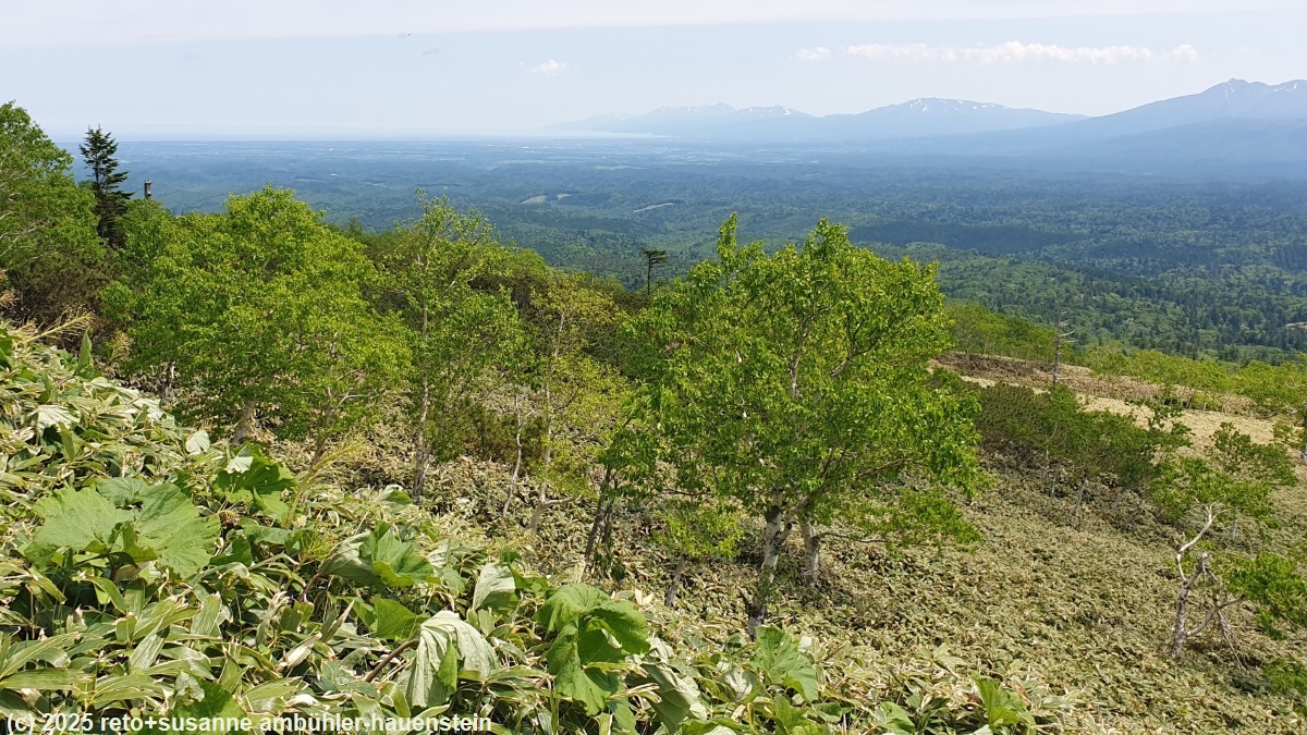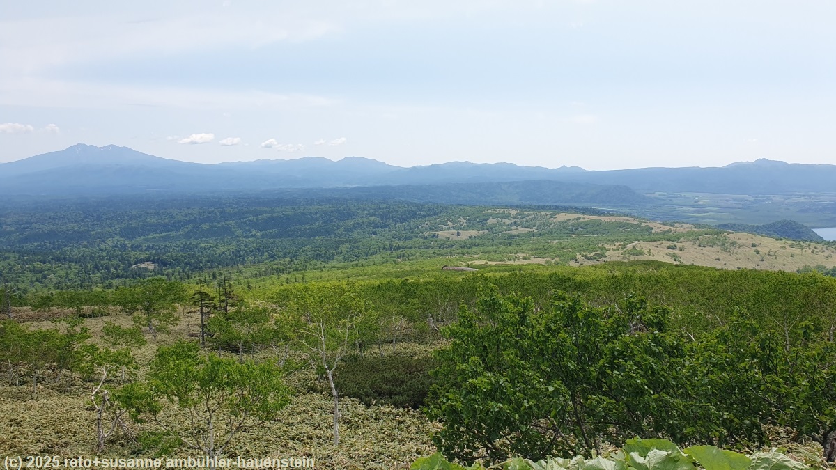 unser handy weckt uns um 07:30 uhr. die nacht war ruhig, wir haben gut geschlafen. als wir aus dem fenster schauen, begrüsst uns der vorhergesagte sonnenschein, das ist sehr erfreulich. nach dem frühstück packen wir zusammen und machen uns auf den weg zum highland koshimizu trailhead im akan-mashu nationalpark, dem ausgangspunkt unserer heutigen rundwanderung, siehe auch karte und broschüre. die anfahrt verläuft sehr entspannt, es hat auch heute kaum andere fahrzeuge auf der strasse. die letzten kilometer auf der strasse 102 sind kurvenreich. auf dem parkplatz stehen erstaunlich viele autos. schon von hier hat man eine fantastische aussicht, nicht nur auf den lake kussharo, sondern von der küste inklusive der shiretoko halbinsel bis weit ins landesinnere mit den bergen im süden.