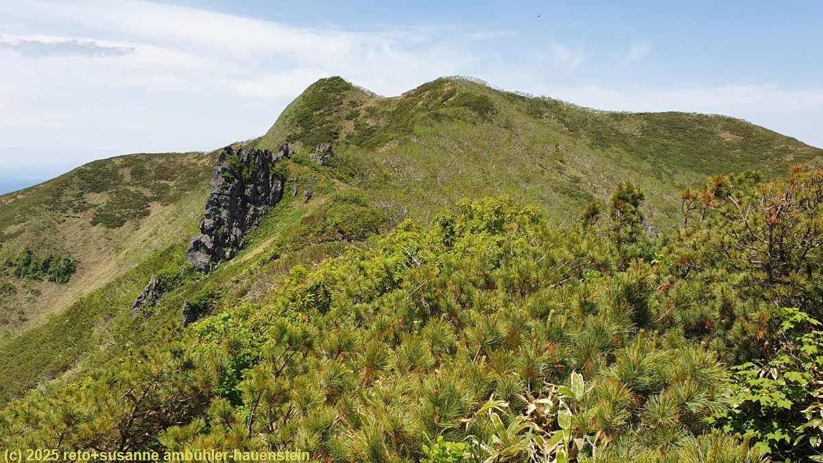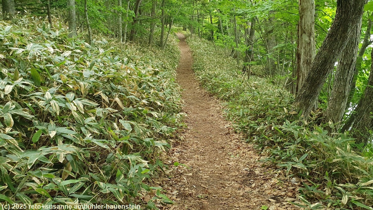 gemäss wetterbericht ist es 20°C, aber es fühlt sich eher wie mindestens 25°C an. nach dem essen nehmen wir die zweite hälfte der rundwanderung in angriff. wieder geht es über einen schmalen pfad steil bergauf. bezüglich fernsicht kann der zweite abschnitt nicht mit dem ersten mithalten, aber wir marschieren wiederum durch einen sehr schönen wald. am ende des sakhalin fir trail entscheiden wir uns, dem weg richtung campingplatz zu folgen. wir sind neugierig, was dieser zu bieten hat. der highland koshimizu campground ist zur zeit noch geschlossen. der platz sieht aber toll aus. es hat grosse gebäude, in denen man vielleicht übernachten kann, aber auch sehr schöne parzellen für zelte und wohl auch für camper.