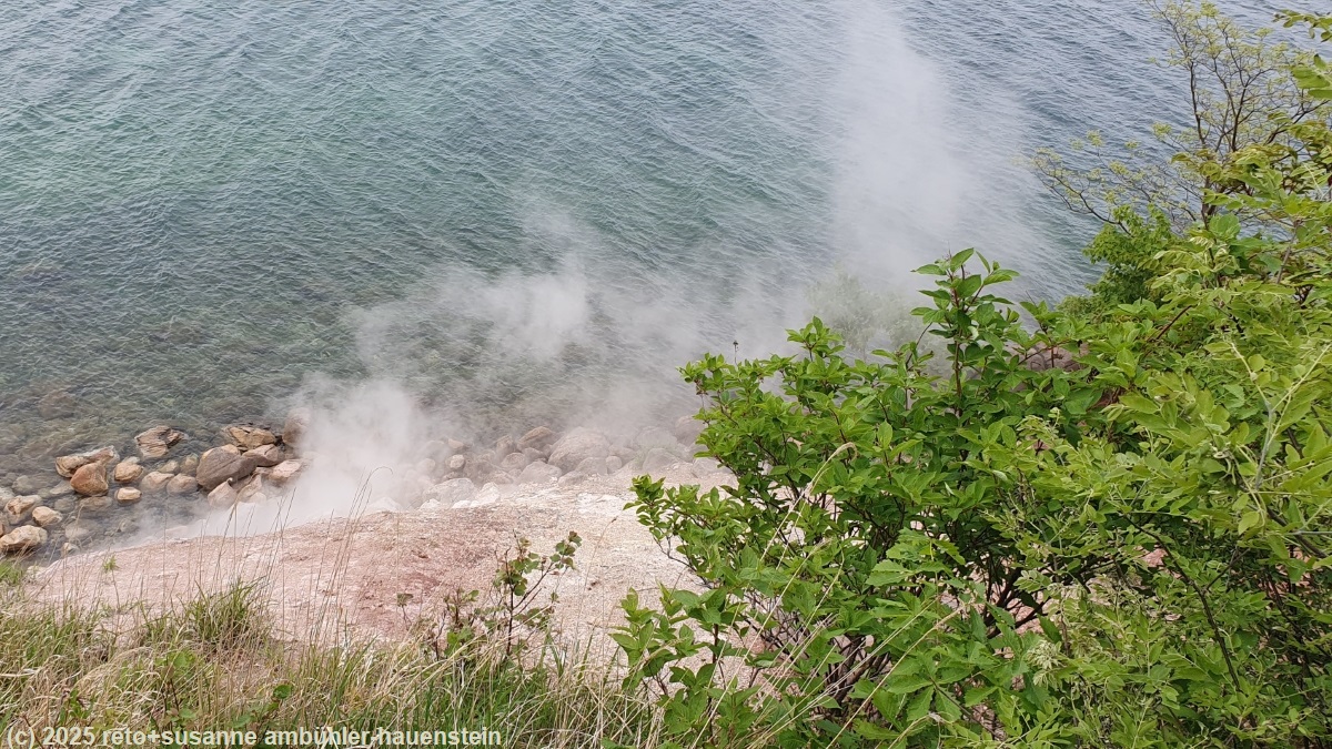 über einen wiederum sehr steilen pfad gelangen wir zurück zum parkplatz, auf dem unser wagen steht. im kleinen restaurant erfrischen wir uns mit kaffee und susanne kostet den kartoffelkuchen, eine lokale spezialität. es ist erst kurz nach 14 uhr, wir fahren deshalb noch zur halbinsel wakoto im süden des lake kussharo. dabei kommen wir, wie schon gestern, beim RECAMP sunayu vorbei. nun ist zwar der empfang beim eingang offen, aber der campingplatz wirkt unbenutzt. bei diesem häuschen kann man schaufeln mieten. wenn man im sand am ufer des sees ein loch gräbt, so füllt sich dieses mit warmem wasser, ganz wie bei der hot water beach auf neuseeland, siehe tagebuch vom 20-okt-2015 und folgende. es sitzt zwar niemand im sand, aber es hat noch einige mit wasser gefüllte löcher, die temperatur des wassers fühlt sich angenehm an. wir setzen unsere fahrt fort und erreichen gegen 15 uhr den parkplatz beim wakoto field house. beim onsen am seeufer sitzen einige menschen im warmen wasser. wir folgen dem wakoto nature trail im uhrzeigersinn. der weg ist weich und sehr angenehm zu begehen. er folgt mehr oder weniger dicht dem ufer und führt durch einen sehr schönen wald. am nördlichen ende der halbinsel steigen wir erst eine etwas mitgenommene treppe bergwärts, dann geht es auf einer neuen treppe wieder zum ufer hinunter. an einer stelle knapp über dem wasser tritt dampf aus dem boden. gemäss einer informationstafel ist der boden in diesem bereich so warm, dass der schnee im winter nicht liegen bleibt und die tiere deshalb hier das ganze jahr futter finden.