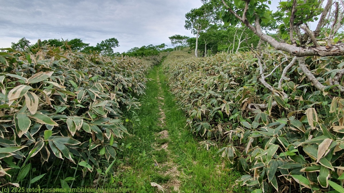wir nehmen den 7 km langen weg zum mount mashu in angriff. anfangs ist der pfad flach. der boden ist weich, der weg ist äusserst angenehm zu begehen und hat auch kaum unebenheiten. wir wandern abwechslungsweise durch offenes gelände und durch einen schönen wald. die bäume stehen manchmal sehr nah am wegrand und die untersten äste sind so tief, dass wir den kopf einziehen müssen. dann folgt ein erster grösserer aufstieg. nun wird auch der weg holpriger und steiniger. zu unserer linken sehen wir ab und zu auf den lake mashu hinunter. insbesondere beim rastplatz fusho-sogen haben wir eine tolle aussicht auf den see und den gegenüberliegenden kraterrand. wieder geht es erst über offenes gelände und dann durch einen schönen wald. bis knapp 300 meter vor dem gipfel ist es eine leichte wanderung, aber die letzten meter sind dann doch eine kleine herausforderung. es geht äusserst steil über stock und stein und wurzeln auf den 857 meter hohen gipfel hinauf. dieser ist ziemlich klein, auf allen seiten geht es steil hinunter. die rundsicht ist dafür gigantisch. das wetter wird zusehends freundlicher, bald scheint die sonne. allerdings bläst ein kräftiger wind. trotzdem picknicken wir auf dem gipfel.