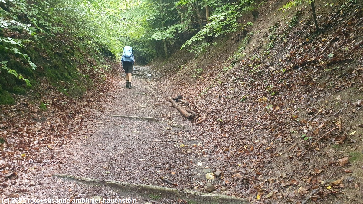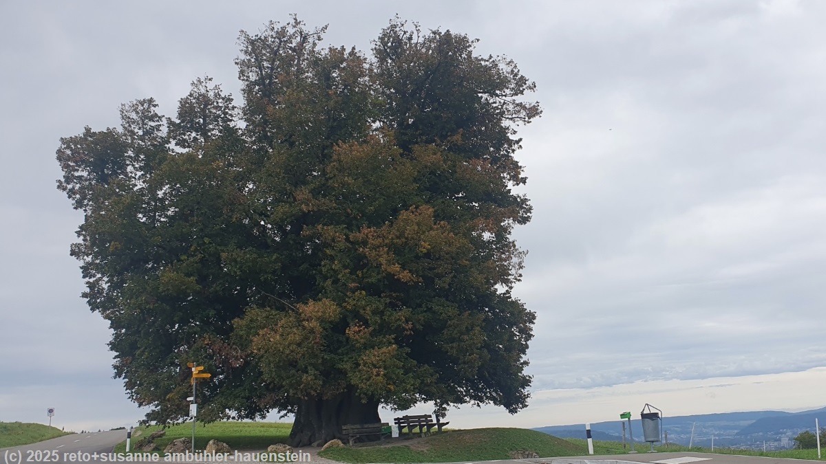 unser handy weckt uns um 07:30 uhr. die nacht war sehr ruhig und der schlaf äusserst erholsam. wir geniessen das reichhaltige frühstücksbuffet im selben restaurant, in welchem wir gestern zu abend gegessen haben. danach geht susanne brötchen einkaufen, während ich schon mal beginne, meinen rucksack zu packen. kurz vor 09:30 uhr machen wir uns auf den weg. die heutige route führt uns über die aare, ab da geht es für die nächsten knapp 10 km fast immer nur aufwärts. der einstieg ist ziemlich heftig, es geht teilweise über treppen steil bergauf. im wald flacht der weg etwas ab. vom hexenplatz haben wir eine schöne aussicht auf die altstadt von brugg. wir kommen gut voran, die beine machen brav mit und die füsse sind zum aushalten. bei riniken geht es durch ein wohnquartier. ein riesiger pneukran hievt gerade ein mächtiges stück baum auf die strasse. wir werden freundlich aufgefordert, die baustelle zu umgehen. nun geht es über offene felder richtung bözberg. wir sind dankbar für die kompakte wolkenschicht, an der prallen sonne würden wir noch viel mehr ins schwitzen kommen. nachdem wir die landstrasse 3 überquert haben, machen wir bei einer sehr schönen bank kurz rast. wir trinken etwas und essen einen stängel. wenig später wandern wir erneut durch einen schönen wald. gegen 11:45 uhr erreichen wir die mächtige linner linde. der stamm dieser linde soll gemäss diverser quellen einen umfang von 11 meter haben, ihr alter wird auf 700 bis 800 jahre geschätzt. wieder steigt der weg steil an. die letzten höhenmeter vor dem höchsten punkt des linnerberg haben es in sich, der weg ist schmal und sehr steil. dabei überqueren wir die autobahn A3, die tief unter uns in einem tunnel durch den bözberg führt. auf dem höchsten punkt picknicken wir auf einer der bänke.