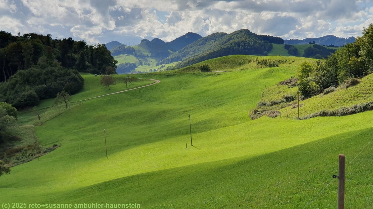 unser handy weckt uns um 07:30 uhr. im restaurant erwartet uns ein schönes buffet mit allem, was wir zum frühstück haben möchten. gut verköstigt gehen wir wieder aufs zimmer und packen unsere rucksäcke. in der nacht und auch am morgen hat es immer wieder kurze und teilweise heftige regengüsse gegeben. als wir kurz vor 09:30 uhr aufbrechen, hangen dunkle wolken am himmel und es fallen einige tropfen. die heutige etappe ist ein permanentes auf und ab. obwohl das tagesziel tiefer liegt als der startpunkt, müssen wir fast 770 höhenmeter bewältigen. nach einem kurzen flachen stück zu beginn, steigt der weg bald kräftig an. der aufstieg zur 963 meter hohen geissflue erfolgt in vier abschnitten. zuerst erklimmen wir das 674 meter hohe benkerjoch, dann geht es hinauf zur "uf der egg" auf 800 m.ü.m. wir gehen durch einen schönen wald, der aber nur selten den blick in die weite frei gibt. vorallem richtung westen haben wir ab und zu eine aussicht. das wetter bleibt wechselhaft, immer wieder fällt regen, manchmal etwas intensiver, aber immer nur für kurze zeit. um 11:30 uhr erreichen wir das waldgasthaus chalet saalhöhe.