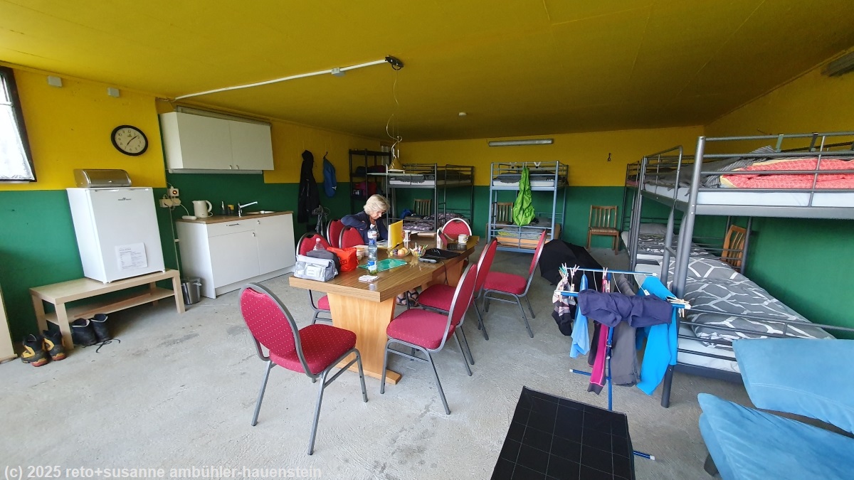 wir packen unsere rucksäcke aus und geniessen die dusche. um 18:30 uhr dürfen wir unser nachtessen in empfang nehmen. der salat und die käsewähe schmecken hervorragend. nach dem essen liest susanne, ich führe die bücher nach. da morgen eine lange und anstrengende etappe vor uns liegt, packen wir unsere sachen soweit als möglich und gehen zeitig zu bett.