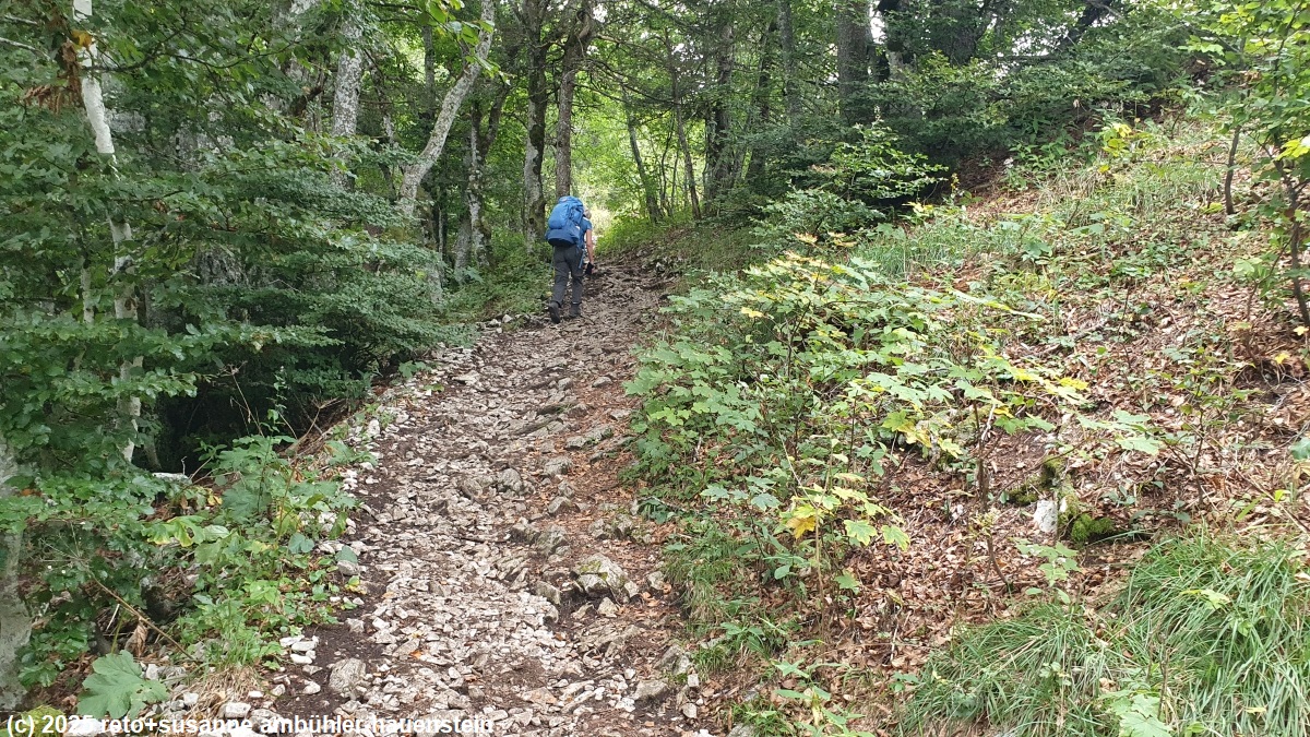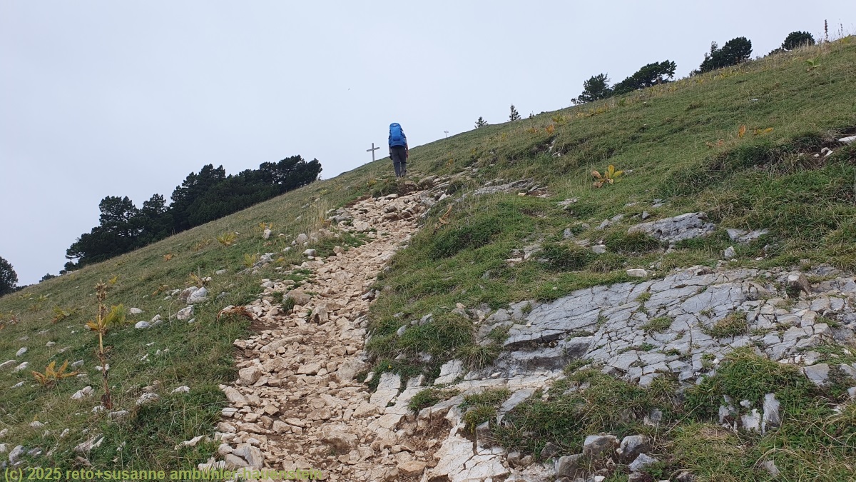 wir lassen uns wiederum um 7 uhr wecken. das frühstücksbuffet ist äusserst reichhaltig. wir dürfen an einem tisch am fenster sitzen. allerdings ist die aussicht eher trüb. bevor wir losmarschieren, verpflastern wir noch meine füsse. die ersten 3 km sind einfach zu begehen. wir wandern über feldwege mit meistens leichter neigung. das wetter ist weiterhin trüb und neblig. dann beginnt der ziemlich steile aufstieg zur hasenmatt. wir gehen meist durch dichten wald, gelegentlich auch über wiesen. am höchsten punkt befinden wir uns auf 1445 m.ü.m.