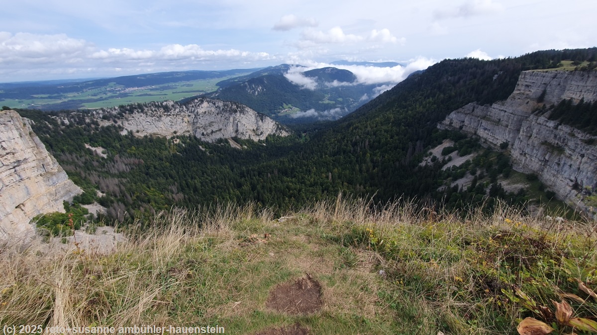 unser handy weckt uns um 07:30 uhr. wir haben wunderbar geschlafen. um 8 uhr sind wir im restaurant und geniessen das frühstück. für einmal gibt es kein buffet, sondern ein klassisches frühstück mit orangensaft, kaffee, tee, brot, butter und konfiture. kurz nach 9 uhr sind wir startklar. vor uns macht sich gerade eine grössere gruppe auf den weg. schon bald beginnt der lange und steile aufstieg zum creux du van. bei einer weggabelung steht ein grossteil der gruppe und wartet auf die nachzügler. unglücklicherweise lassen wir uns von den vielen menschen ablenken und bemerken nicht, dass diese wanderer gar nicht dem jura-höhenweg folgen. so erklimmen wir die ersten 300 höhenmeter nicht auf der vorgesehenen route, sondern auf einer forststrasse parallel zum höhenweg. bei les oeillons kommen die beiden wege wieder zusammen. nun windet sich der schmale pfad in vierzehn kehren weitere 400 meter den berg hinauf - passend heisst der aufstieg "sentier de 14 contours". die ersten kehren sind weit voneinander entfernt, doch je höher wir kommen, desto rascher folgen sich die kehren. um 10:50 uhr erreichen wir den rand des creux du van. damit sind wir aber noch nicht auf dem höchsten punkt angelangt. der krete entlang steigt der weg weiterhin an. die aussicht auf die halbrunde felswand, aber auch ins tal richtung neuenburgersee - welcher wegen den wolken allerdings nicht zu sehen ist - und ganz besonders ins vallée des ponts ist atemberaubend. immer wieder stoppen wir bei einem weiteren aussichtspunkt und machen nochmals einige bilder. nachdem wir die hälfte des creux du van umgangen haben, zweigt der weg nach rechts ab.