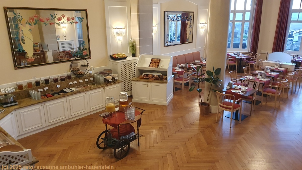 das frühstücksbuffet im "salle chandelier" ist einem grand hotel würdig. das angebot umfasst alles, was wir uns zum frühstück wünschen und noch viel mehr. neben saft und müesli gibt es unter anderem eine reichhaltige auswahl an brot - selbst zopf, obwohl heute montag ist.