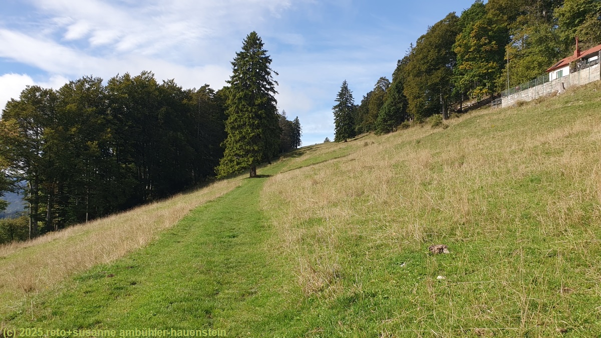daher freuen wir uns auf einen kaffee auf der windgeschützten terrasse des restaurant le dent de vaulion. dazu gibt es ein stück köstlichen heidelbeerkuchen. nun sind es weniger als 6 km bis zum tagesziel. der abstieg bis pétra félix ist etwas holprig aber gut zu bewältigen. bei der landstrasse 130 wendet der weg. bis hierher werden wir morgen den selben weg in entgegen gesetzter richtung gehen müssen. auf einem feldweg geht es mit leichtem gefäll durch weideland.