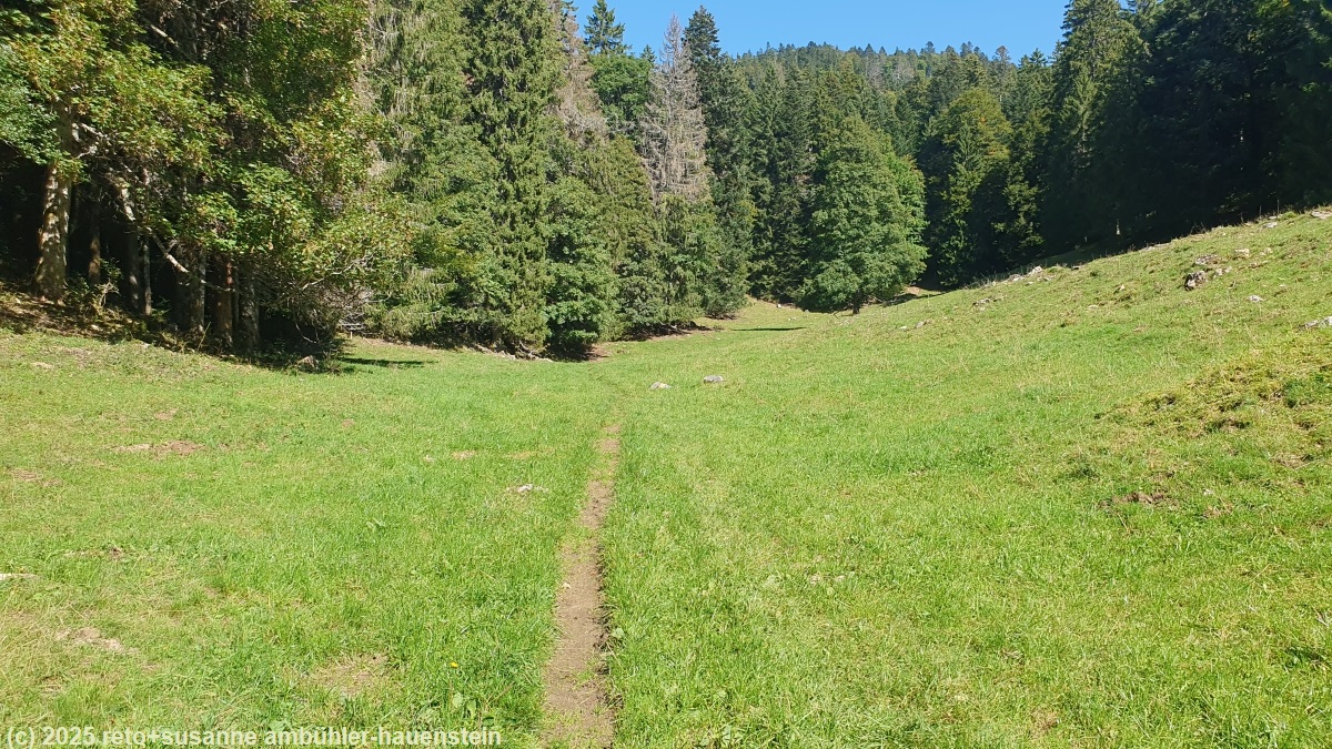 40 minuten später brechen wir wieder auf. es folgt nun ein längerer abstieg. der pfad verläuft vorwiegend in angenehm schattenspendenem wald, gelegentlich wandern wir aber auch über offenes weideland. die temperatur übersteigt die 20°C marke deutlich, wärmer braucht es von uns aus nicht zu werden. bei den ruines du couvent d'oujon erreichen wir den tiefsten punkt. der weg steigt noch einmal fast 90 höhenmeter an, bevor wir definitiv zu unserem tagesziel hinunter marschieren.