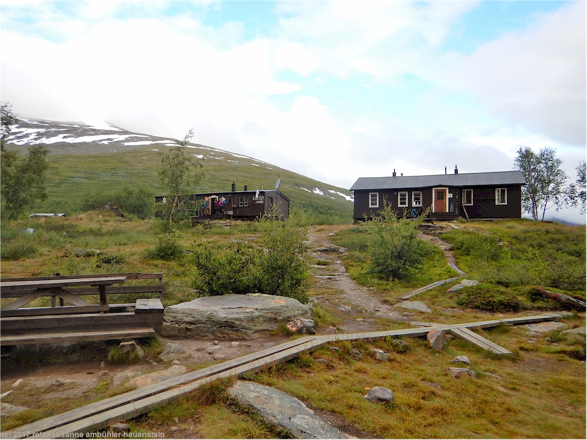 kurz nach 18 uhr erreichen wir unser ziel, die vakkotavare fjällstation, die hüttenwartin begrüsst freundlich. wir sind glücklich, unser abenteuer so problemlos überstanden zu haben und auch ein wenig stolz auf unsere leistung. in den letzten fünf tagen haben wir 111.4 km zurückgelegt und dabei 2586 höhenmeter überwunden. als wir die wanderung planten, dachte ich erst, 20 bis 25 km pro tag seien kein problem für uns. als ich dann die routen und vorallem auch die höhenprofile anschaute, hatte ich plötzlich doch bedenken, ob die teilweise über 30 leistungskilometer - distanz plus 1 km pro 100 höhenmeter - nicht doch etwas zu viel wären für uns. allerdings hätten wir die längeren etappen ja auch in zwei tagen machen können, weil es jeweils in der mitte eine fjällstation hat. nun hat sich gezeigt, dass wir diese strecken problemlos meistern können, selbst mit den relativ schweren rucksäcken.