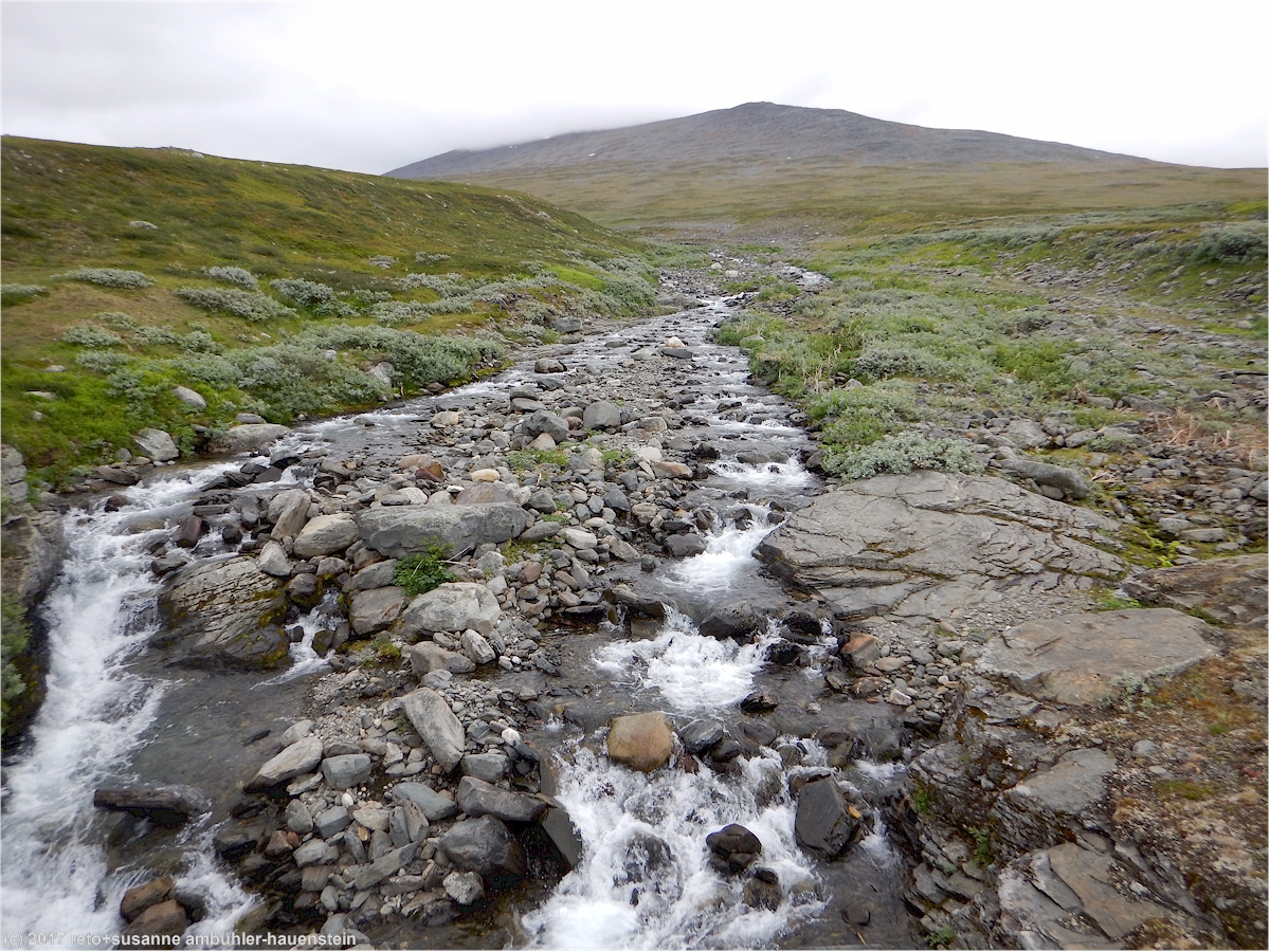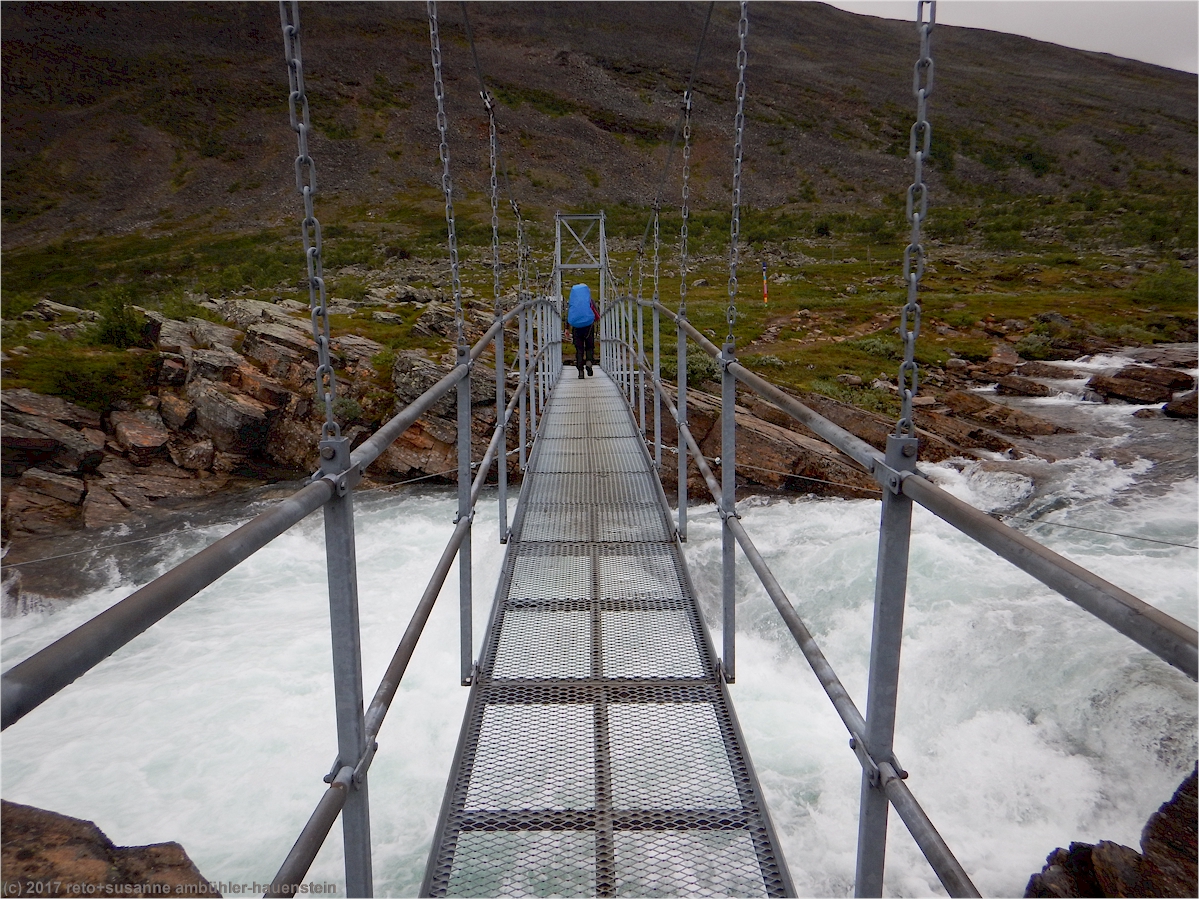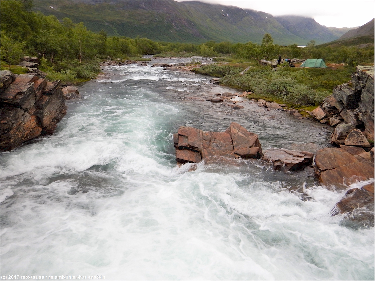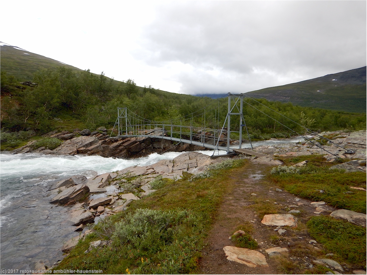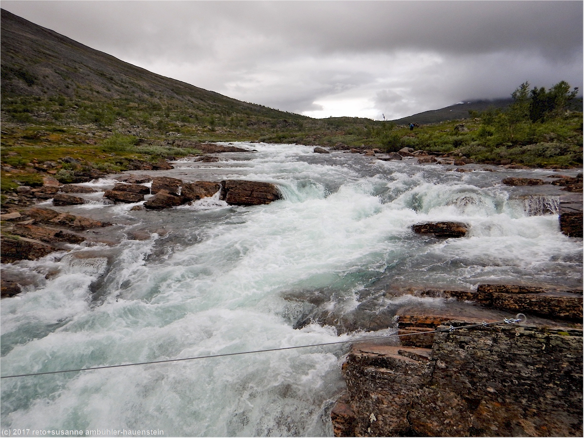 nach gut 20 minuten erreichen wir die brücke über den kaitumjåkka. der fluss führt viel wasser, wohl eine folge des nächtlichen regens. blickt man flussaufwärts, hat es immer noch viele dunkelgrau wolken. am flussufer sehen wir ein grünes zelt und zwei personen, die vermutlich eine recht nasse nacht hinter sich haben.