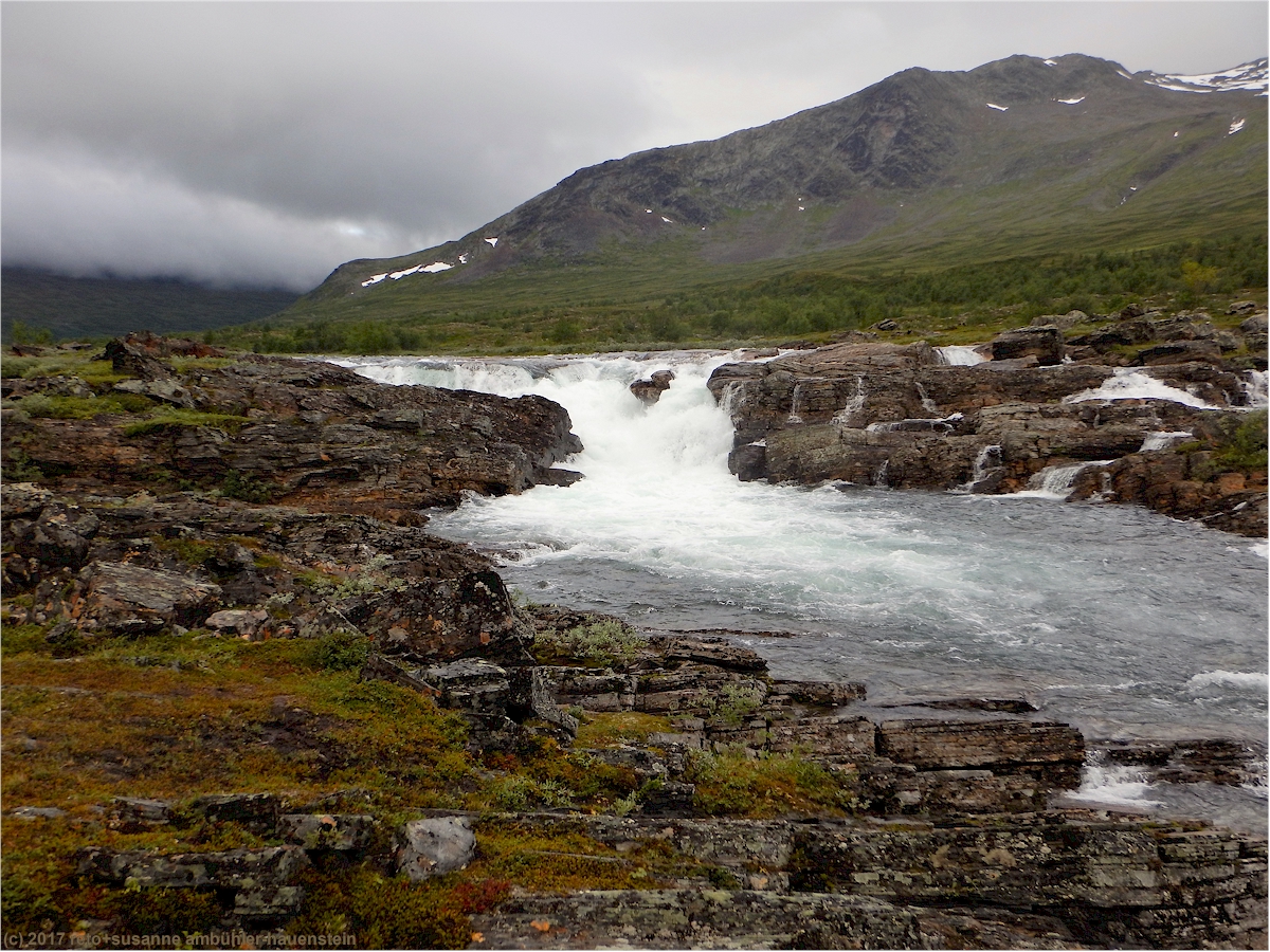 | wasserfall im lauf des kaitumjåkka | rentierzaun im tal des kaitumjåkka |