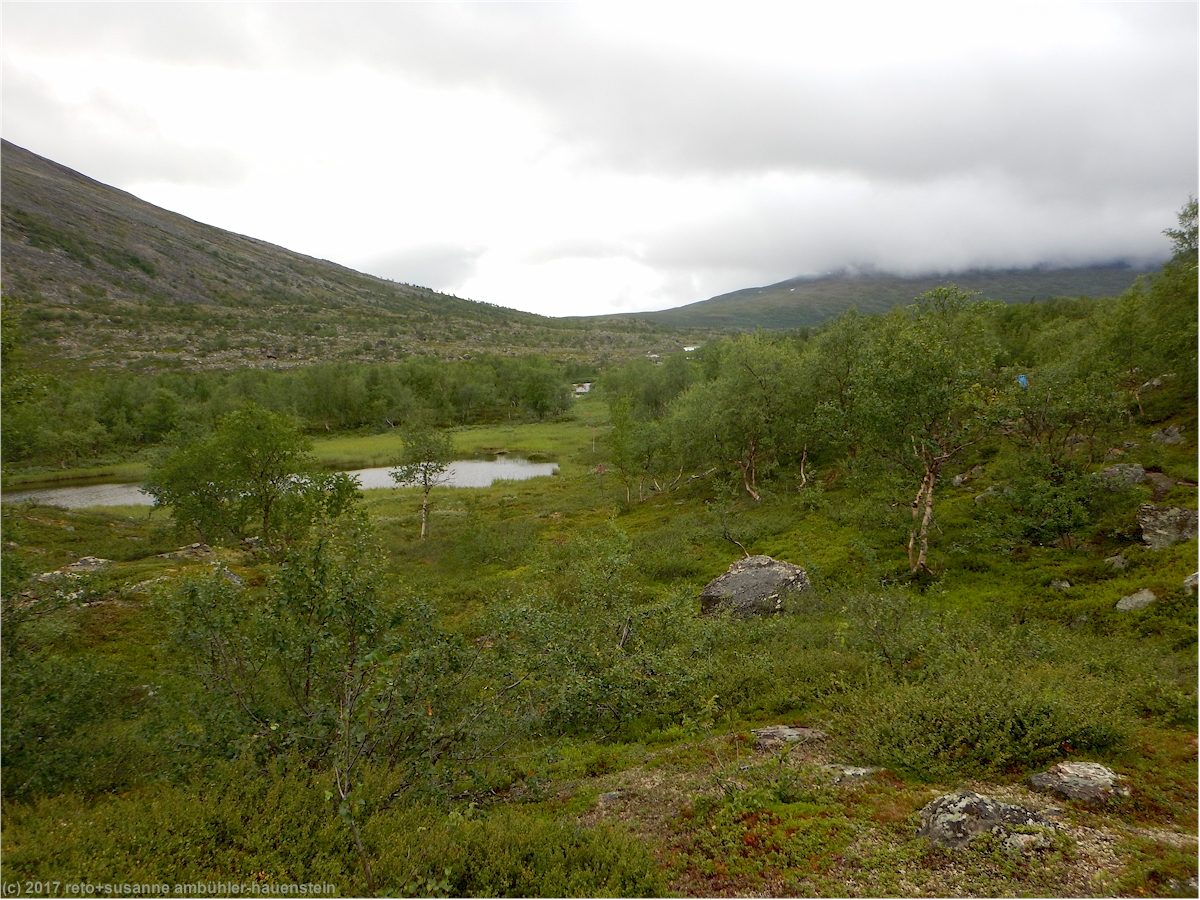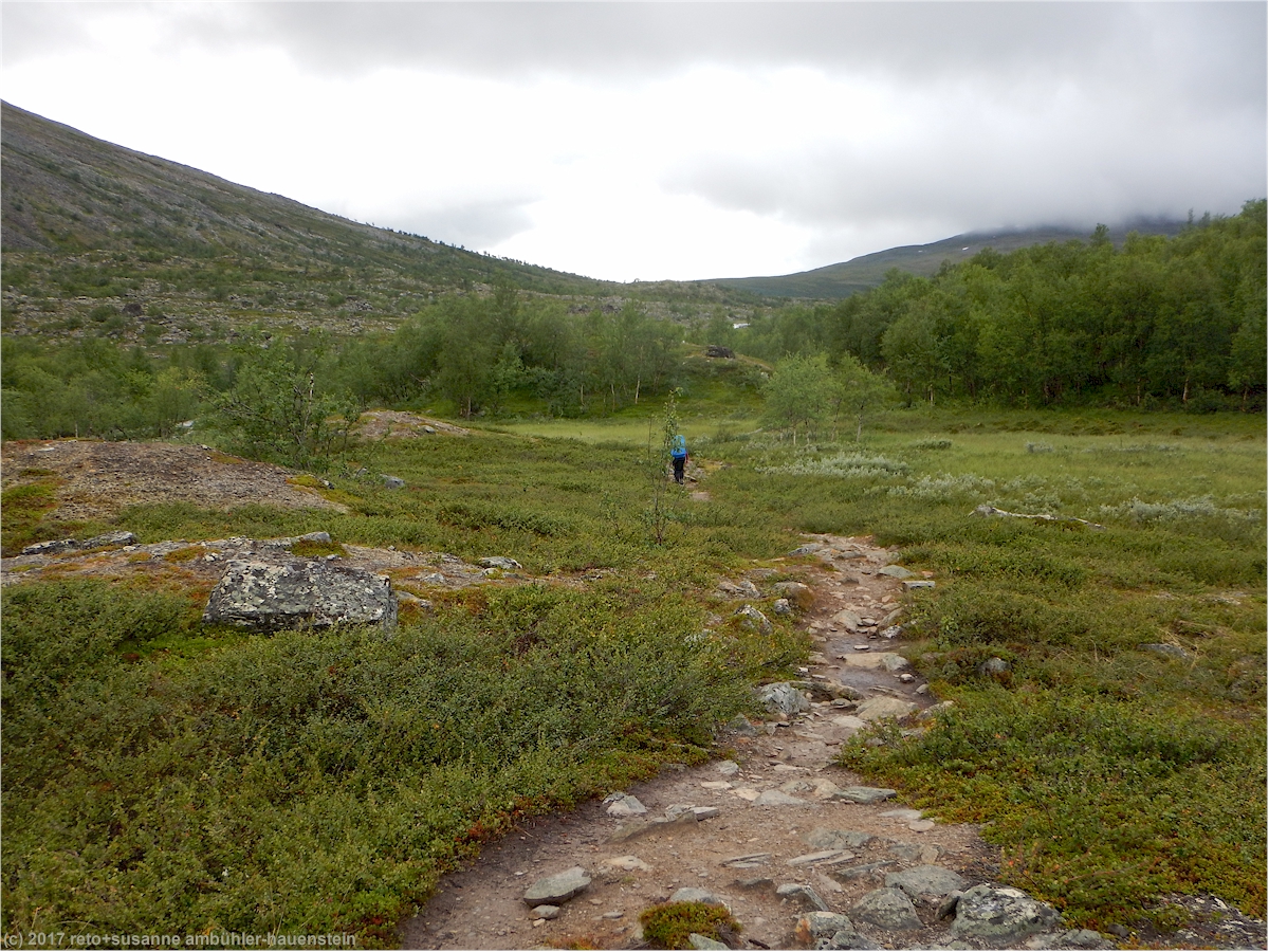anfangs führt der weg durch einen birkenwald mit vielen mücken. wir befinden ins nördlich des kaitumjåkka, der boden ist sehr sumpfig, das gefällt natürlich diesen kleinen biestern. allerdings bieten wir den mücken mit unseren regenjacken und langen hosen wenig angriffsfläche.