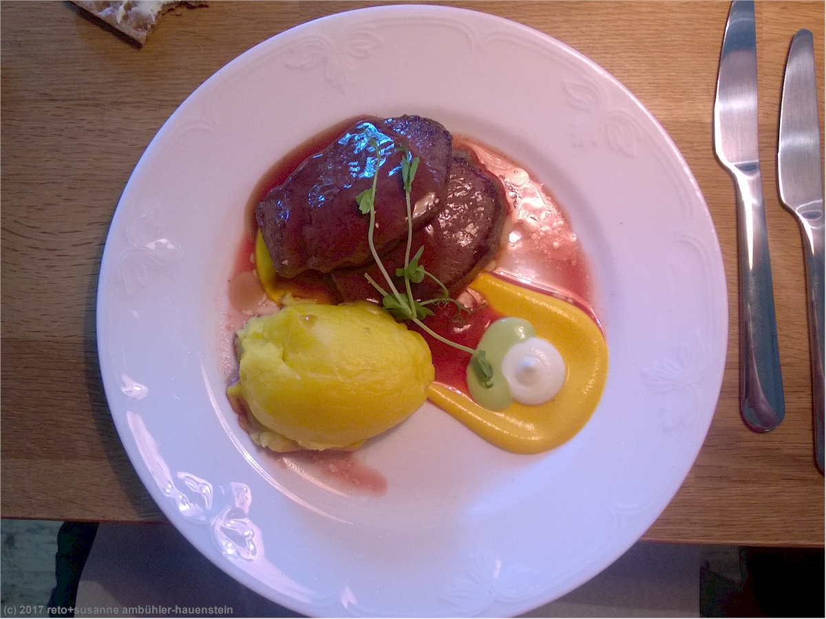 wir wechseln die schuhe und fahren zum nahen campingplatz des stora sjöfallets nationalparks, da wo wir schon vor unserer wanderung die letzte nacht im joker verbracht hatten. wir haben sogar das glück, dass die sauna noch frei ist, zumindest bis 20 uhr. so dürfen wir noch einmal diese wunderbare einrichtung geniessen. erholt und frisch geduscht setzen wir uns in das schöne restaurant des campingplatzes. die speisekarte ist ausgesprochen schwedisch, es gibt im wesentlichen fisch, rentier- und elchfleisch. das scheint uns für diesen ort auch absolut angemessen. wir entscheiden uns für ein niedergegartes rentierfilet mit kartoffelpüre, das schmeckt ausgezeichnet.