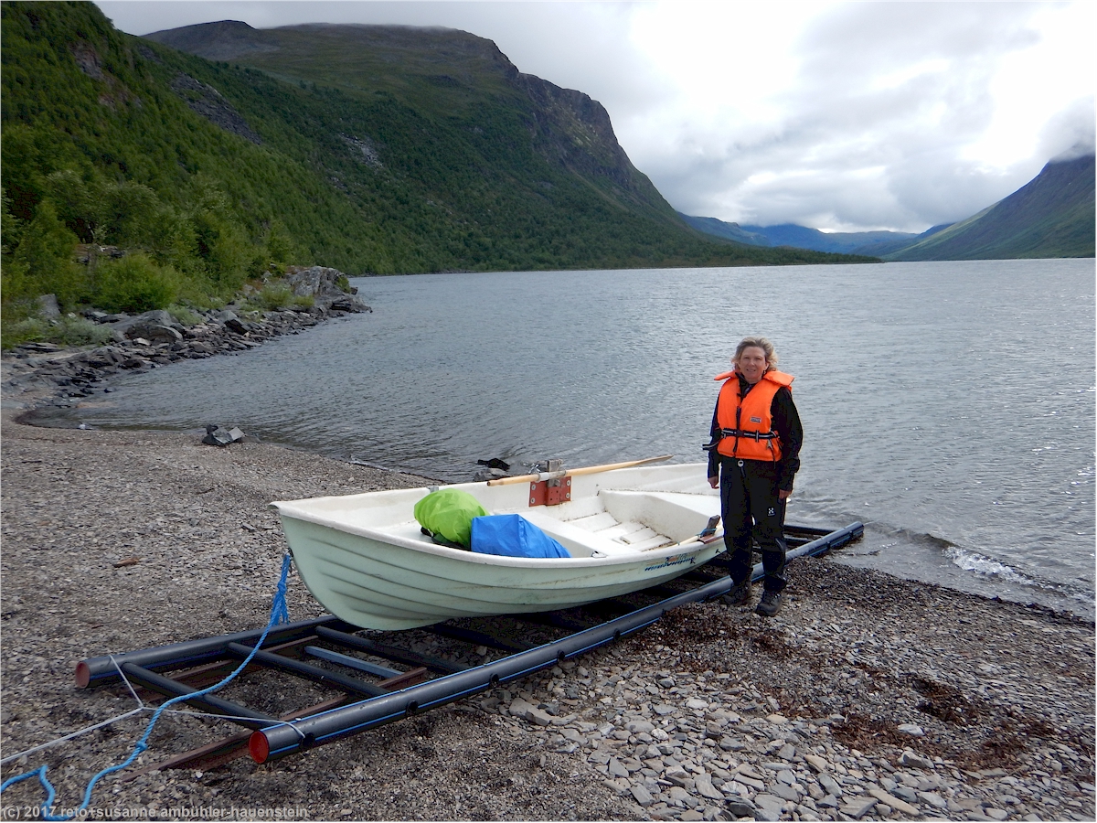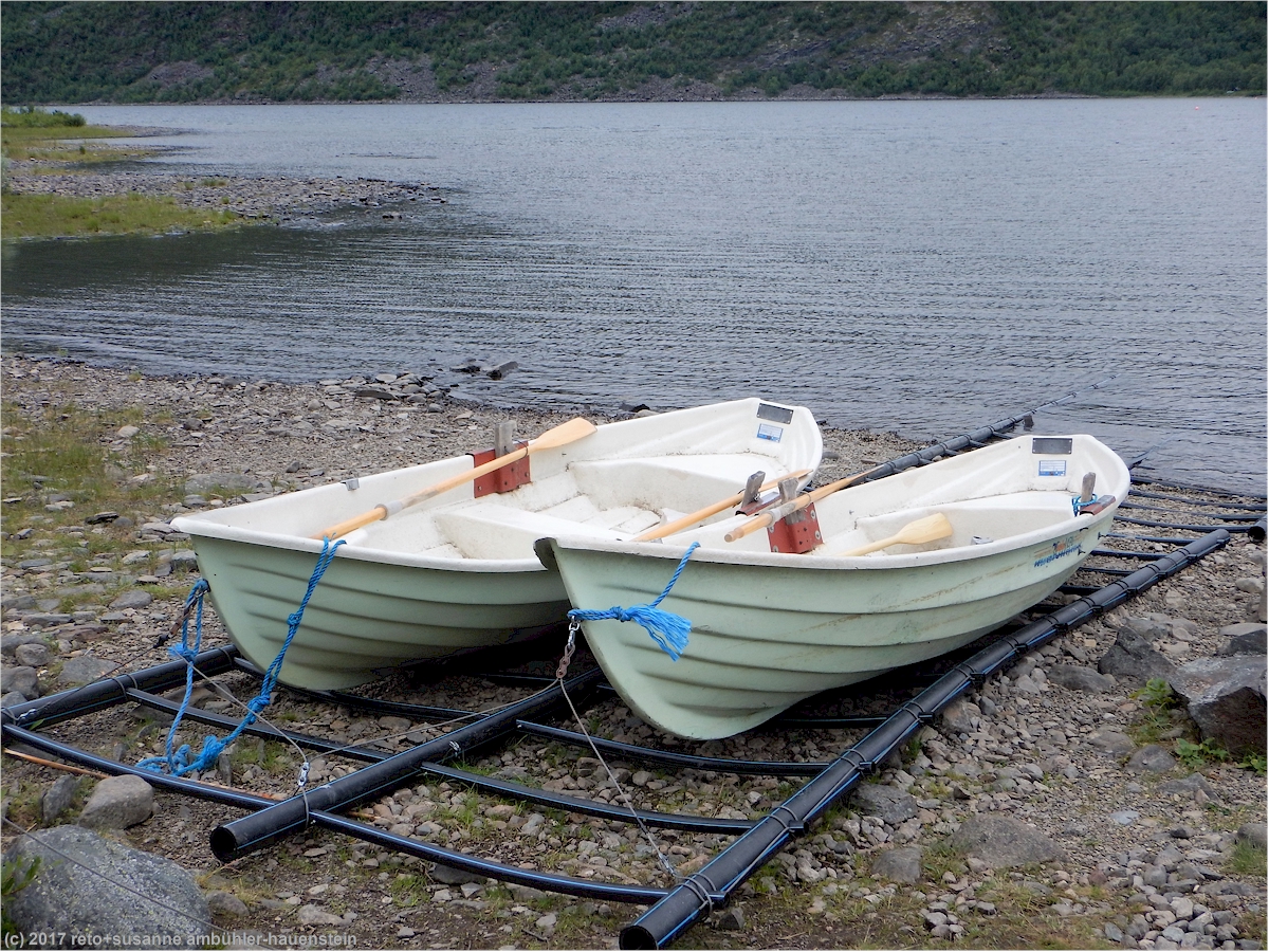 um 11 uhr sind wir bei den teusajaurestugorna. das büro des hüttenwarts ist abgeschlossen, gemäss aushang fährt erst um 14 uhr ein boot zur anderen seeseite. es gibt aber drei ruderboote, mit denen man den see selber überqueren kann. die idee ist, dass die wanderer dafür sorgen, dass es auf jeder seeseite immer mindestens ein boot hat. wenn man glück hat und zwei boote am ufer liegen, so kann man einfach auf die andere seeseite rudern und weiter gehen. wenn man pech hat und nur ein boot da ist, dann muss man den see drei mal überqueren ! zuerst rudert man mit dem einen boot auf die andere seite, kommt mit zwei booten zurück und überquert dann den see noch einmal. damit hat es wieder auf beiden seiten mindestens ein boot. hält sich jemand nicht an die regel und alle drei boote befinden sich auf der anderen seeseite, so ist man aufgeschmissen. dann bleibt nichts anderes übrig, als auf den hüttenwart zu warten, damit er einen mit seinem motorboot über den see bringt bzw. einen auf der anderen seeseite abholt. für den letzteren fall muss man entweder anrufen oder, falls man keinen empfang hat, die fahne bei der anlegestelle hissen. es kann aber dauern, bis einen der hüttenwart bemerkt. wir treffen am ufer auf eine gruppe wanderer, die ebenfalls über den see möchten. sie wollen aber auf den hüttenwart warten und nicht selber über den see rudern. wir würden sehr gerne ein ruderboot benutzen, aber es ist keines da ! zwei junge burschen sind mit einem ruderboot unterwegs, sie tun sich aber enorm schwer. es bläst ein kräftiger westwind, sie werden immer weiter nach osten abgetrieben. da es offensichtlich noch eine weile dauern wird, bis sie hier ankommen - wenn überhaupt - beschliessen wir, in der hütte eine suppe zu kochen.