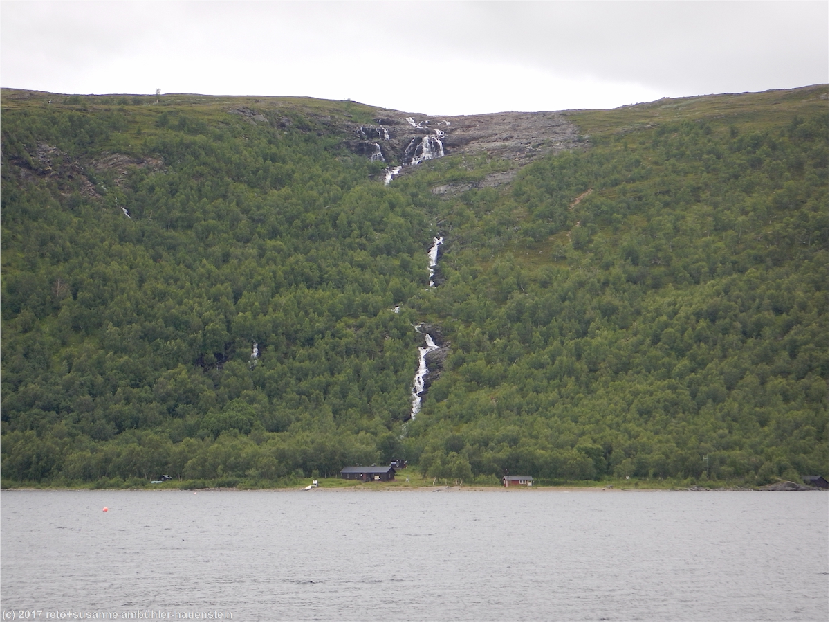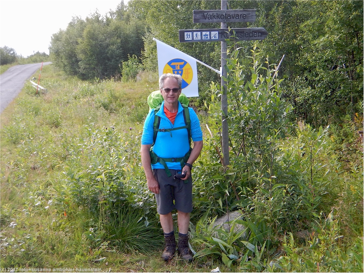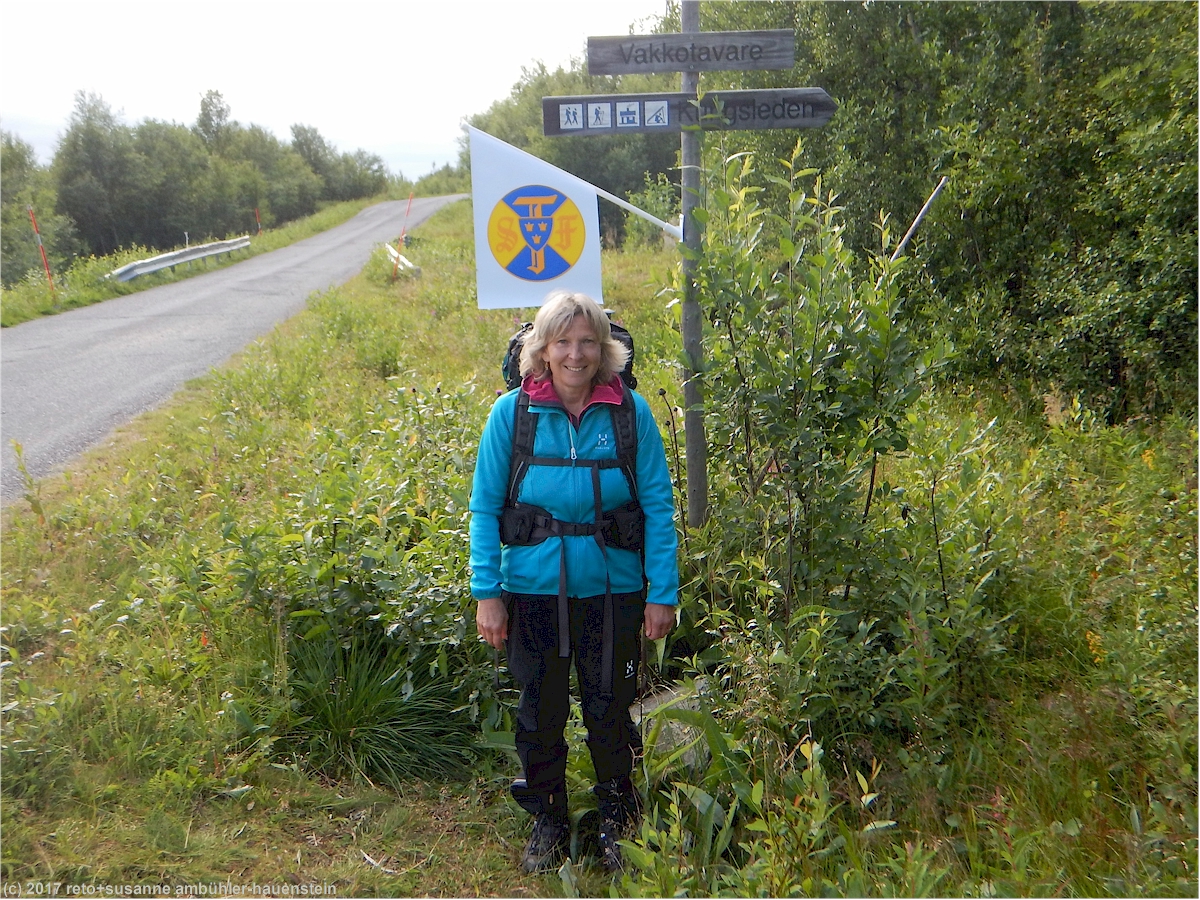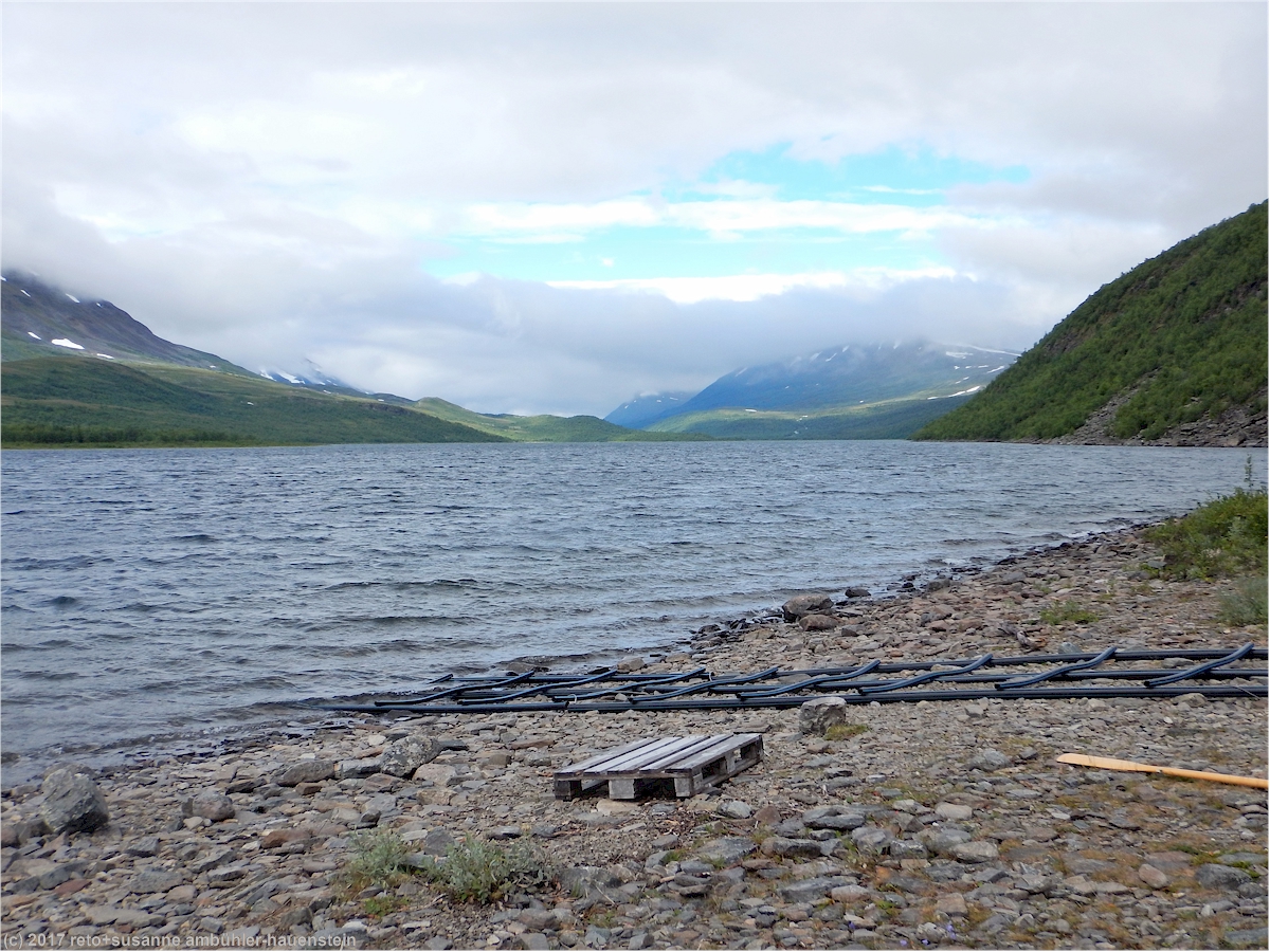 nach einer regnerischen nacht verlassen wir die kaitumjaurestugorna kurz nach 8 uhr. wir folgen dem kaitumjåkka bis zum aufstieg richtung muorki. der boden ist häufig nass, auch auf diesem abschnitt des kungsleden wurden viele holzplanken verlegt. um 11 uhr erreichen wir die fjällstation am teusajaure. um die wartezeit zu überbrücken bis ein ruderboot eintrifft, essen wir eine suppe. anschliessend müssen wir drei mal über den see rudern, damit zum schluss an beiden ufern mindestens ein boot vorhanden ist. nach dem mittagessen am seeufer erklimmen wir die anhöhe zwischen teusajaure und vakkotavare. kurz nach dem höchsten punkt erreichen wir die stelle, bei der wir im letzten sommer auf einer tageswanderung umkehrten. um 18 uhr erreichen wir die vakkotavare fjällstation. wir werden von der hüttenwartin freundlich empfangen. wenig später sind wir auf dem campingplatz des stora sjöfallets nationalpark, wo wir erst die luxuriöse sauna und anschliessend im restaurant ein köstliches nachtessen geniessen.