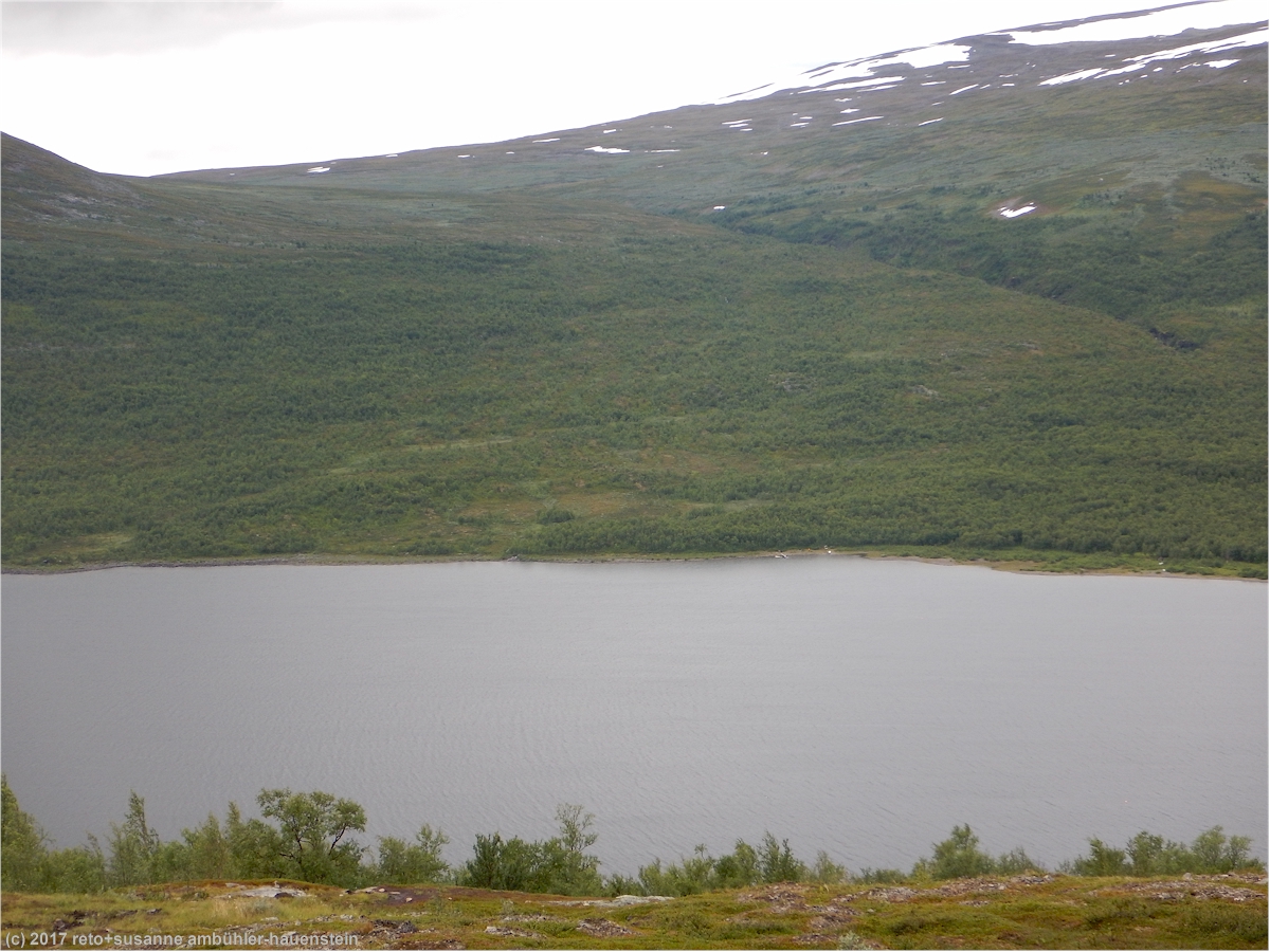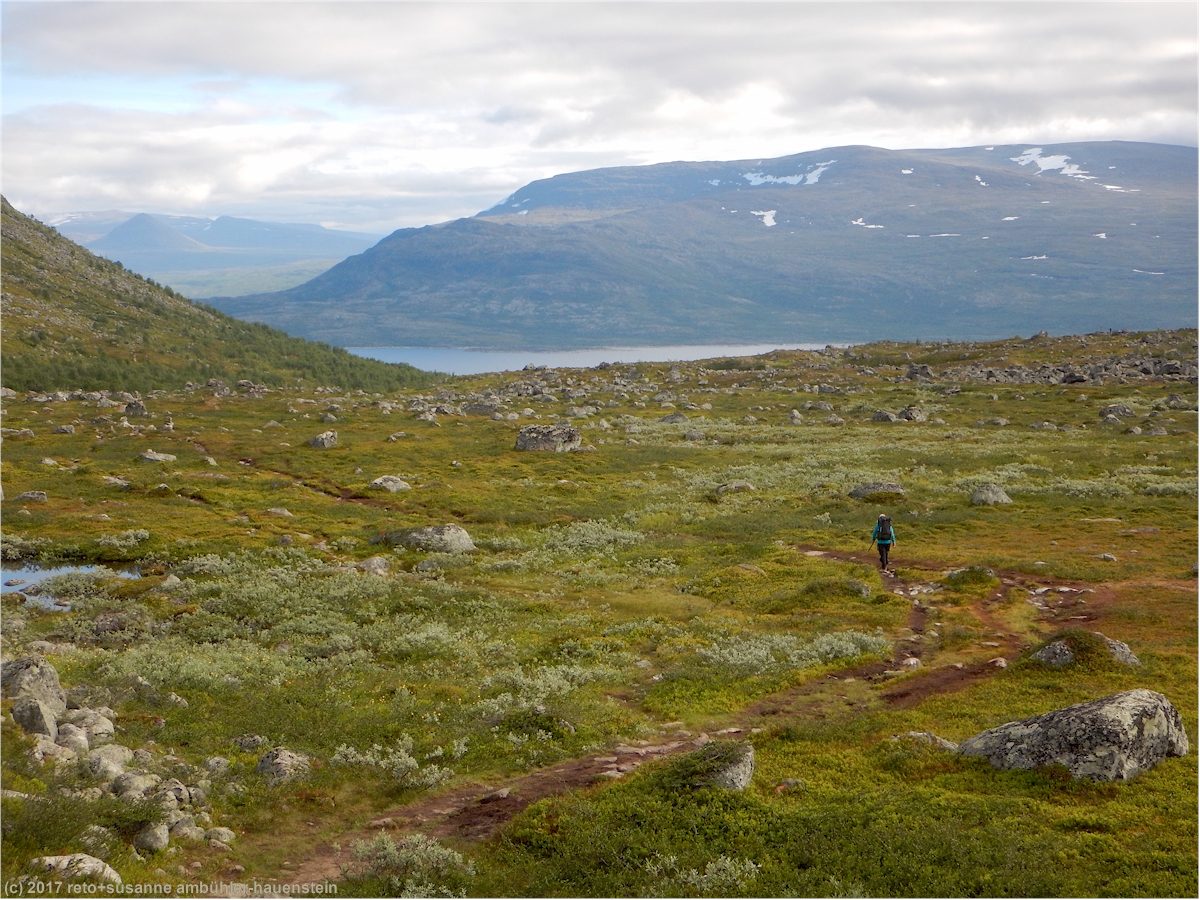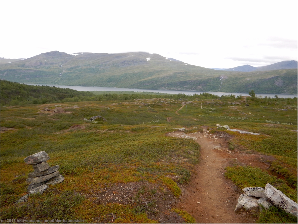 die vegetation wird noch einmal karger. die hochebene trägt gemäss der schwedenkarte die bezeichnung muorki und erhebt sich 780 meter über meer. erstaunlicherweise führt der pfad auch hier oben öfters durch eine sumpflandschaft, ich hätte eigentlich erwartet, dass es auf dieser höhe etwas trockener wäre. kurz nach 10 uhr haben wir den höchsten punkt überschritten, danach geht es erst sanft und dann immer steiler richtung teusajaure hinunter. wir überqueren den bach, der weiter unten die wasserfälle hinter der fjällstation speist. während wir zum see hinab steigen, haben wir einen tollen ausblick auf das gegenüberliegende ufer. wir erkennen die anlegestelle für die ruderboote und die anhöhe, die uns noch von unserem ziel trennt.