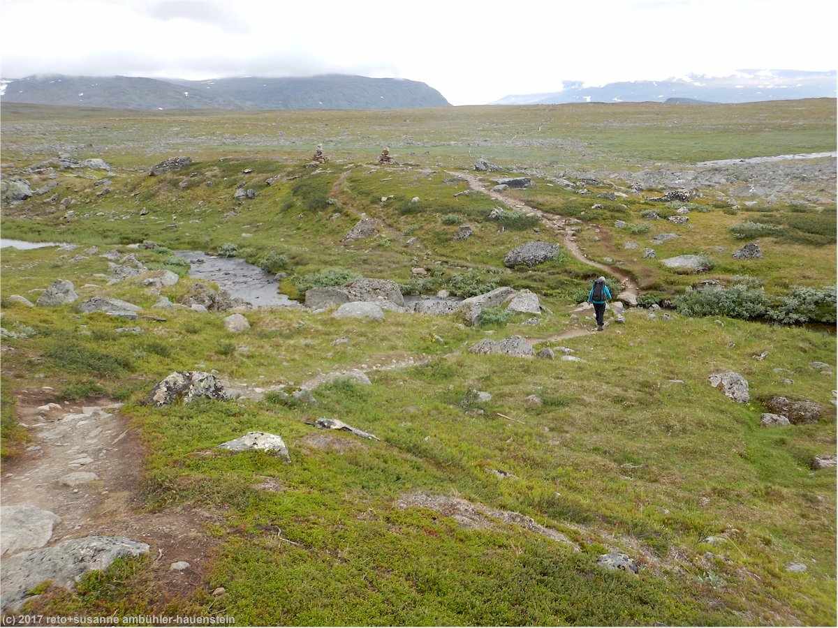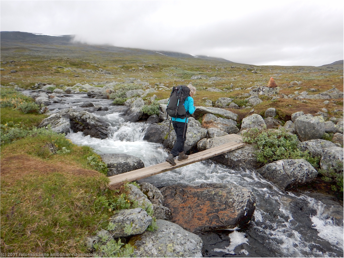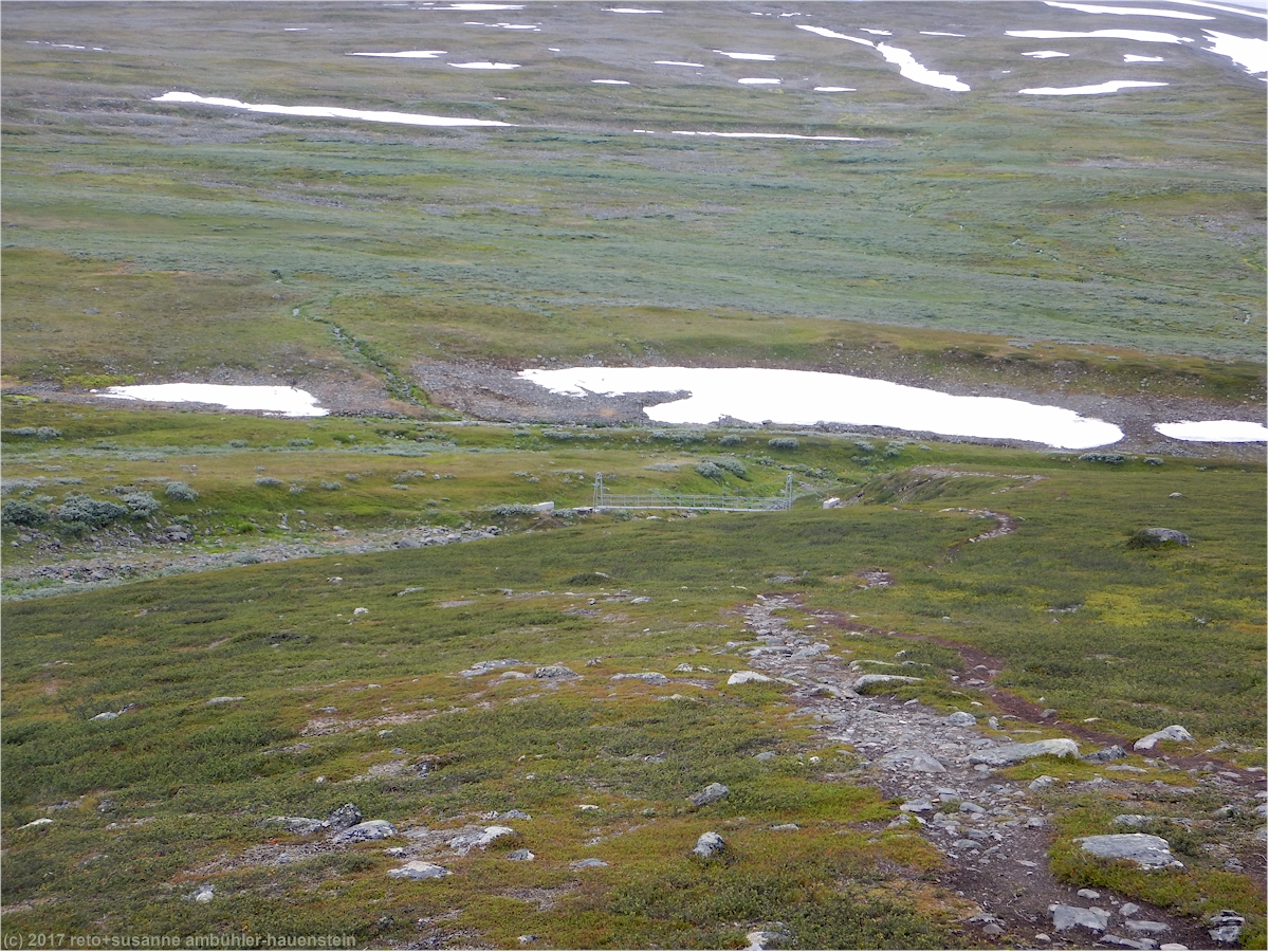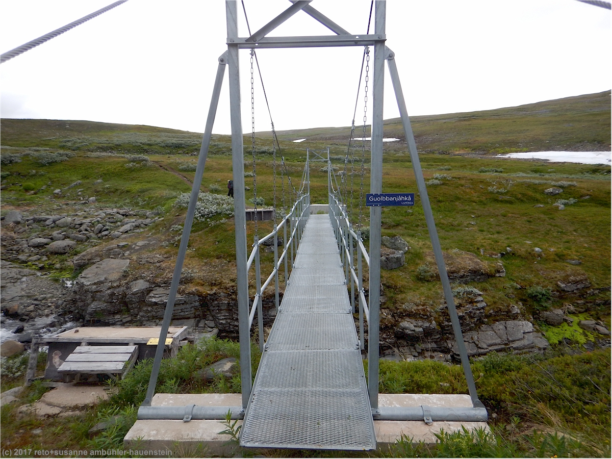 als wir uns bereits auf einer höhe von gut 800 metern befinden, nähern wir uns dem guolbbanjåhkå. auf meiner karte ist sowohl ein pfad eingezeichnet, der geradeaus weiter geht, als auch einen zur einer brücke knapp 200 meter weiter westlich. schilder, die ganz neu aussehen, weisen den weg zu letzterem. wir überlegen, ob wir dem weg geradeaus oder den schildern folgen wollen. würden wir geradaus gehen, wäre die distanz kürzer, aber wir müssten wohl den fluss durchqueren. wir beschliessen, den schildern zu folgen, müssen aber feststellen, dass die brücke mehr als 400 meter vom wanderweg entfernt ist. sie scheint ganz neu zu sein. der fluss führt wenig wasser, wir hätten wohl problemlos die kürzere variante wählen können. nun haben wir nicht nur einen umweg von fast einem kilometer gemacht, wir müssen auch zusätzliche höhenmeter überwinden, denn die brücke liegt 50 meter tiefer als der direkte weg. nun gut, was soll's, wir sind ja schliesslich zum wandern da ...