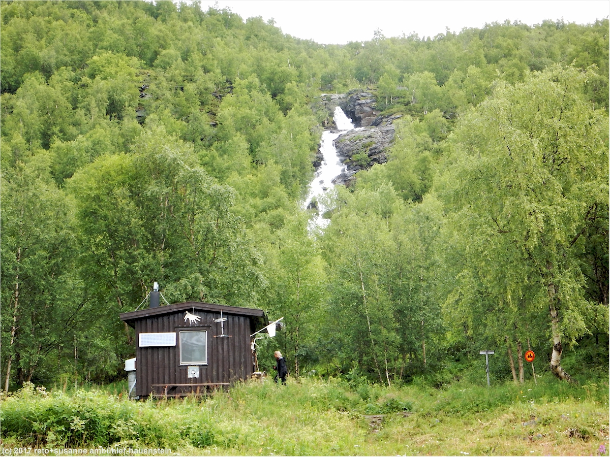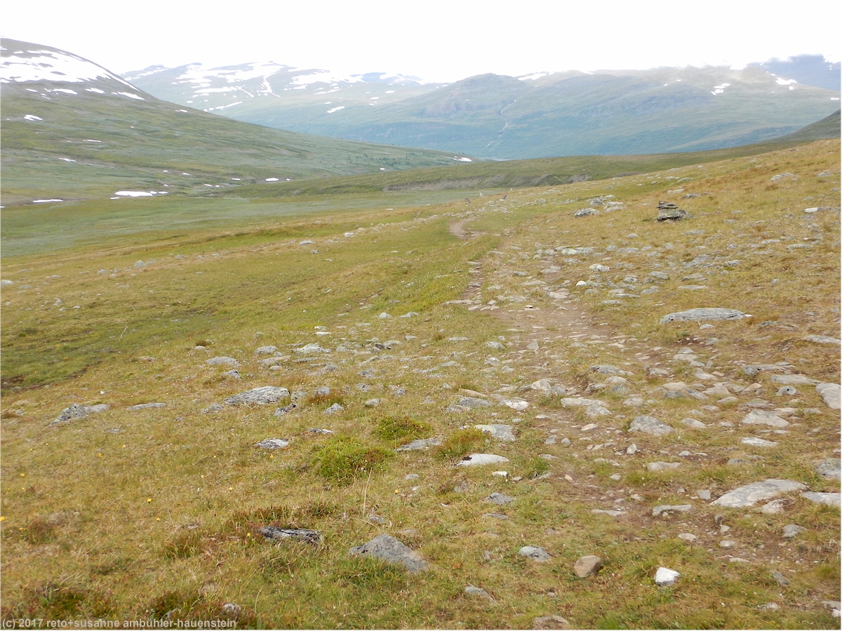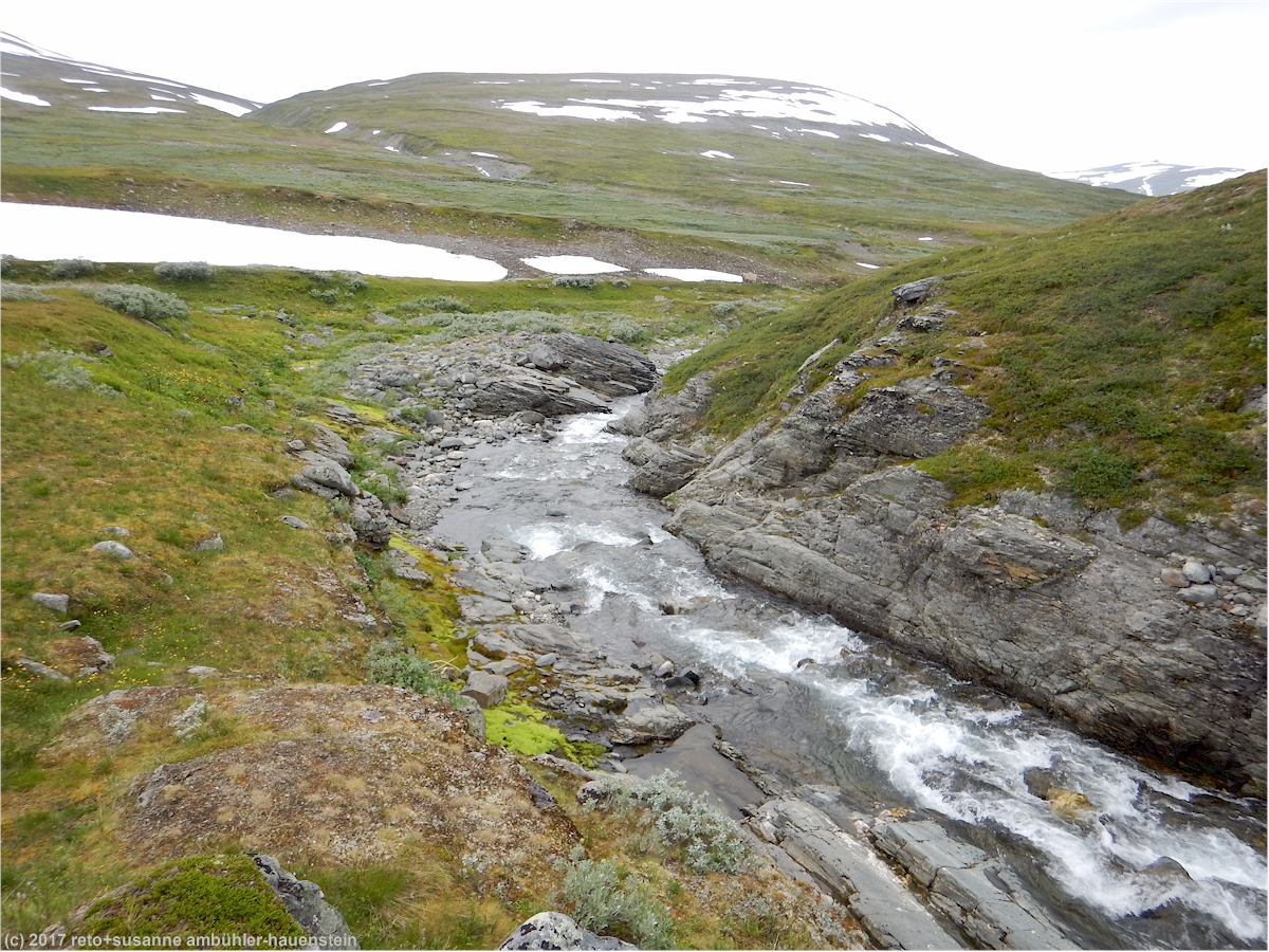 oberhalb der brücke hat es einen eindrücklichen wasserfall. auf der südseite des flusses stossen wir auf einen rentierzaun. gemäss meiner karte zieht sich dieser richtung westen bis zum autajaure und weiter bis zur grenze nach norwegen. die in schweden frei herumziehenden rentierherden sollen ja angeblich in norwegen öfters gravierende schäden an den kulturen verursachen und geben deshalb immer wieder anlass zu hitzigen diskussionen zwischen den beiden ländern. auf unserer wanderung über den kungsleden haben wir allerdings kein einziges rentier gesehen - vielleicht sind tatsächlich alle in norwegen unterwegs. der durchgang durch den rentierzaun besteht aus mehreren holzstangen, die man wegschieben kann um auf die andere seite zu gelangen. natürlich schliessen wir das "tor" wieder pflichtbewusst, wir wollen ja nicht schuld sein, wenn die schwedischen rentiere den norwegern den salat wegfressen ! noch einmal kommen wir an einem ausgedehnten sumpfgebiet vorbei, dann steigt der pfad ziemlich steil an, so dass wir bald wieder über die baumgrenze kommen. damit nimmt auch die mückenplage rasch ab.