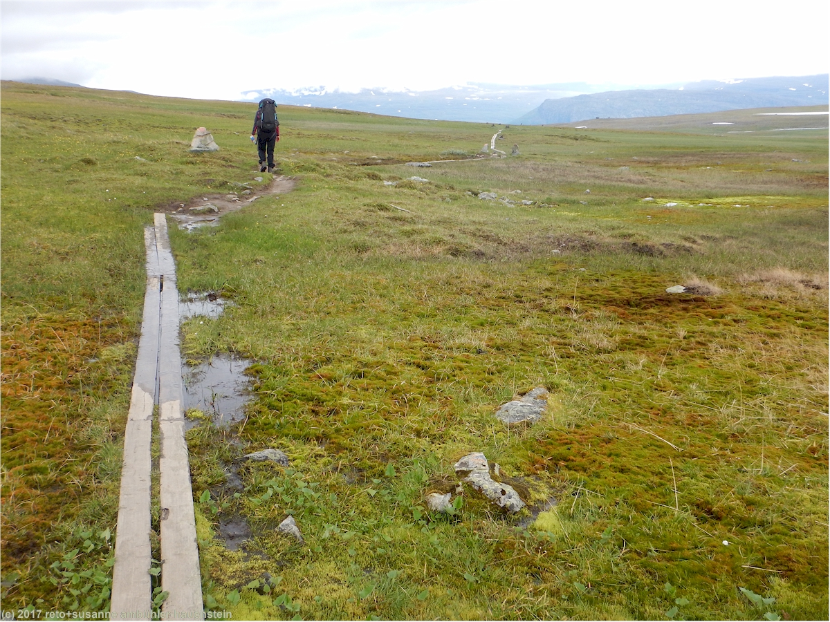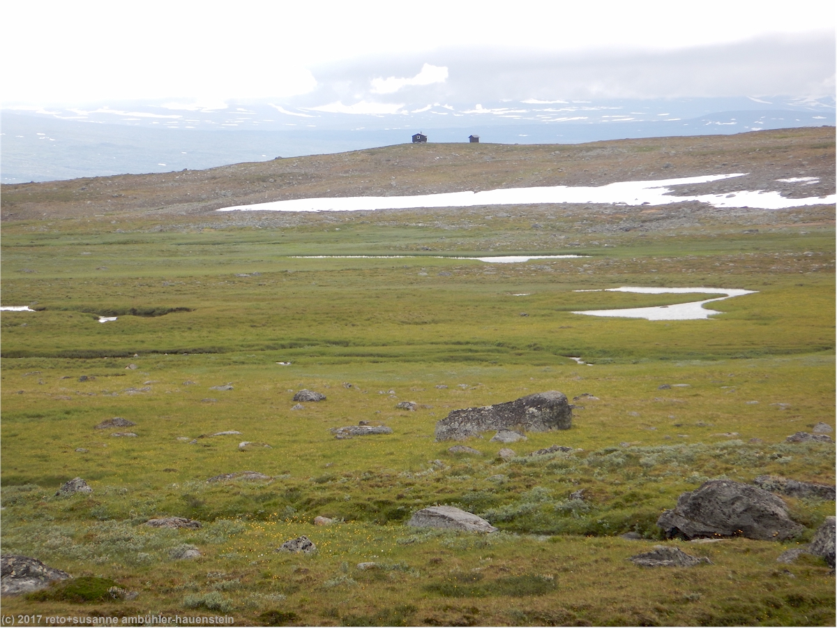 nach dem guolbbanjåhkå steigt der weg noch einmal an. um 15:22 uhr erreichen wir den höchsten punkt zwischen dem teusajaure und vakkotavare, 940 meter über meer. auch hier oben führt der weg oft durch sumpf, aber selbst hier hat man stege verlegt. 700 meter später erreichen wir die stelle, wo wir vor einem jahr umkehrten. im letzten sommer hatten wir auf dem kungsleden verschiedene tageswanderungen unternommen. eine davon führte uns von vakkotavare nordwärts bis auf diese hochebene und wieder zurück zum ausgangsort, siehe tagebuch vom 26. juli 2016. ab hier befinden wir uns also auf bekanntem gelände. an die hütten abseits des kungsleden können wir uns noch gut erinnern, gemäss karte ist eine davon eine renvaktarstuga - eine rentierwächterhütte.