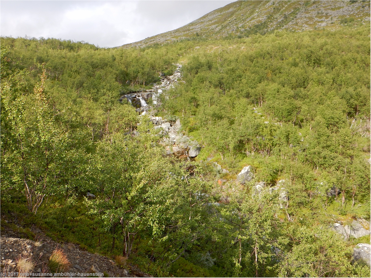 wenig später kommen wir an dem kleinen see vorbei, an dem wir letztes jahr zu mittag gegessen hatten. der abstieg richtung vakkotavare wird nun zusehends steiler. während wir unserem ziel näher kommen, wird das wetter immer freundlicher. über dem suorvajaure hat es blauen himmel, die sonne scheint und es wird spürbar wärmer. auf den letzten 2 kilometern geht es richtig steil von 700 auf 450 meter hinunter. der schmale pfad führt durch einen dichten wald aus niederen bäumen und folgt dem karnjelajåkkå, der in kleinen wasserfällen zum see hinunter fliesst.
