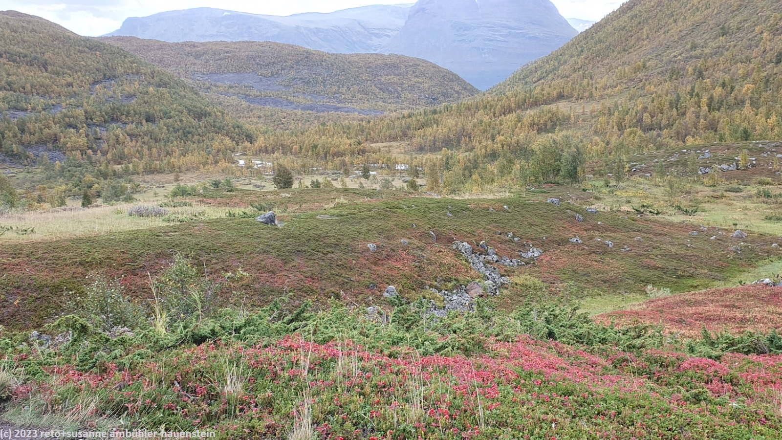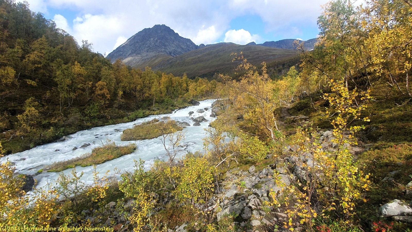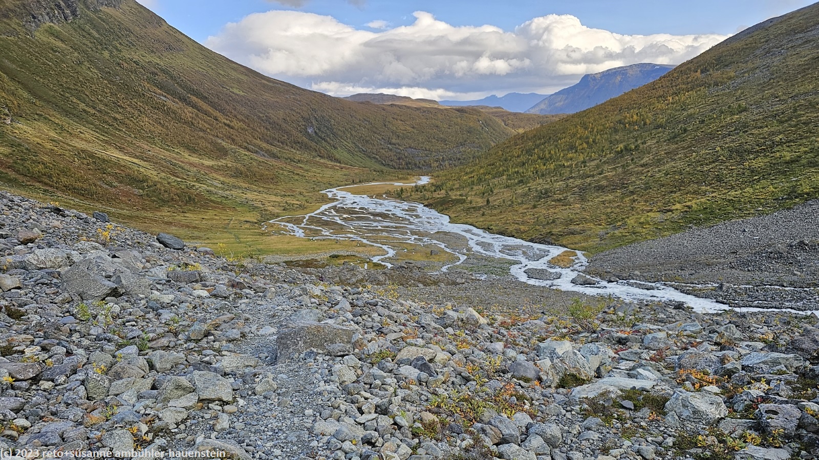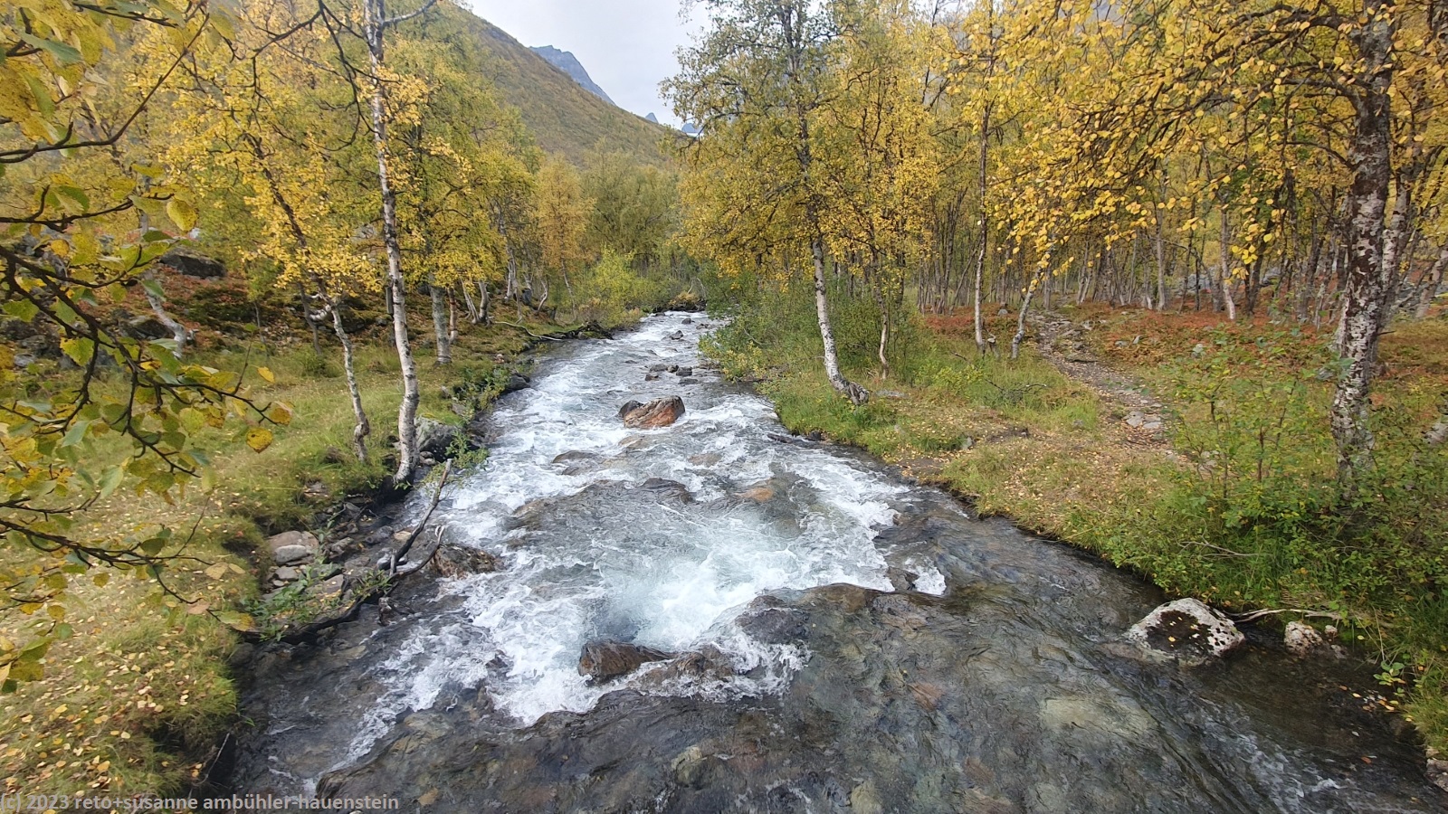 als uns unser handy um 7:30 uhr weckt, regnet es ziemlich heftig. wir haben uns für heute zwei optionen offen gehalten: entweder wir fahren weiter nach levi, oder wir bleiben noch einen tag länger hier und machen eine wanderung zum steindalsbreen. wir vertagen den entscheid bis nach dem frühstück. während wir im jogi essen, wird der himmel etwas freundlicher, man sieht sogar gelegentlich winzig kleine blaue flecken. wir entscheiden uns daher für die wanderung. die reception öffnet erst um 11 uhr, wir nehmen daher auch den tisch und die kabelrolle mit und registrieren uns am abend neu. der ausgangspunkt unserer wanderung liegt auf der anderen seite des storfjorden. luftlinie ist der parkplatz nur 10 km entfernt. wir müssen aber um den fjord herum fahren. dies bedeutet, erst auf der E6 27 km zurück in südwestlicher richtung - den weg, denn wir gestern gekommen sind, dann 17 km auf der strasse 868 in nordöstlicher richtung. kurz vor 11 uhr sind wir beim parkplatz. dieser ist - wie fast alle parkplätze in norwegen, egal wie abgelegen - kostenpflichtig. zum glück kann man überall mit der easypark app bezahlen. diese habe ich schon in kiel installiert und damit konnten wir auf dieser reise jeden gebührenpflichtigen parkplatz bezahlen, egal ob in deutschland, schweden oder norwegen. das ist schon fast genial. wir ziehen unsere wanderschuhe an und machen uns auf den weg. der himmel ist bewölkt, die wolken ziehen rasend schnell. entsprechend geht ein kräftiger wind. wenn ein bisschen sonne durch eines der seltenen löcher in der wolkendecke durchdringt, so ist dieses so schnell vorüber, dass wir kaum ein foto machen können. der weg steigt steil an und ist sehr steinig und holperig. er führt durch einen schönen birkenwald. die blätter der laubbäume sind nun vorwiegend gelb, es ist definitiv herbst geworden. nach knapp 2 km gelangen wir an den ziemlich wilden geailu. uns scheint, dieser führt erstaunlich viel wasser für die jahreszeit. zu unserer rechten hat es einen eindrücklichen wasserfall. nach 55 minuten erreichen wir die steindalshytta. diese ist abgeschlossen, zum übernachten müsste man sich vorher anmelden. über eine kleine brücke setzen wir unsere wanderung fort. bald kommen wir aus dem wald heraus, nun geht es über den breiten talboden. das tal hat die typische U-form, wie von gletscher geformte täler eben sind. vor uns sehen wir die mächtige schlussmoräne des steindalsbreen. der gletscher selbst ist eher klein. schilder markieren, wie weit das eis in früheren jahren gereicht hat. der aufstieg über die endmoräne ist sehr steil. vom gletscher weht ein eisiger wind. wir wandern bis zum see am ende des eises.