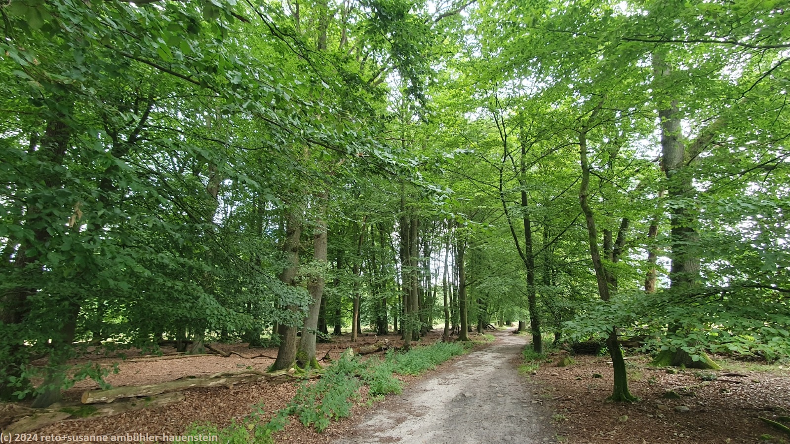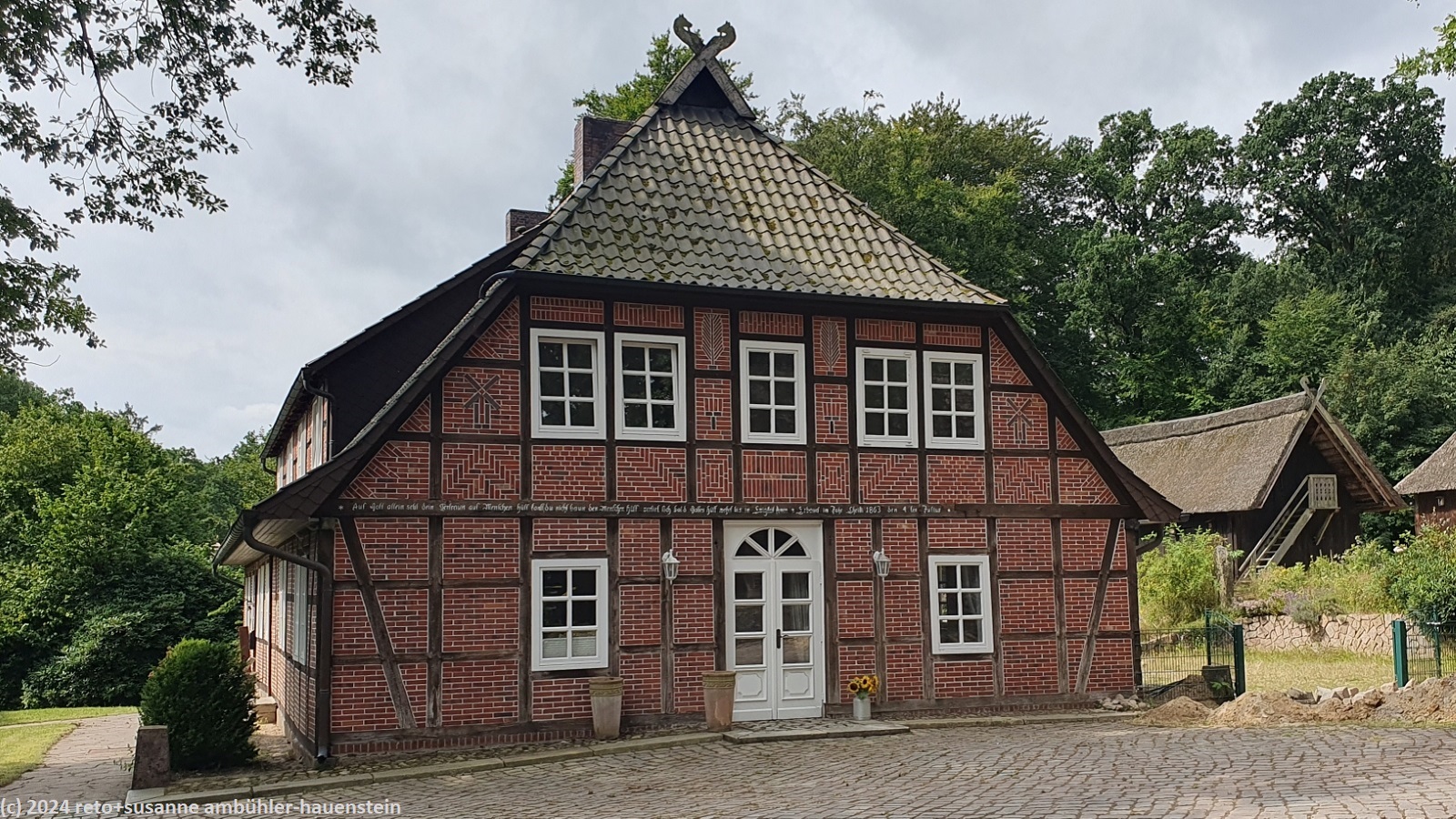 als wir um 08:30 uhr aufstehen ist es bewölkt, nur im westen ist der himmel blau. während wir im freien frühstücken, ziehen die wolken ostwärts und schon bald wird es sonnig. um 10:15 uhr machen wir uns auf den weg nach oberhaverbeck, dem ausgangspunkt unserer heutigen rundwanderung. wir finden einen schattigen parkplatz sowie eine karte mit verschiedenen wanderwegen. wir wandern erst durch den ort und bewundern die zahlreichen fachwerkhäuser. manche höfe wurden in hotels umgebaut. die nebengebäude bieten unterschiedliche unterkünfte und gruppenräume für verschiedene aktivitäten an. ausgangs dorf folgen wir einem weg durch eine graslandschaft. hier am rande des naturparkes wird noch landwirtschaft betrieben. bei niederhaverbeck wären wir beinahe der falschen strasse gefolgt, dank des navi bemerken wir den irrtum nach wenigen metern. nun folgen wir dem pfad richtung wilseder berg. die landschaft ist etwas hügliger als gestern und es hat auch mehr bäume. inzwischen sind wieder wolken aufgezogen, die temperatur ist daher sehr angenehm. kurz vor mittag stehen wir auf dem 169.2 meter hohen "berg". der "gipfel" ist kaum zu erkennen. wäre da nicht der markante stein, wir wüssten nicht genau, wo der höchste punkt ist. nun geht es ostwärts richtung wilsede. der pfad senkt sich ganz leicht. kurz vor dem ort picknicken wir auf einer bank mit blick auf ein schönes heidefeld. während wir unsere brote verzehren, beginnt es leicht zu regnen, aber nur für einige minuten.