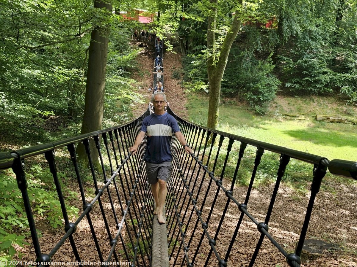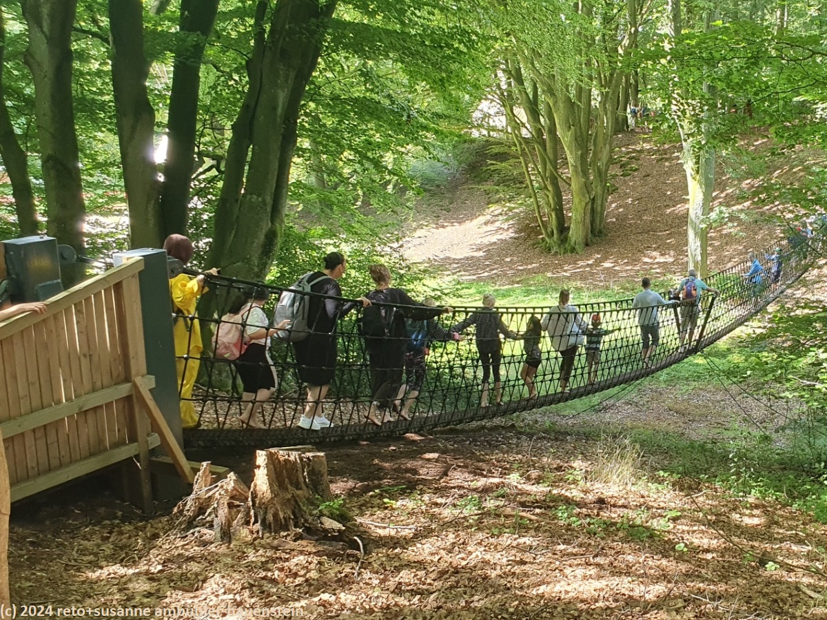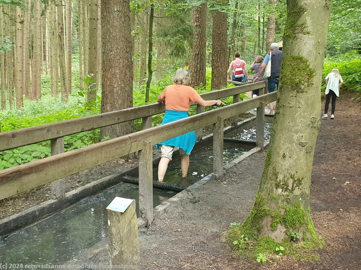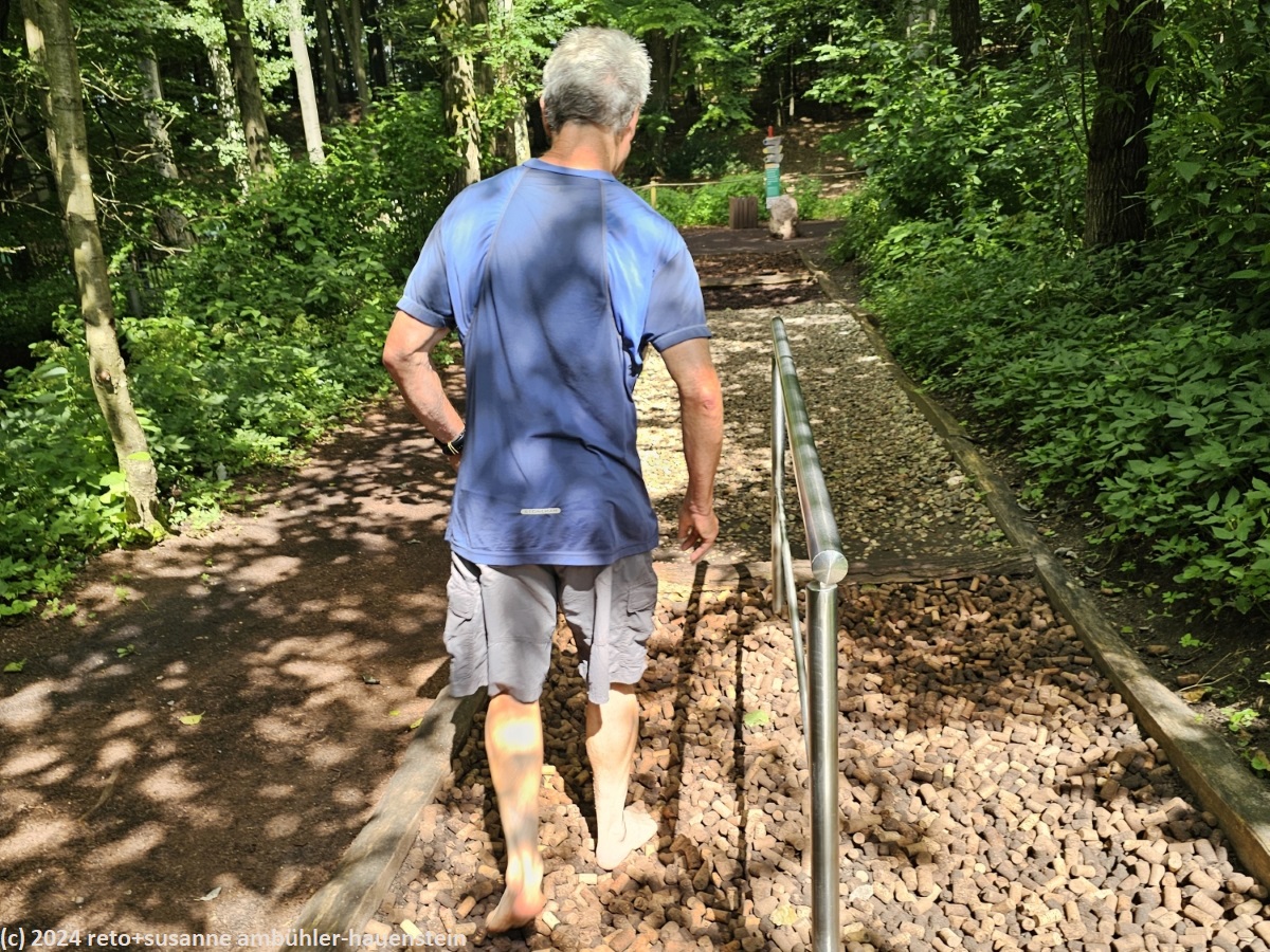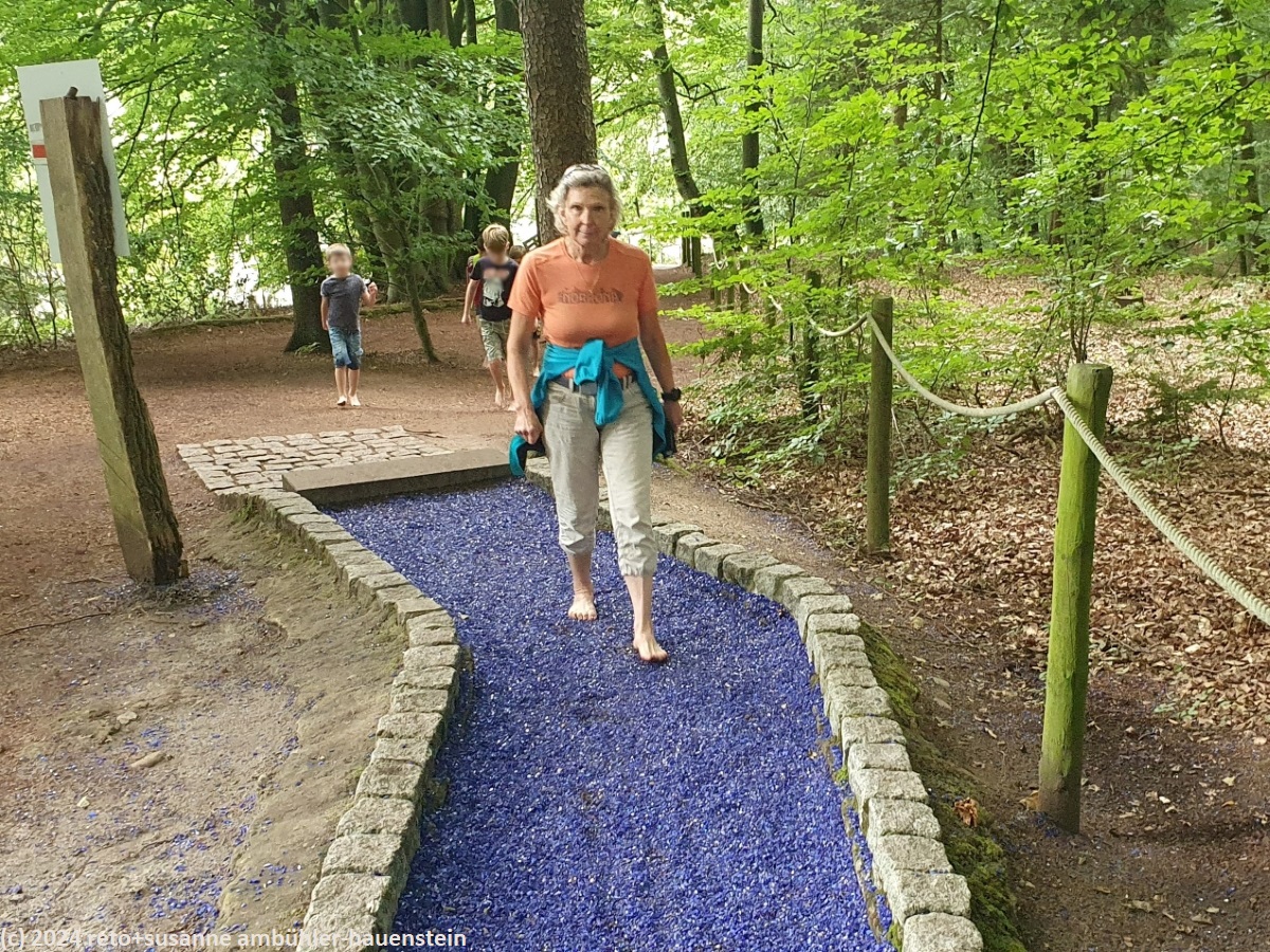 wir stehen auch heute um 08:30 uhr auf. es ist trocken, wenn auch etwas windig. die bedingungen sind gut genug, um im freien zu frühstücken. nach dem abwaschen packen wir zusammen und melden uns beim empfang ab. über die A7 gelangen wir nach egestorf, wo wir den barfusspark besuchen. der besucherandrang ist sehr erträglich. es sind viele familien mit kindern unterwegs, der park ist super geeignet für familien mit kinder jeden alters. der rundweg führt über unterschiedliche unterlagen inklusive holz, stein, glasscherben, pfirsichkerne, tannzapfen, tannenzweige, schlamm- und torfbäder. der waldboden ist angenehm zu begehen. der pfad ist sehr abwechslungsreich. die über 60 posten haben nicht nur mit barfussgehen zu tun, sondern es gibt noch diverse andere attraktionen wie klänge, pendel usw. etwas besonderes ist die "längste barfuss-begehbare hängebrücke". um 12:30 uhr sind wir wieder beim ausgangspunkt.