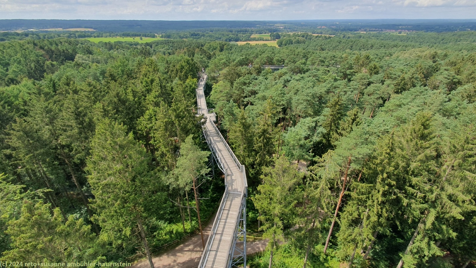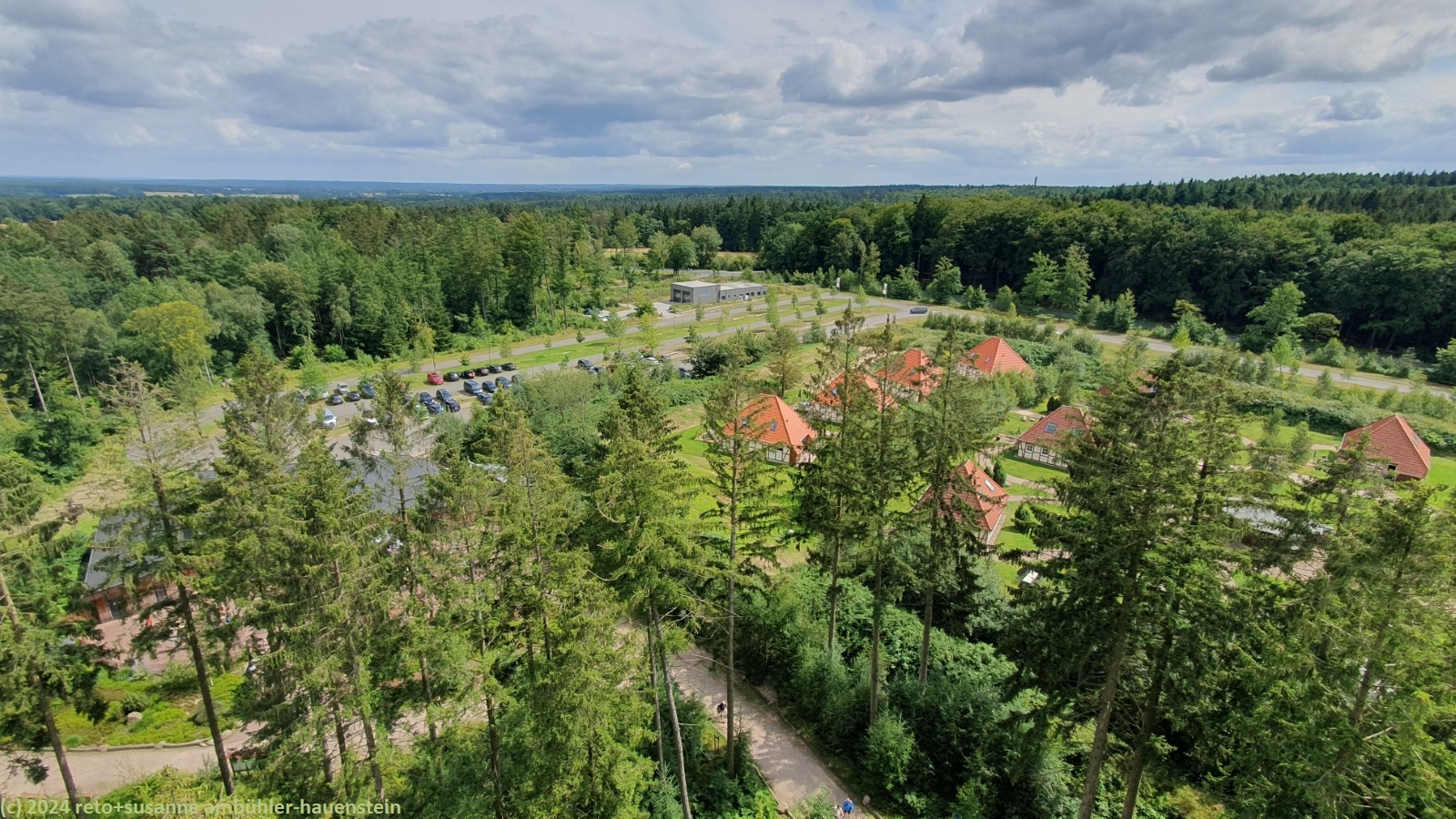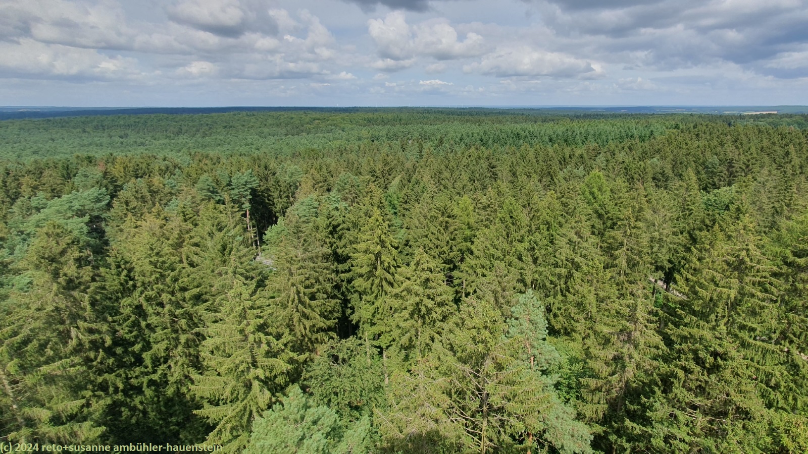 wir fahren zum "heide himmel", einem baumwipfelpfad im wildpark lüneburger heide. allerdings fahren wir nicht direkt, sondern machen einen bogen durch die heidelandschaft um wesel und schierhorn. dabei fahren wir durch undeloh. dieses dorf ist gemäss reiseführer der typische ort in der lüneburger heide schlechthin. manche häuser sind tatsächlich sehr schön, aber uns reicht die fahrt durch den ort, auf den geplanten spaziergang verzichten wir. kurz nach 13 uhr sind wir beim baumwipfelpfad. auch hier hält sich der andrang sehr in grenzen. wir picknicken zuerst an einem der tische beim eingang und geniessen anschliessend kaffee und kuchen auf der terrasse. danach schlendern wir über den baumwipfelpfad. vom steg sehen wir nicht nur in die baumkronen, sondern auch in die gehege des tiergartens. wir erkennen zwei luchse, dachse und waschbären. offenbar dürfen die besucher hier in manche gehege und tiere füttern. zudem sehen wir rehe, welche sich von den besuchern streicheln lassen. schliesslich erreichen wir den 45 meter hohen aussichtsturm. von der plattform haben wir eine tolle rundsicht. wir sehen vorwiegend wald, soweit das auge reicht. selbst der fernsehturm von hamburg ist mit blossem auge zu erkennen. kurz vor 15 uhr sind wir wieder beim jogi.