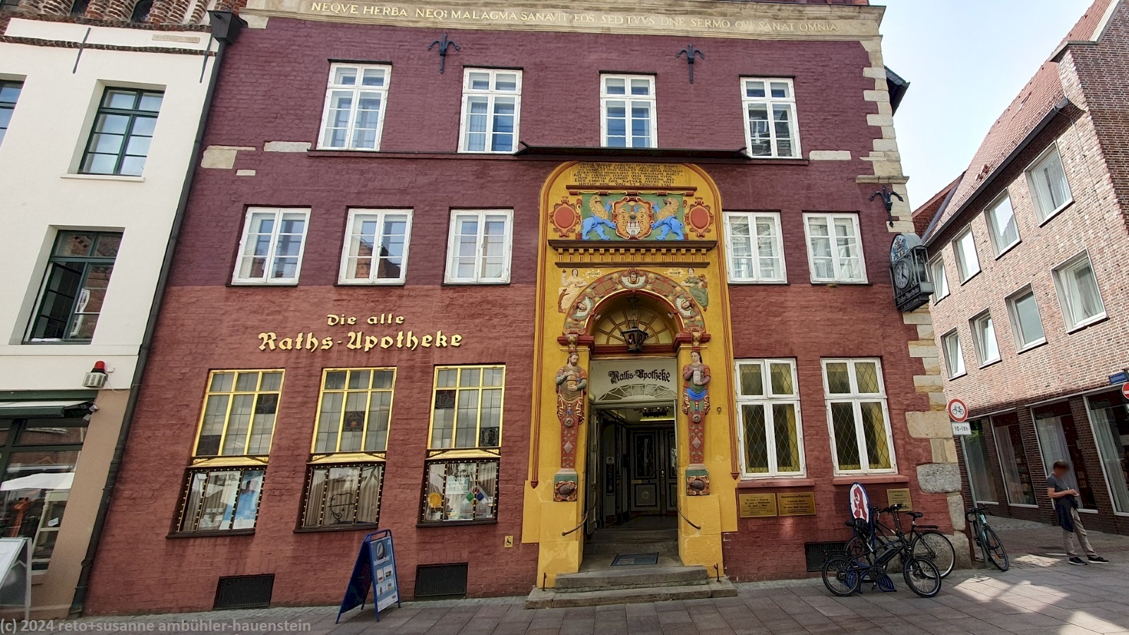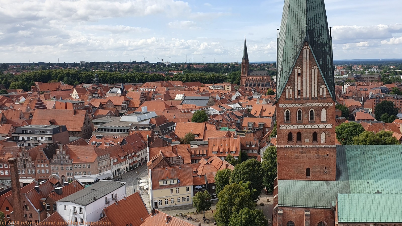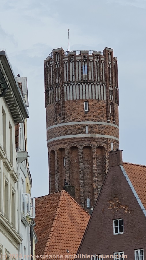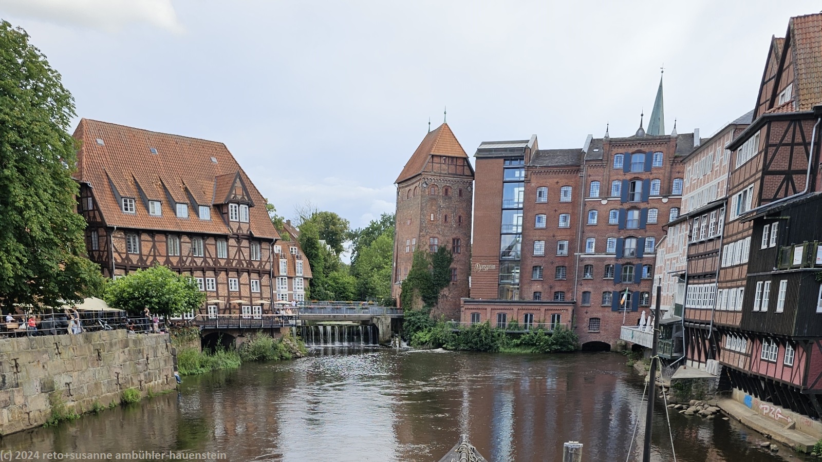 die fahrt nach lüneburg dauert etwas länger als erwartet, weil die strasse zwischen garlstorf und salzhausen gesperrt ist und wir deshalb eine umfahrung nehmen müssen. kurz nach 15:30 uhr erreichen wir lüneburg und finden auch den parkplatz "hinter der saline" auf anhieb. zu fuss gehen wir in die altstadt. im touristenbüro erhalten wir einen stadtplan. wir erfrischen uns "am sande" in einer bäckerei mit tee und einem brötchen, danach spazieren wir durch das stadtzentrum. an der mächtigen sankt johanniskirche vorbei gelangen wir zum 56 meter hohen wasserturm. wir erklimmen die treppe zur aussichtsplattform und haben einen fantastischen rundblick über die stadt. im wasserturm wurden einst 500'000 liter wasser gespeichert. heute dient das gebäude als touristenattraktion und veranstaltungsort. es hat diverse ausstellungen und den zweiten stock kann man für veranstaltungen mieten. wieder auf dem boden gehen wir richtung fluss und folgen der ilemnau bis zur lünerstrasse. hier befindet sich das restaurant "das kleine", wo wir gerne zu abendessen möchten. noch ist es etwas zu früh, aber eine freundliche dame meint, wir bräuchten keine reservation, wir sollen einfach kommen wenn uns danach ist. wir spazieren noch einmal durch die altstadt und sind dann kurz vor 18 uhr beim "kleinen".
