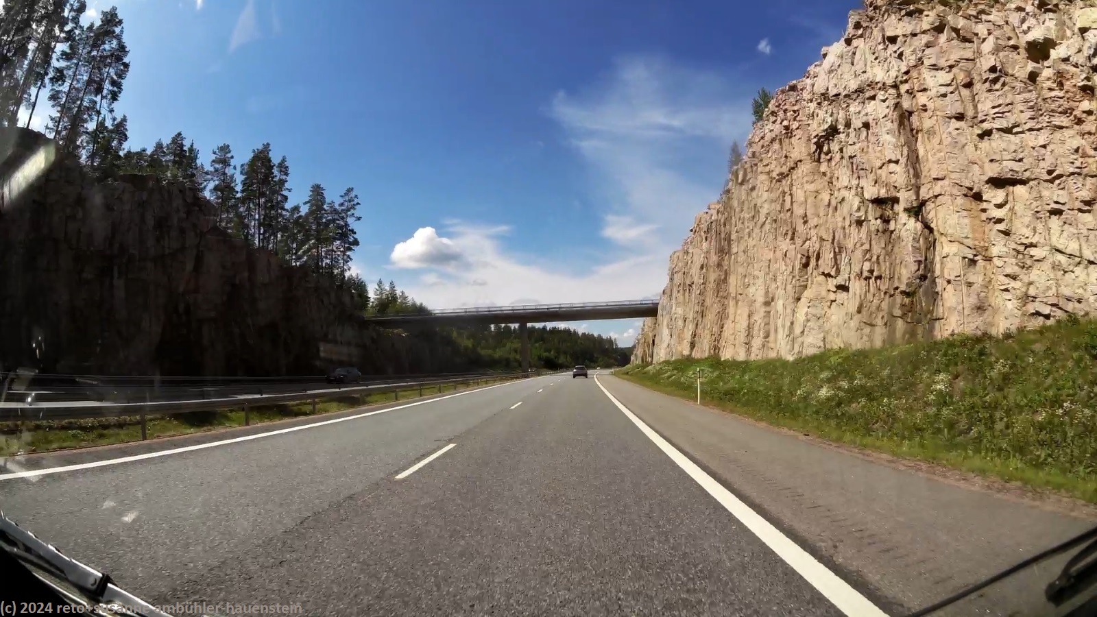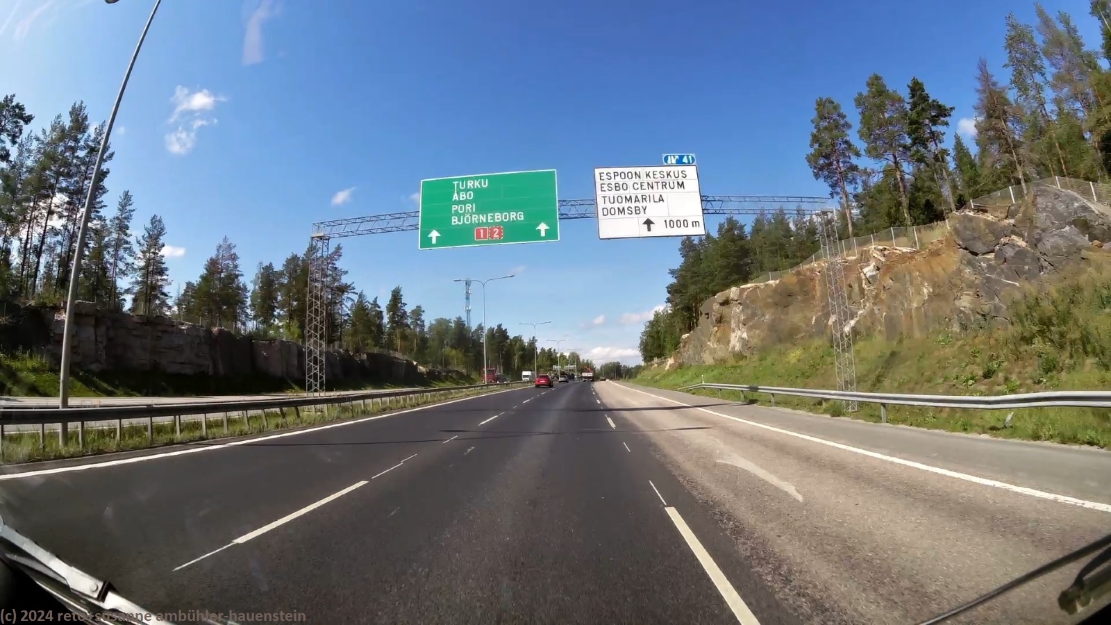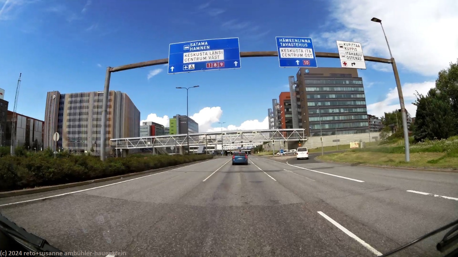 vor dem anlegen muss die mächtige fähre wenden. dank antrieben im heck und im bug kann das schiff an ort drehen. der himmel ist fast wolkenlos, es ist ziemlich warm. wir legen pünktlich an, aber bis das entladen beginnt, dauert es noch ziemlich genau eine stunde. möglicherweise verzögert sich das entladen wegen dem motorradfahrer, der offenbar auf der laderampe gestürzt ist und am boden liegt. was für ein riesiges pech, wenn der urlaub so beginnt - oder gar mit dem sturz endet, bevor er richtig begonnen hat. auch auf der fahrt durch das hafenareal ist viel geduld erforderlich. den zoll passieren wir dagegen ohne verzögerung. schon bald sind wir auf der A7 richtung helsinki. wir fahren auf dem ring nördlich an der stadt vorbei. auf der A1 geht es westwärts. wir kommen äusserst gut voran. es sind nur wenige fahrzeuge unterwegs und die finnen sind sehr disziplinierte autofahrer. erstaunlicherweise fahren wir einige male durch tunnel, zumindest eines davon ist überraschend lange. die sonne steht an einem nahezu wolkenlosen himmel, in unserem jogi steigt die temperatur auf bis zu 32°C. um 13:30 uhr sind wir beim campingplatz ruissalo auf einer insel westlich von turku. unsere reservation klappt, mit dem zugewiesenen stellplatz sind wir allerdings nicht glücklich. wir können aber problemlos auf einen anderen platz wechseln.