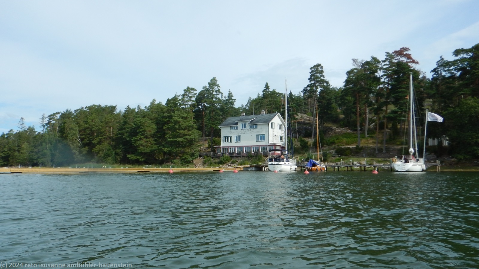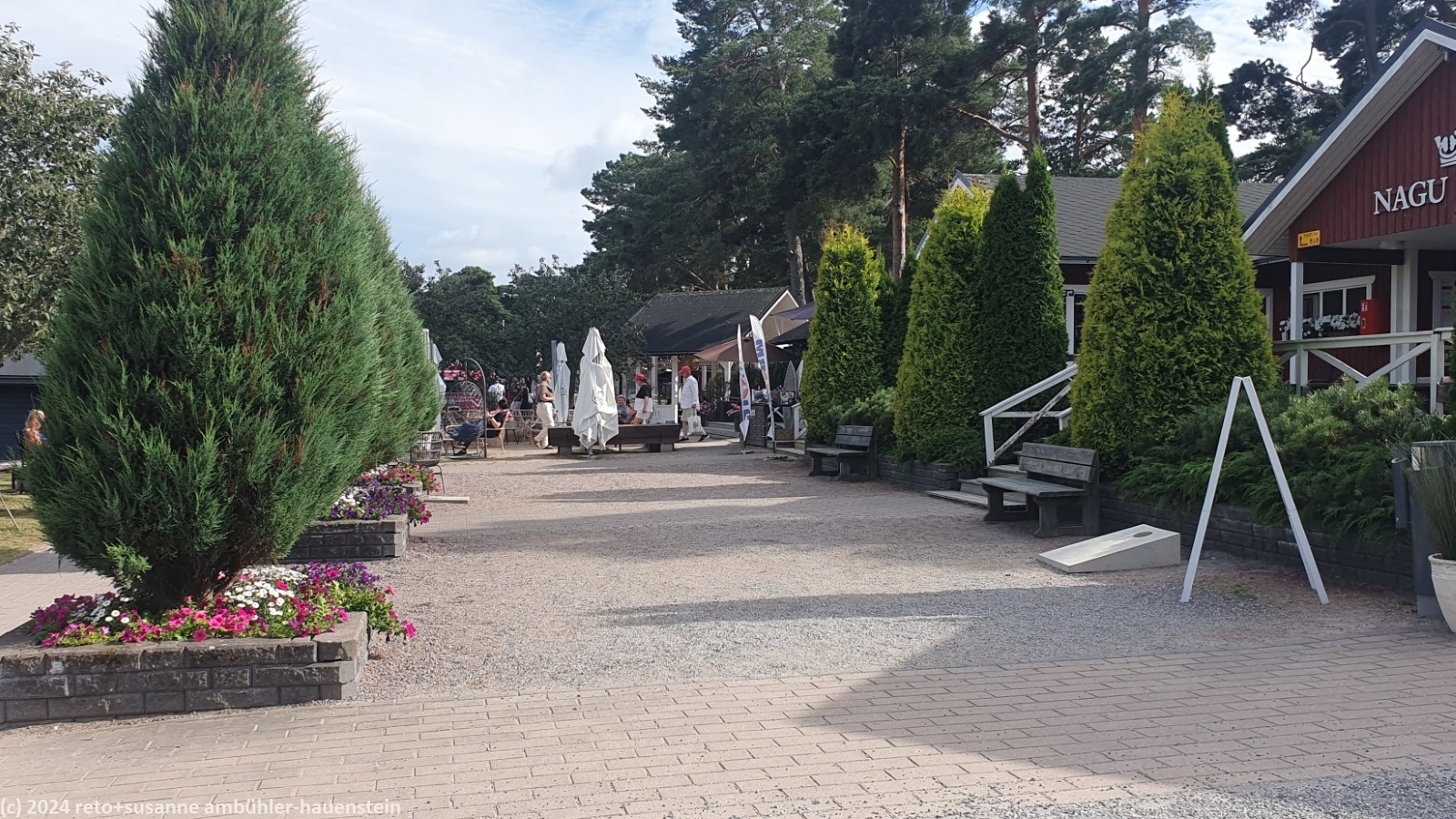 kurz vor 16 uhr sind wir im hafen von nagu. wieder verliert susanne beim aussteigen das gleichgewicht und landet im wasser. auch wenn dieses sehr warm ist, so ist das doch unangenehm. es ist aber nichts passiert. wir ziehen uns um und spazieren dem strand entlang zu einem der restaurants, wo wir uns einen kaffee bzw. tee und je eine zimtschnecke gönnen. ausserdem fragen wir im touristenbüro nach einem platz zum übernachten im zelt. die junge dame hat tatsächlich einen vorschlag, eine etwa 7 km entfernte bucht auf dem weg richtung pargas.