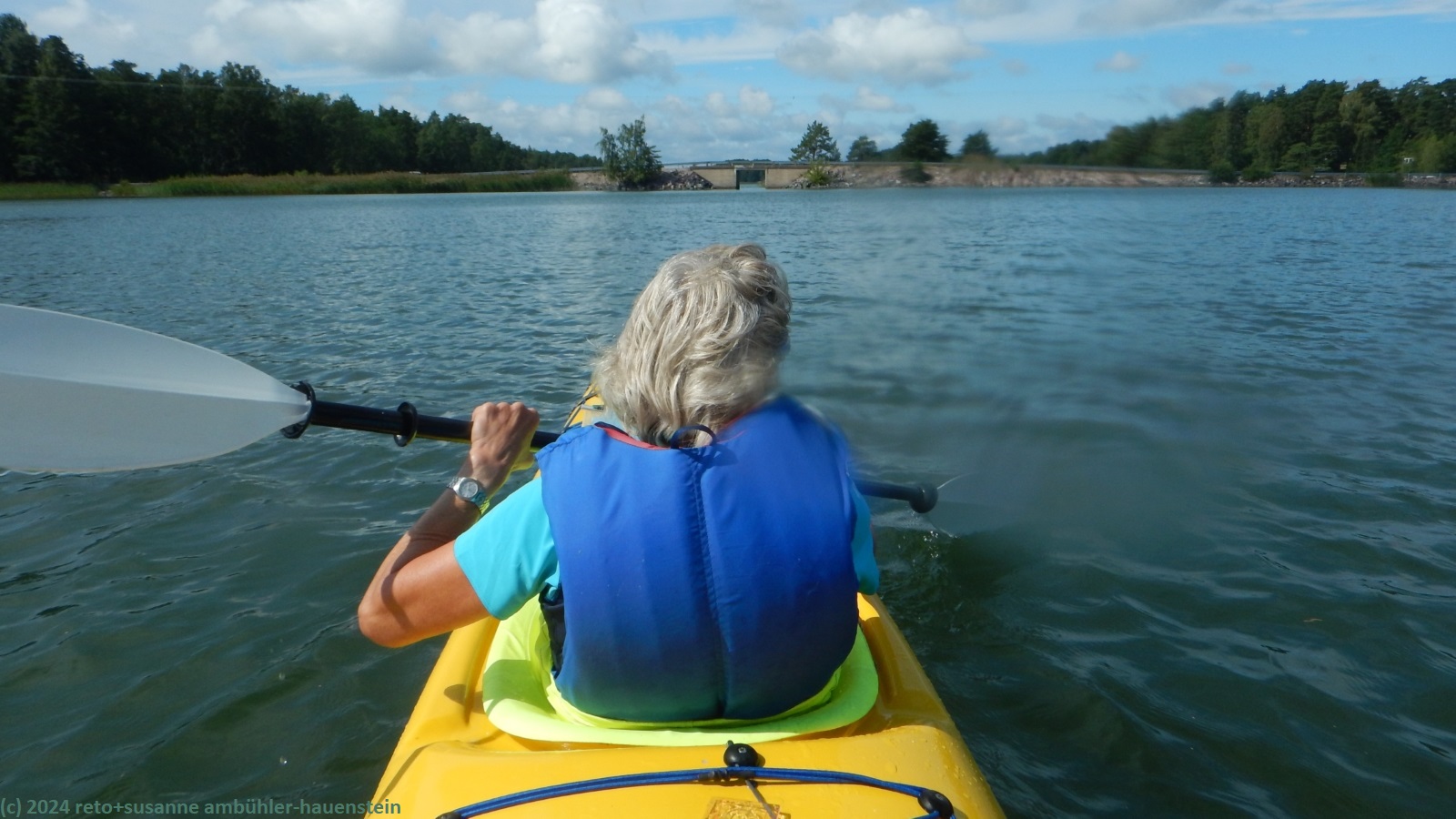 nun geht es weiter richtung nagu. zwischen den inseln peno und svinö hindurch paddeln wir weiter westwärts, fast immer gegen den wind. manchmal finden wir am ufer etwas windschatten. das selbe gilt, als wir zwischen bockholm und bergholm in die wasserstrasse nördlich der insel sommarö rudern. die strasse 12023 überquert hier das wasser. durch ein kleines tunnel gelangen wir in den sommarö sund.