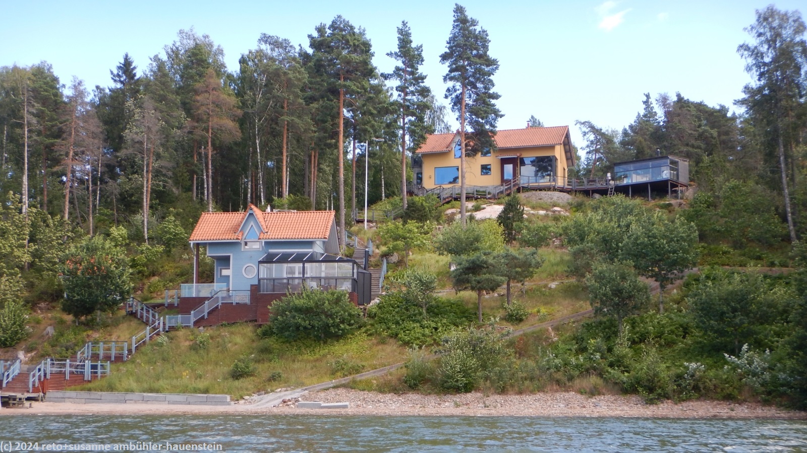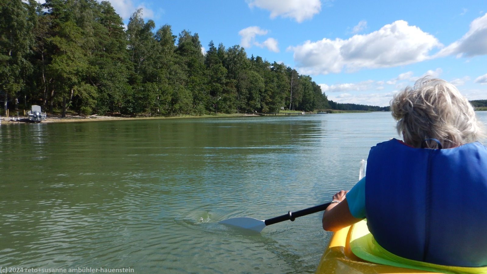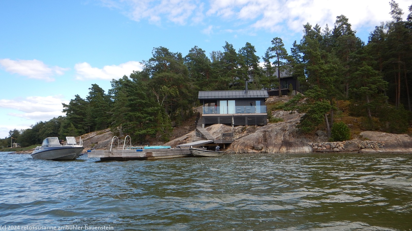 um 14:15 uhr machen wir uns wieder auf den weg. unter der strassenbrücke hindurch paddeln wir weiter richtung pargas. das wasser im kyrkfjärden ist wieder etwas unruhiger. wir halten uns vorerst ans nordwestliche ufer der insel stortervolandet. auch hier ist die küste für skandinavische verhältnisse dicht bebaut. prächtige strandhäuser, oft mit schönen nebengebäuden, in welchen es vermutlich meistens eine sauna hat, thronen hoch über dem wasser. leider hat man es in dieser gegend verpasst, an geeigneten stellen rastplätze für kajaker zu schaffen. im norden hat man das besser gemacht. immer wieder findet man rastplätze mit feuerstellen, einem windschutz oder einer kleinen hütte und stellplätze für ein oder zwei kleine zelte, siehe zum beispiel tagebuch vom 05-aug-2024.