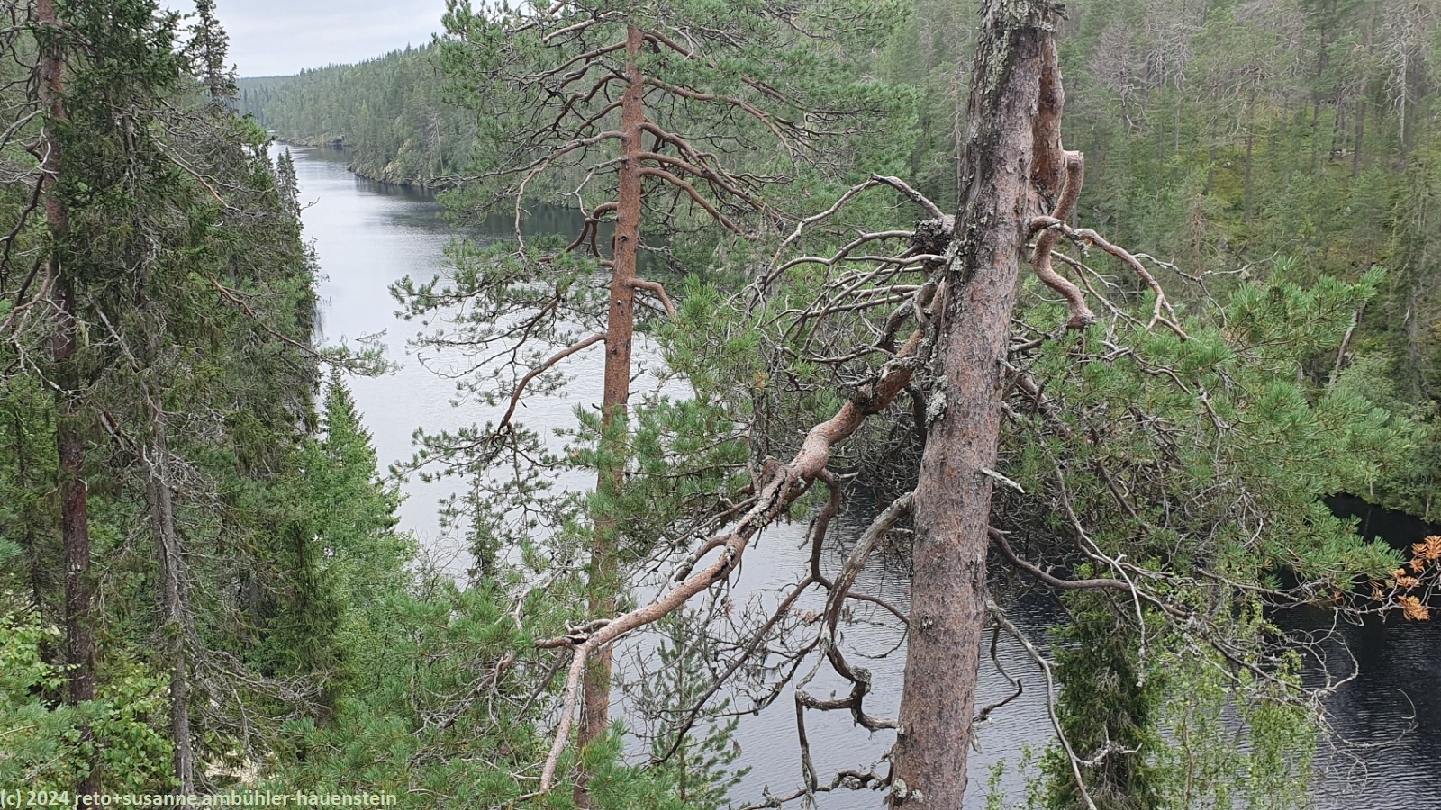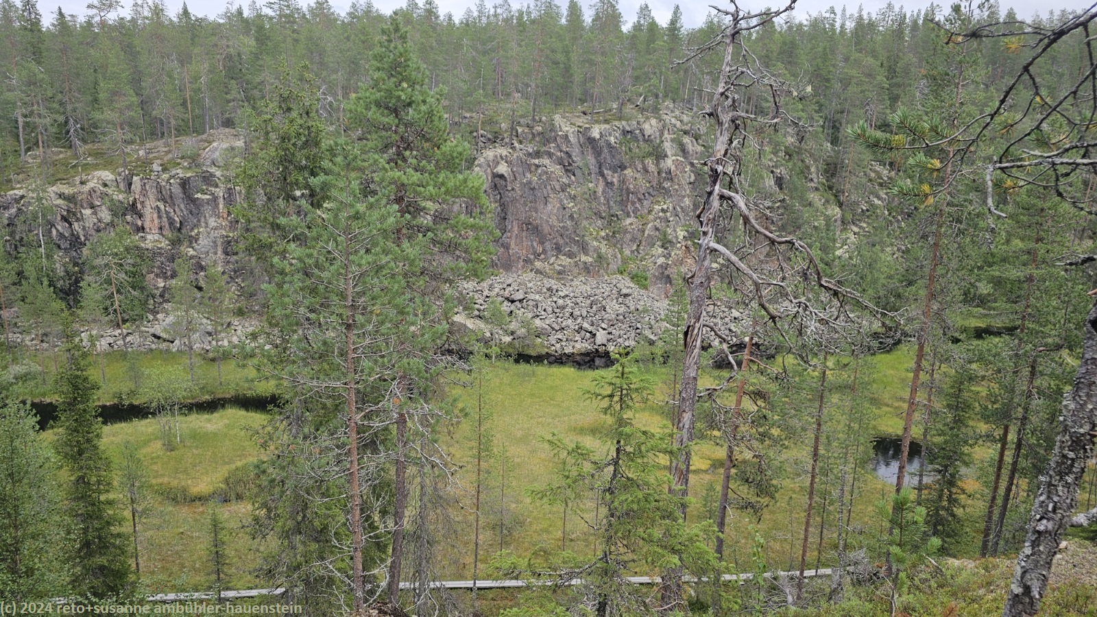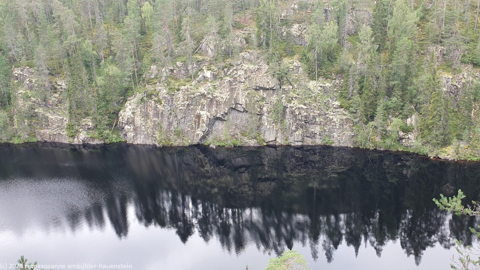 wir schlafen bis 08:45 uhr. nach dem frühstück im wagen fahren wir zum julma-ölkky, wobei wir auch heute über eine holprige, unbefestigte strasse zum ausgangspunkt unserer rundwanderung gelangen. diese führt uns um die langgezogene schlucht des julma-ölkky, ein schmaler see, der bis zu 50 meter tief sein soll. die steilen felswände überragen die wasseroberfläche nochmals um bis zu 50 meter. der schmale pfad ist ein auf und ab. wir wandern auf der ostseite bis zum nördlichen ende der schlucht. dabei kommen wir auf etwa halbem weg an der hängebrücke vorbei, welche den see überspannt, zur zeit aber geschlossen ist. es ist schon bald 13:30 uhr, als wir bei der schutzhütte ölökynperä picknicken. obwohl uns unterwegs kaum jemand begegnet ist, hat es hier erstaunlich viele menschen. auf dem rückweg zum ausgangspunkt folgen wir dem westlichen rand der schlucht. auch hier gibt es einige schöne aussichtspunkte. zurück beim parkplatz holen wir uns beim kiosk kaffee und eine zimtschnecke. während wir zum campingplatz zurück fahren, zeigt sich die sonne. wie schon gestern geniessen wir erst die sauna und dann das abendessen im freien. den abend verbringen wir am computer.