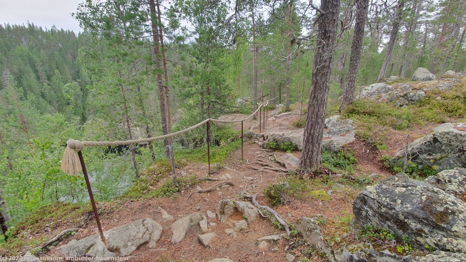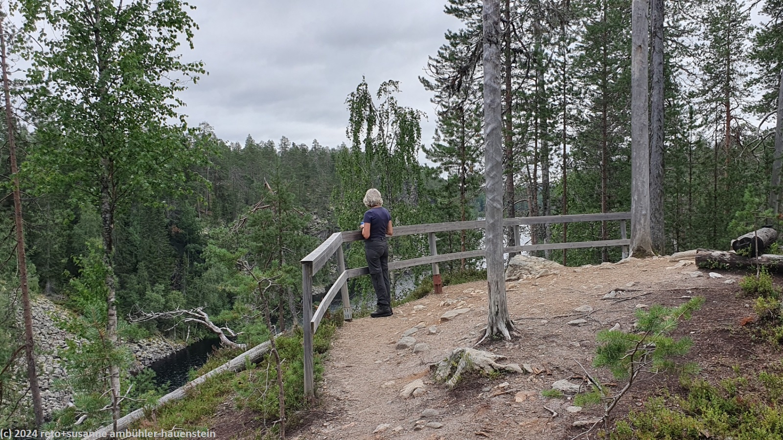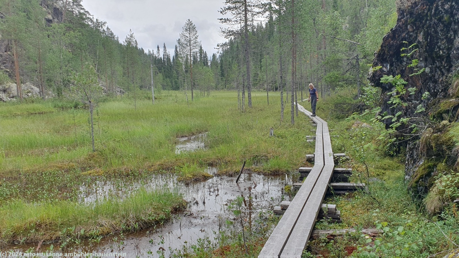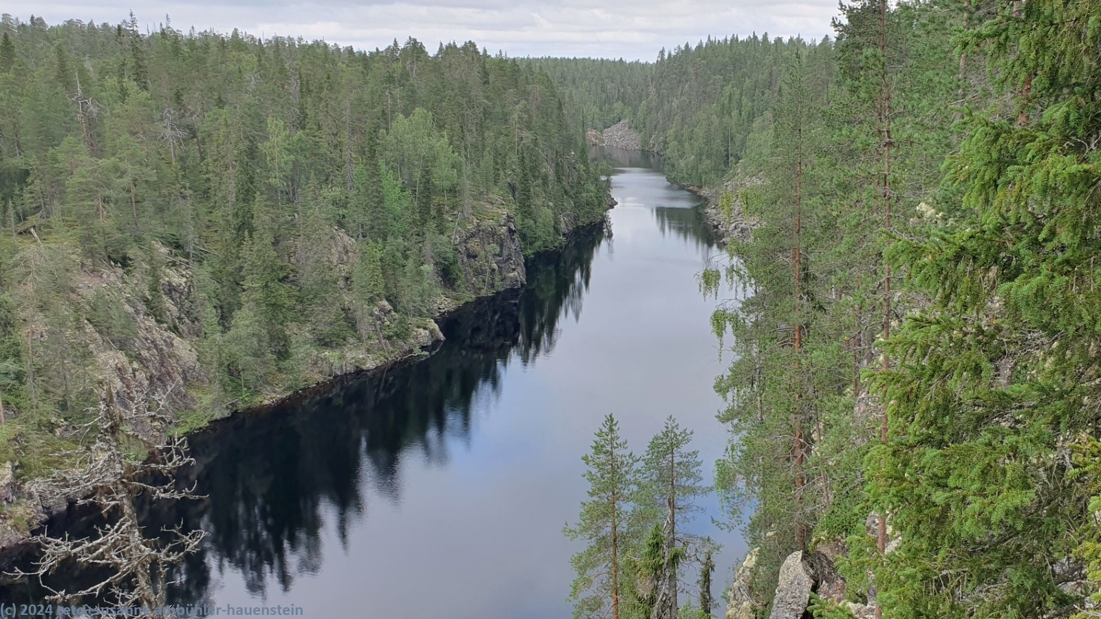 wir schlafen bis 08:45 uhr. nach dem frühstück im wagen fahren wir zum julma-ölkky, wobei wir auch heute über eine holprige, unbefestigte strasse zum ausgangspunkt unserer rundwanderung gelangen. diese führt uns um die langgezogene schlucht des julma-ölkky, ein schmaler see, der bis zu 50 meter tief sein soll. die steilen felswände überragen die wasseroberfläche nochmals um bis zu 50 meter. der schmale pfad ist ein auf und ab. wir wandern auf der ostseite bis zum nördlichen ende der schlucht. dabei kommen wir auf etwa halbem weg an der hängebrücke vorbei, welche den see überspannt, zur zeit aber geschlossen ist. es ist schon bald 13:30 uhr, als wir bei der schutzhütte ölökynperä picknicken. obwohl uns unterwegs kaum jemand begegnet ist, hat es hier erstaunlich viele menschen. auf dem rückweg zum ausgangspunkt folgen wir dem westlichen rand der schlucht. auch hier gibt es einige schöne aussichtspunkte. zurück beim parkplatz holen wir uns beim kiosk kaffee und eine zimtschnecke. während wir zum campingplatz zurück fahren, zeigt sich die sonne. wie schon gestern geniessen wir erst die sauna und dann das abendessen im freien. den abend verbringen wir am computer.