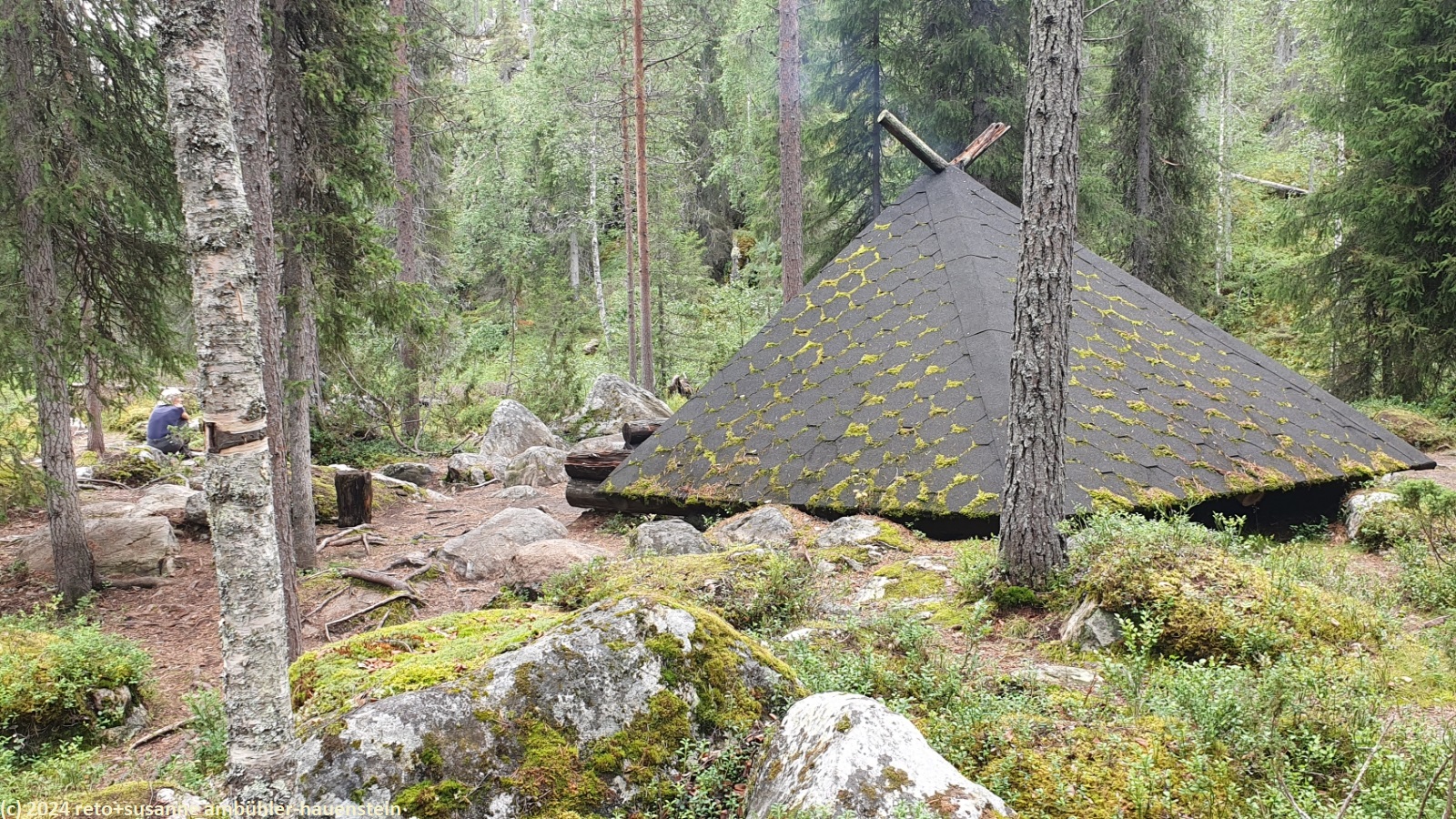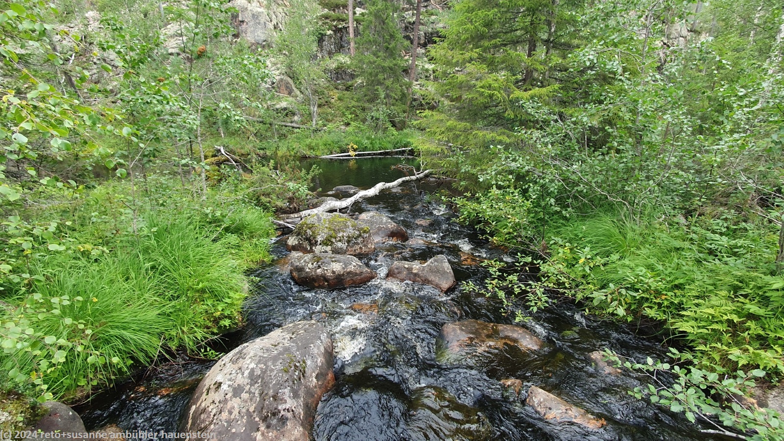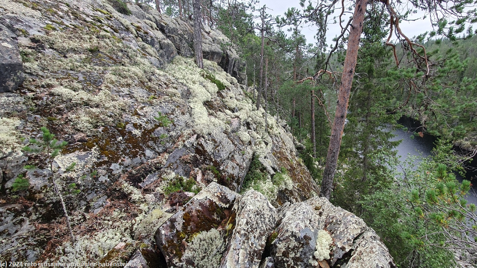 unsere heutige wanderung führt uns rund um den gleichnamigen see. obwohl "see" nicht ganz passend ist: das schmale und langgezogene gewässer befindet sich in einer schlucht, deren wände bis zu 50 meter über die wasseroberfläche hinaus ragen. der see soll noch einmal bis 50 meter tief sein. eine solche schlucht ist in finnland eher eine seltenheit. wir wandern auf der östlichen kante nordwärts. der wald ist gegenüber der gestrigen wanderung abwechslungsreicher, vielfältiger und wilder. der weg ist holpriger und manchmal geht es ziemlich steil auf- oder abwärts, wenn auch immer nur ganz kurz. auch die stege durch die sumpfgebiete fehlen nicht. auf etwa halbem weg befindet sich die spektakuläre hängebrücke, welche den canyon überspannt. diese brücke ist allerdings zur zeit wegen wartungsarbeiten geschlossen. offenbar wurde sie bei einem unwetter im juni stark beschädigt. wir wollten zwar nicht über diese brücke gehen, aber der blick von derselben wäre bestimmt eindrücklich gewesen. wir setzen unsere wanderung fort und sind kurz nach 13:20 uhr bei der schutzhütte ölökynperä. hier essen wir zu mittag. mit dieser schutzhütte haben wir den nördlichsten punkt unserer rundwanderung erreicht.