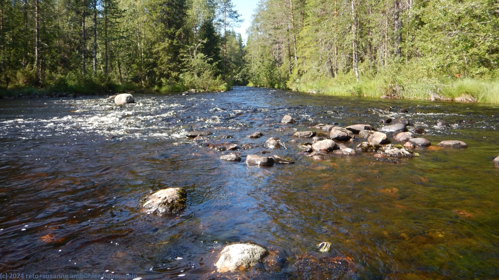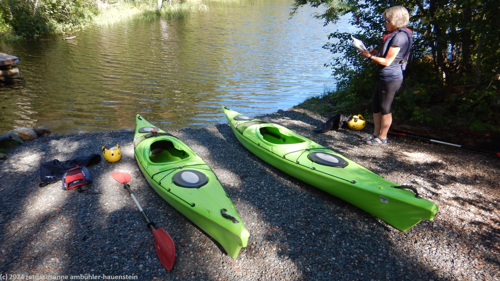 danach nehmen wie den letzten abschnitt in angriff. wieder führt eine schmale, gewundene und kaum erkennbare verbindung vom huosivirta in den hossanjärvi. wir fragen uns, ob diese verbindungen auf natürliche weise entstanden sind, oder ob da der mensch nachgeholfen hat ? ich vermute, die verbindungen sind natürlich, denn die seenkette ist eigentlich ein fluss. über den hossanjärvi gelangen wir zum ziel unserer tour. einen guten halben kilometer vom visitor center entfernt befindet sich der "hafen" des bootsverleih. wir platzieren die beiden kajaks bei den übrigen booten, danach marschieren wir zum besucherzentrum. wir deponieren paddel, spritzdecke und helm wie angewiesen im innenhof, melden uns beim schalter des verleihs zurück und fahren anschliessend zum campingplatz. obwohl wir heute eine stunde später als gestern in die sauna gehen, ist diese wiederum sehr voll. das nachtessen geniessen wir im freien. nach dem abwaschen liest susanne, ich führe die bücher nach. meine frau ist schon bald eingeschlafen, ich schlüpfe gegen 23:30 uhr ebenfalls unter die bettdecke.