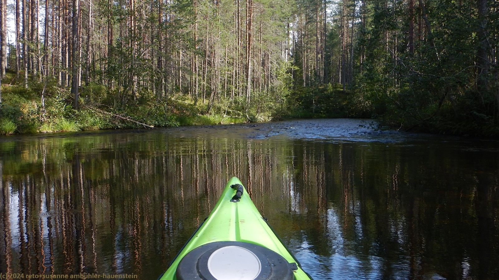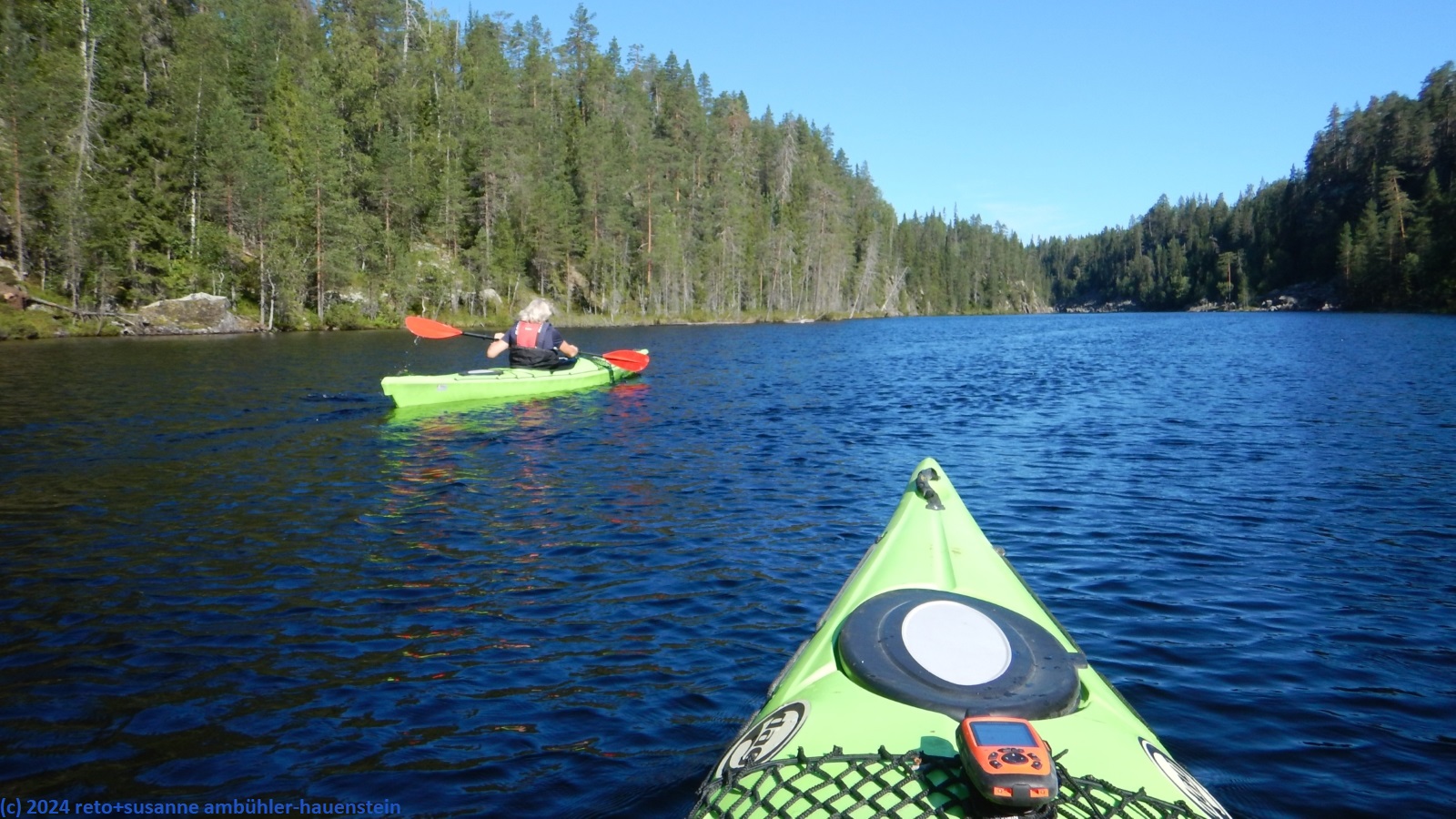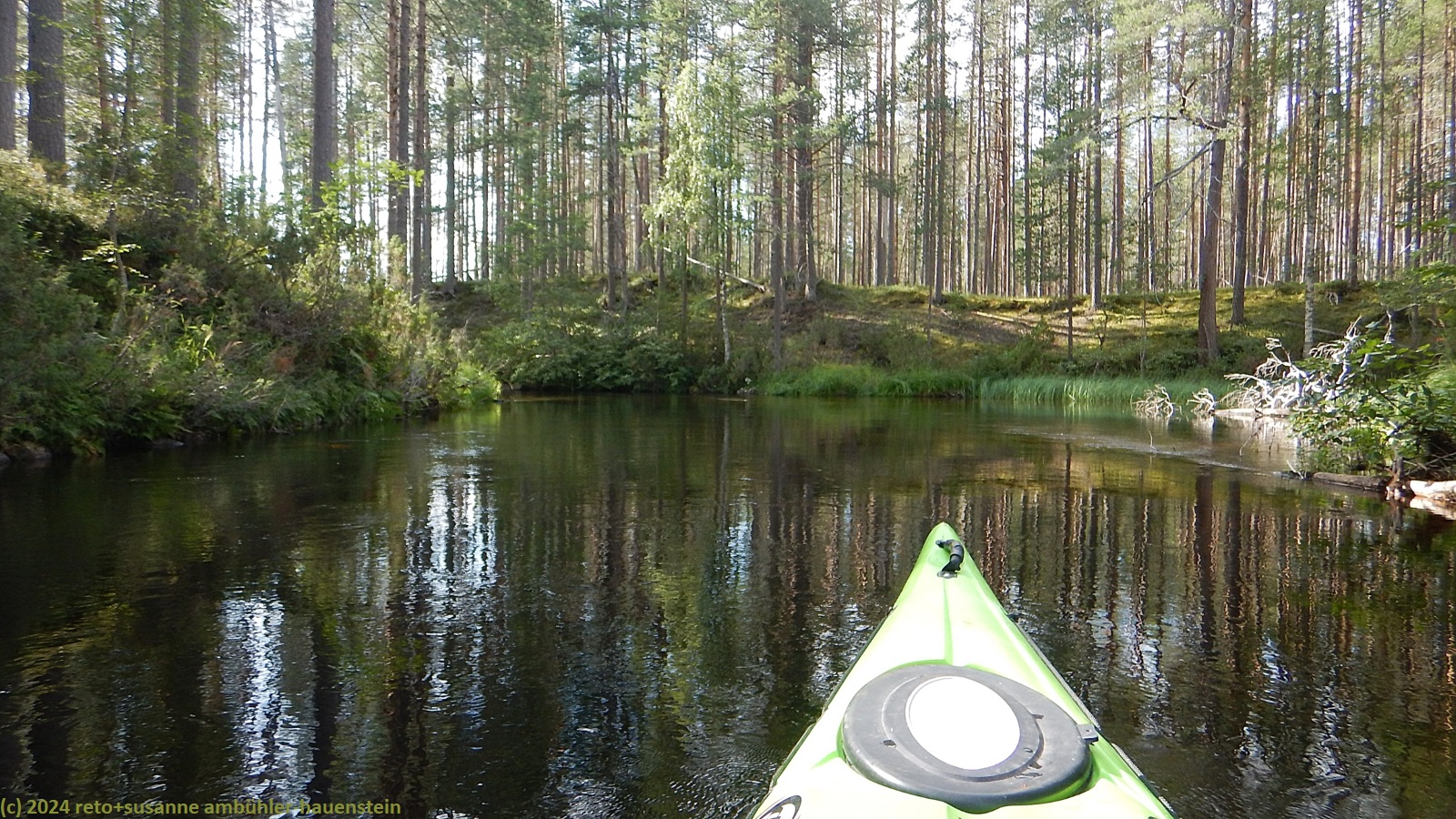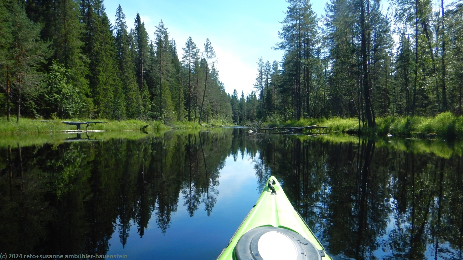 wir stehen um 07:45 uhr auf und frühstücken im freien. obwohl wir 20 minuten zu früh beim info-center sind, ist unsere ausrüstung schon bereit, so dass wir nur noch bezahlen müssen und dann gleich losfahren können. ein junger mann bringt uns zum julma-ölkky, dem ausgangspunkt unserer kajaktour. wir paddeln erst auf dem schmalen see bis zu dessen nördlichen ende und wieder zurück. nach einer kurzen pause bringen wir unsere kajaks mit hilfe der bootrutsche zum ala-ölkky hinunter. am südlichen ende des sees gelangen wir in den schmalen somerjoki. bei der schutzhütte lihapyörre braten wir unsere würste. um 14:30 uhr setzen wir unsere tour über den gleichnamigen fluss fort, müssen aber unsere boote schon bald ein kurzes stück tragen, weil umgestürzte bäume das durchkommen behindern. nun paddeln wir erst über den etwas grösseren laukkujärvi und dann über den langgezogenen talasjärvi. danach folgen mehrere, zum teil ziemlich versteckte durchfahrten vom einen zum nächsten see. meine routenplanung passt haargenau, wir finden die schmalen wasserstrassen jeweils auf anhieb. bei der schutzhütte mit rastplatz am westlichen ende des huosiusjärvi machen wir nochmals einen kurzen halt. anschliessend geht es durch eine kaum erkennbare verbindung zum hossanjärvi und über diesen zum ziel in der nähe des besucherzentrum. wir deponieren die kajaks am strand und retournieren die übrige ausrüstung beim info-center. zurück auf dem campingplatz geniessen wir einmal mehr die sauna und anschliessend das abendessen im freien.
