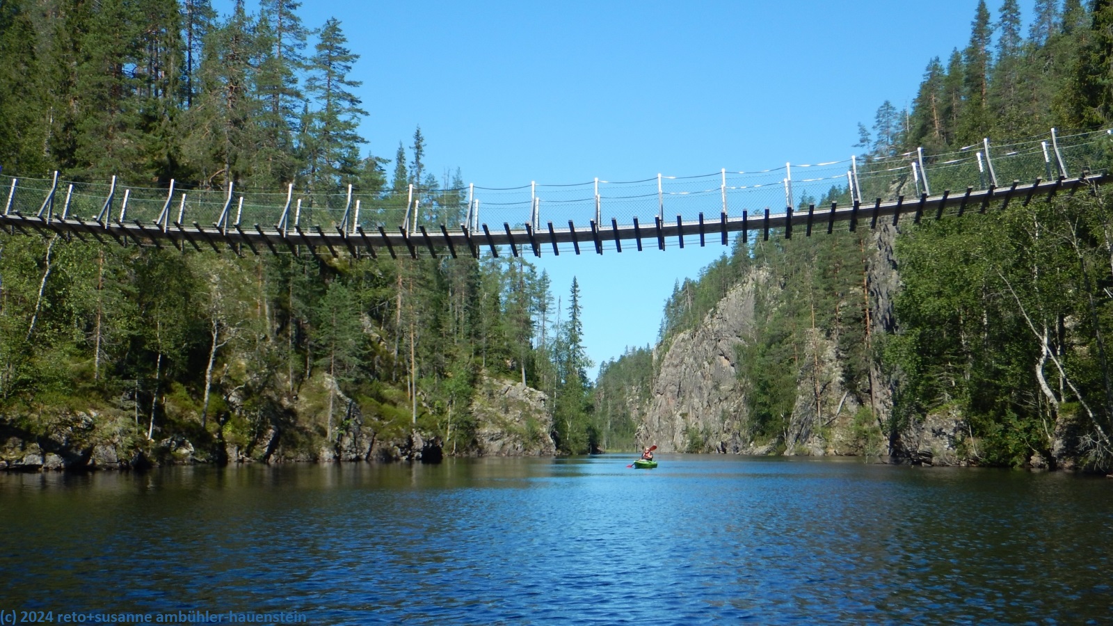 unser handy weckt uns um 07:45 uhr. es bahnt sich ein ähnlich sonniger tag an wie gestern. während wir im freien frühstücken, ist es aber noch ziemlich kühl. kurz vor 09:30 uhr machen wir uns auf den weg zum info-center des hossa nationalpark. die fahrt dauert keine zehn minuten. obwohl wir zwanzig minuten zu früh sind, steht der wagen mit den kajaks schon bereit und nachdem wir die bezahlung erledigt haben, geht es sofort los. ein junger mann bringt uns zum julma-ölkky. hier haben wir vor zwei tagen schon parkiert, als wir um den canyon herum gewandert sind. nun lassen wir unsere kajak in den see in dieser schlucht. das wasser ist sehr ruhig. wäre da nicht das motorboot, welches auf diesem see rundfahrten macht, so wäre es absolut ruhig. der see liegt in einer schmalen schlucht mit teilweise fast senkrechten felswänden. an einer solchen soll es 4000 jahre alte felszeichnungen haben. leider wissen wir nicht genau, wo sich diese befinden. wir schauen da und dort, können aber die zeichnungen nicht finden. gemäss den bildern auf der website des nationalparks sind die zeichnungen nicht wirklich offensichtlich. wir paddeln unter der hängebrücke hindurch und erreichen nach 3 km das ende des sees. hier wenden wir und paddeln zurück zum startpunkt.