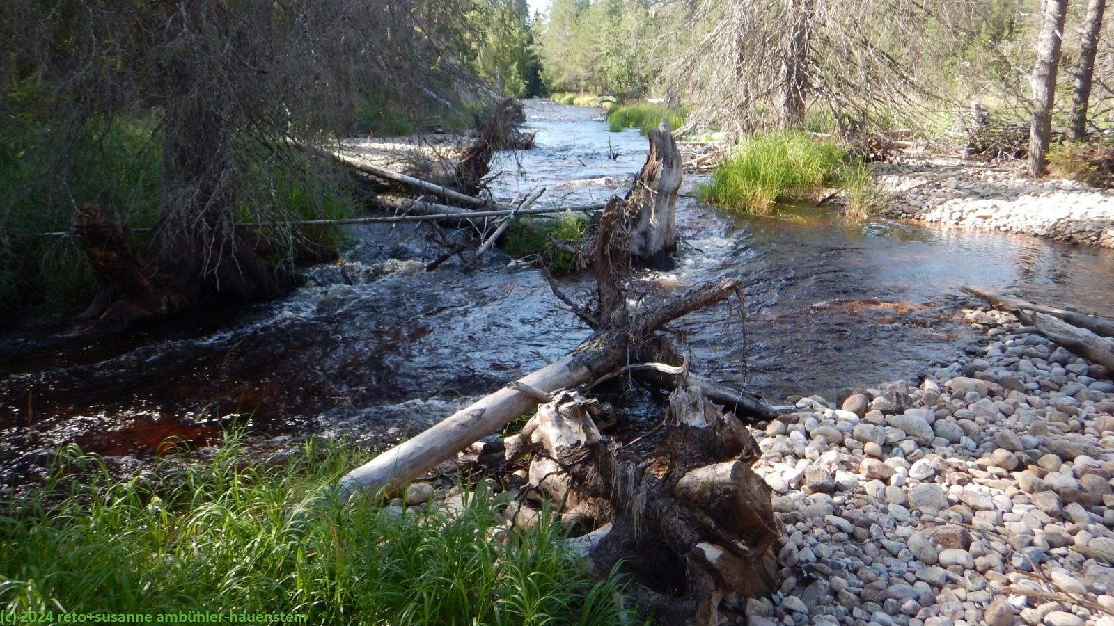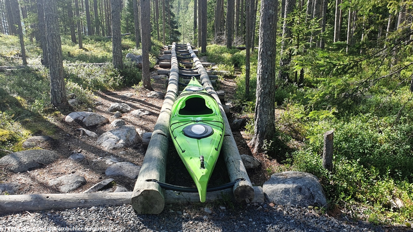 um 14:30 uhr setzen wir unsere tour fort. gegen ende der durchfahrt liegen mehrere umgestürzte bäume im wasser. der fahrer des kajakverleihs hatte uns informiert, dass wir an dieser stelle die boote ein stück weit tragen müssen. der sturm hat nicht nur bäume umgeworfen, sondern durch erdrutsche den flusslauf total verändert. so bleibt uns tatsächlich nichts anderes übrig, als die kajaks vielleicht 30 meter weit zur tragen. dann können wir sie wieder ins wasser bringen. der einstieg ist allerdings etwas trickreich, weil dass wasser sich in mehrere läufe aufgeteilt hat. ich schaffe es, erst susanne durch einen engpass und über einen kleinen wasserfall richtung see zu schieben und anschliessend selber durch das hindernis zu kommen. nun sind wir im laukkujärvi. wir folgen dessen südwestlichen ufer und sind wenig später im langgezogenen talasjärvi. für etwa 1.5 km paddeln wir über relativ offenes gewässer. am himmel sind vorübergehend einige schleierwolken aufgezogen, aber die sonne ist stets sichtbar. ein bisschen wind macht die temperatur sehr erträglich. wir wechseln nun in den puukkojärvi. bei suottavirta gibt es eine versteckte einfahrt in die verbindung zum saari-hoilua. ich habe gestern die route auf meinem navi einprogrammiert, so finden wir die durchfahrten immer auf anhieb. auf dem saari-hoilua paddeln wir um eine halbinsel, danach geht es durch eine weitere schmale passage in den hakolampi. diese kajaktour ist sehr abwechslungsreich, die schmalen durchfahrten mit ihren mini-rapids sind harmlos, aber machen die sache spannend. manchmal ist der wasserstand etwas niedrig, gelegentlicher kontakt mit steinen lässt sich nicht vermeiden. ich schaffe es mehrmals, mein boot auf einen stein zu setzen und muss kämpfen, um es wieder frei zu bekommen. da susanne stets hinter mir her paddelt, hat sie den vorteil, dass wenn ich festsitze, sie eine bessere route wählen kann. noch einmal folgt eine längere, schmale passage, dann erreichen wir das westliche ende des huosiusjärvi. hier hat es wiederum eine schutzhütte mit rastplatz. wir machen 20 minuten pause, trinken einen schluck tee und essen ein stück schokolade.