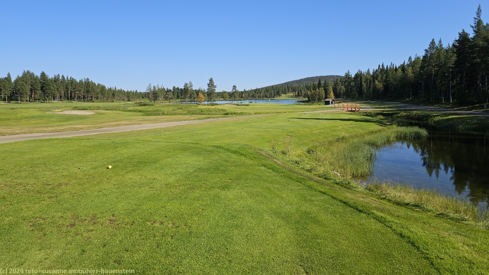 hier erreicht uns die nachricht, dass die akkus definitiv nicht mehr auffindbar seien. das ist sehr enttäuschend, hatte man uns doch versprochen, sie bis ende august aufzubewahren. (anmerkung: nach einigem hin und her vergütet die firma, welche für die gepäckabfertigung an den finnischen flughäfen zuständig ist, einen ordentlichen betrag an die unauffindbaren akkus, was wir als grosszügiges entgegenkommen betrachten.) schliesslichen nehmen wir den wanderweg richtung golfplatz unter die füsse. wir wandern auf einem angenehm weichen waldweg und geniessen den schatten. beim skilift draivi hat es eine überraschend grosse baustelle. hier entsteht ein sessellift. die talstation und die masten stehen bereits, die garage für die sessel ist noch im bau. wir setzen uns auf die terrasse des restaurants und trinken etwas. dabei haben wir einen tollen blick auf den hübsch angelegten golfplatz.