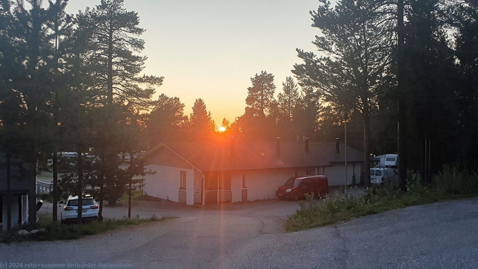 wir stehen gegen 08:45 uhr auf. der himmel ist wolkenlos, es ist deutlich wärmer als in hossa. entsprechend frühstücken wir im t-shirt und kurzen hosen im freien. da wir noch nichts vom flughafen kittilä gehört haben, entschliessen wir uns, die schmutzige wäsche zu waschen. während die maschine wäscht, spazieren wir durch den ort und kaufen im supermarkt einige lebensmittel. zurück auf dem campingplatz kümmert sich susanne um unsere wäsche, ich arbeite am computer. gegen mittag unterhalte ich mich mit hermann via skype. danach essen wir eine kleinigkeit. während wir beim frühstücken noch versucht haben, ein bisschen morgensonne zu erwischen, suchen wir nun schatten. die temperatur steigt im laufe des nachmittages bis auf 25°C. wir machen einen etwas ausgedehnteren spaziergang als am morgen. zuerst setzen wir uns aber ins cafe an der hauptgasse und geniessen kaffee und kuchen. plötzlich taucht ein mächtiges rentier auf. es stolziert unbekümmert mitten durch den ort.