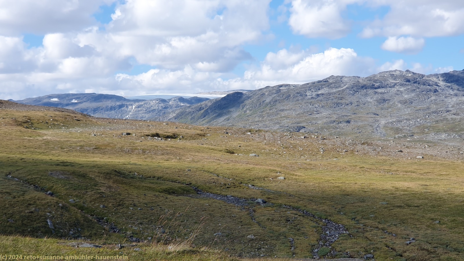 die nacht war sehr ruhig. ich habe bestens geschlafen, meine frau etwas weniger gut, da sie von kopfschmerzen geplagt wird. als wir um 07:30 uhr aufstehen, scheint die sonne, der himmel ist leicht bewölkt. allerdings bläst ein kräftiger südwind, dieser dürfte die ursache für die kopfschmerzen sein. wir frühstücken in der küche, danach wischen wir um unseren tisch. nachdem wir unsere rucksäcke gepackt haben, machen wir auch in unserem zimmer sauber. gegen 9 uhr brechen wir auf. um die fjällstube herrscht reger betrieb. heute begegnet uns wohl der grösste teil der fjällräven classic teilnehmenden. wir überqueren die hängebrücke südlich der stuga, danach wandern wir bei herrlichem wetter durch eine fantastisch schöne landschaft. auch die heutige strecke sind wir schon einmal gewandert, siehe tagebuch vom 07-aug-2017. damals haben wir allerdings unser heutiges tagesziel - die tjäktjastuga - ausgelassen und sind direkt zu den sälkastugorna durchgewandert. dieses jahr nehmen wir es gemütlicher und übernachten in jeder stuga entlang der route. der kungsleden folgt dem aliseatnu. dieser fliesst durch ein breites tal. im westen sehen wir zwischen den gipfel kleine eisfelder. im laufe des aufstieges richtung tjäktjapass müssen wir mehrmals kleinere flüsse durchqueren. die teilnehmenden des fjällräven classic kommen uns nun fast ununterbrochen entgegen. gemäss aussage des hütenwartes bei der alesjaure stuga sind es 1800 teilnehmende. meistens laufen sie in gruppen, manchmal kommt uns auch eine einzelne person entgegen. es hat auffallend viele asiaten, insgesamt sind es teilnehmende aus 24 verschiedenen ländern. auffallend ist aber auch, dass absolut kein abfall herum liegt. die disziplin der teilnehmenden ist diesbezüglich enorm. ebenso bezüglich des kreuzens auf den bohlen. fast alle warten oder weichen aus, wenn wir uns auf einem steg kreuzen. kurz nach 12:30 uhr sind wir kurz vor einem checkpoint des fjällräven classic. in einer kleinen mulde essen wir zu mittag. hier sind wir ein bisschen vor dem wind geschützt.