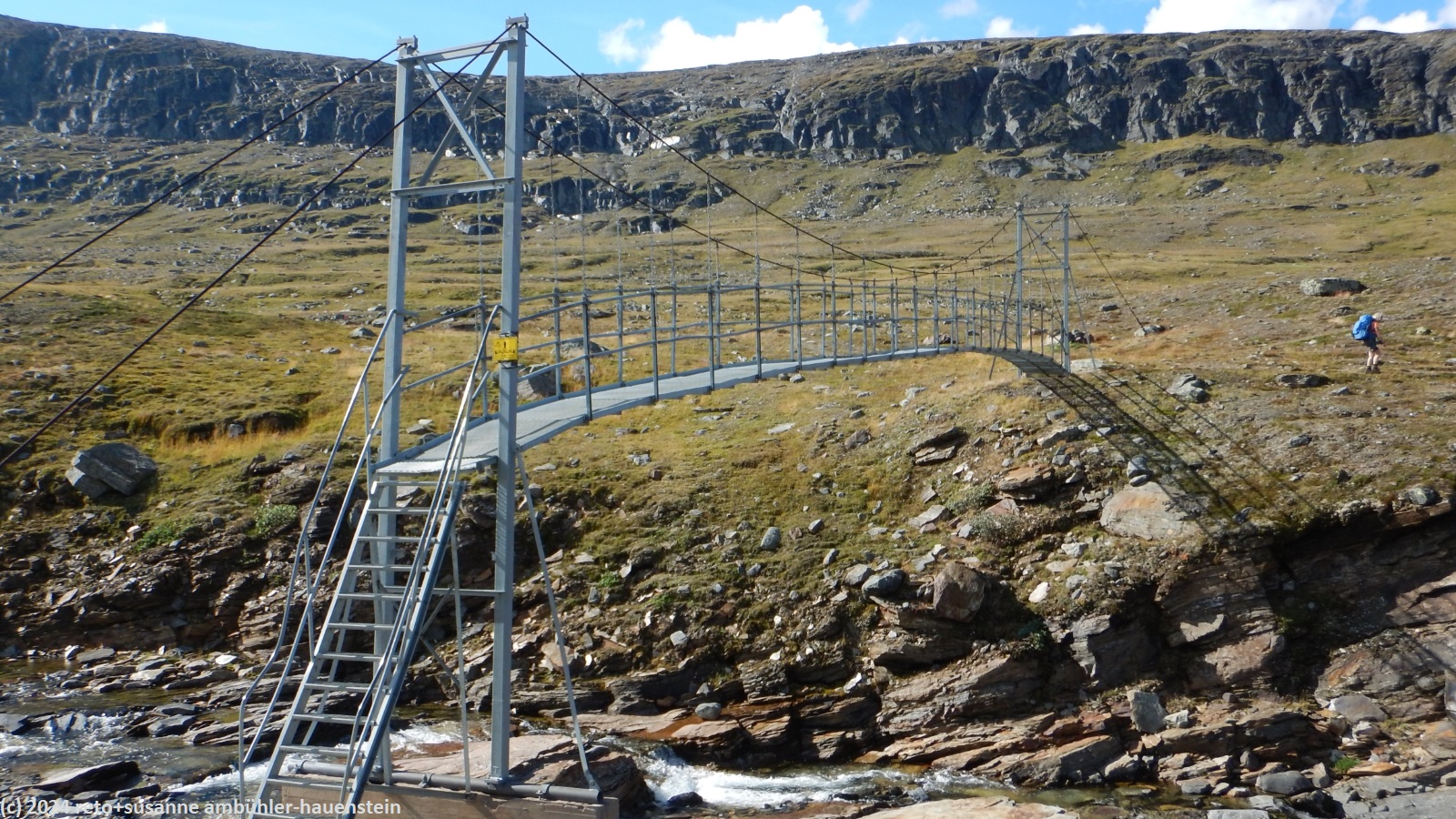 35 minuten später brechen wir wieder auf und passieren den checkpoint. hier können sich die teilnehmenden verpflegen und wohl auch pflegen lassen. unmittelbar nach dem checkpoint müssen wir den breiten zufluss sielmmánjira des aliseatnu durchqueren. ein crew member des fjällräven classic zeigt uns, wo der fluss am besten zu durchqueren ist. es gelingt uns, trockenen fusses ans andere ufer zu kommen, das war ein guter tipp. nun sind es noch zwei kilometer bis zum tagesziel. längst sehen wir die stuga auf der anderen seite des tals. der ceavccanjira hat eine tiefe schlucht ins gelände geschnitten. eine hängebrücke überspannt die schlucht. sie befindet sich etwas südlich der stuga, wir gehen deshalb an letzterer vorbei. auf der anderen talseite geht es dann einige hundert meter nordwärts zurück zur stuga. wir erreichen diese gegen 14 uhr.