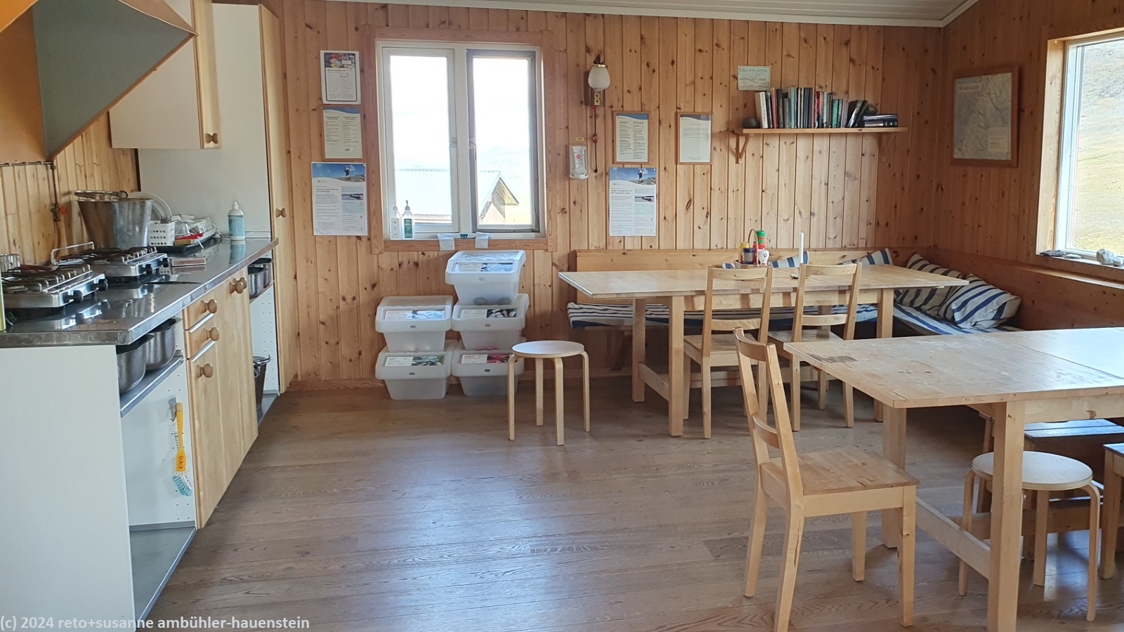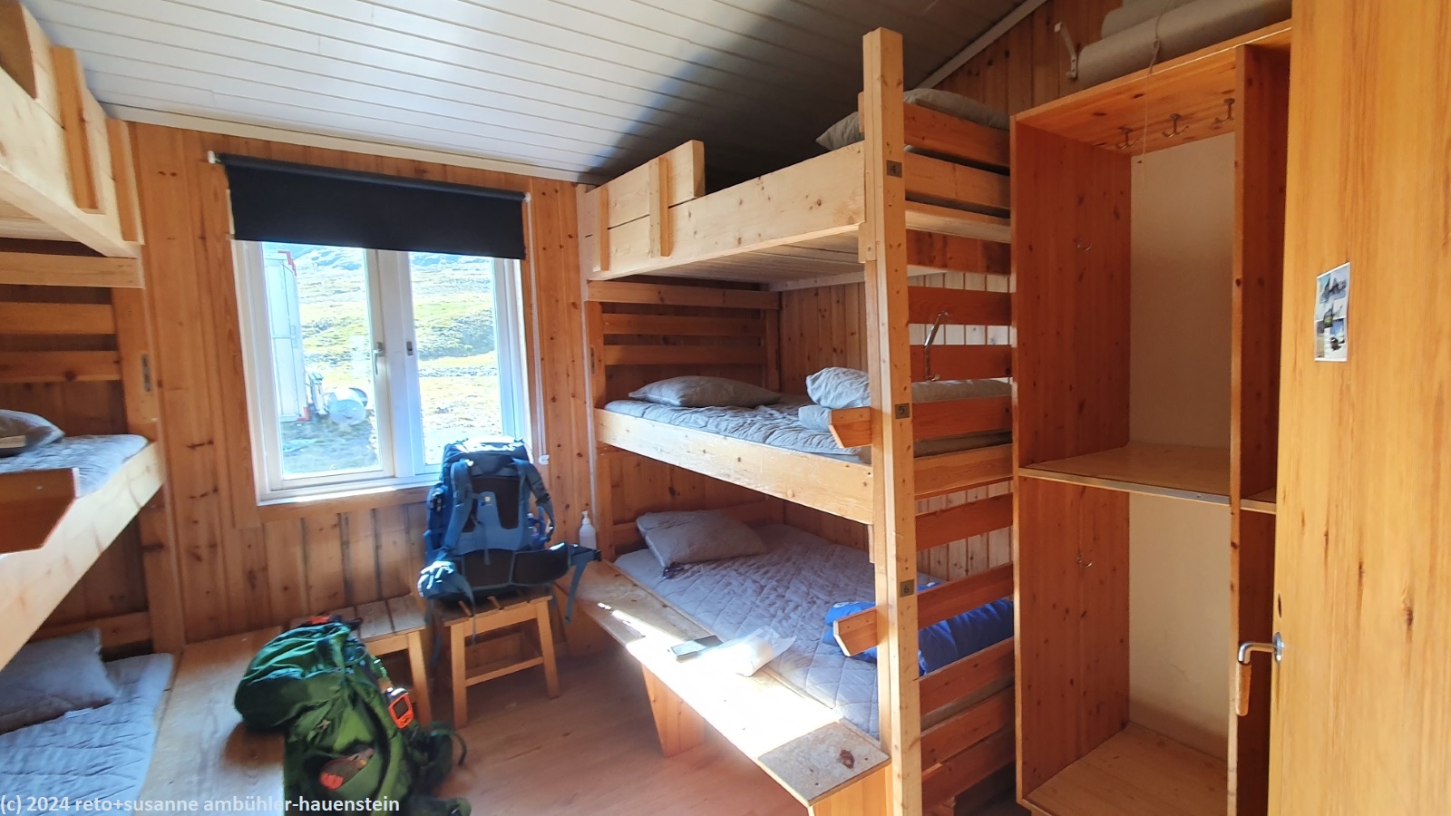an der unterkunft hängt ein zettel. auf diesem steht, dass der hüttenwart ab 16 uhr wieder vor ort sein werde. zudem sind die zimmer zugeteilt. wir haben zimmer 1. in diesem hat es zwei dreistöckige etagenbetter. gemäss plan haben wir dieses zimmer für uns alleine. wir sind allerdings skeptisch, dass das so bleibt, sind doch auch in unserer richtung ziemlich viele leute unterwegs. ausserdem ist die stuga viel kleiner als dir vor und hinter uns. mit zwanzig betten hat sie etwa ein viertel der kapazität der anderen hütten. da sich die stuga auf der anderen seite der schlucht befindet, liegt sie immerhin etwas abseits der route des fjällräven classic.